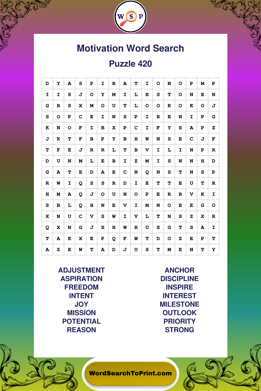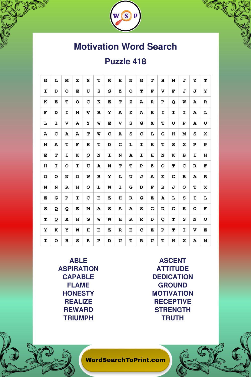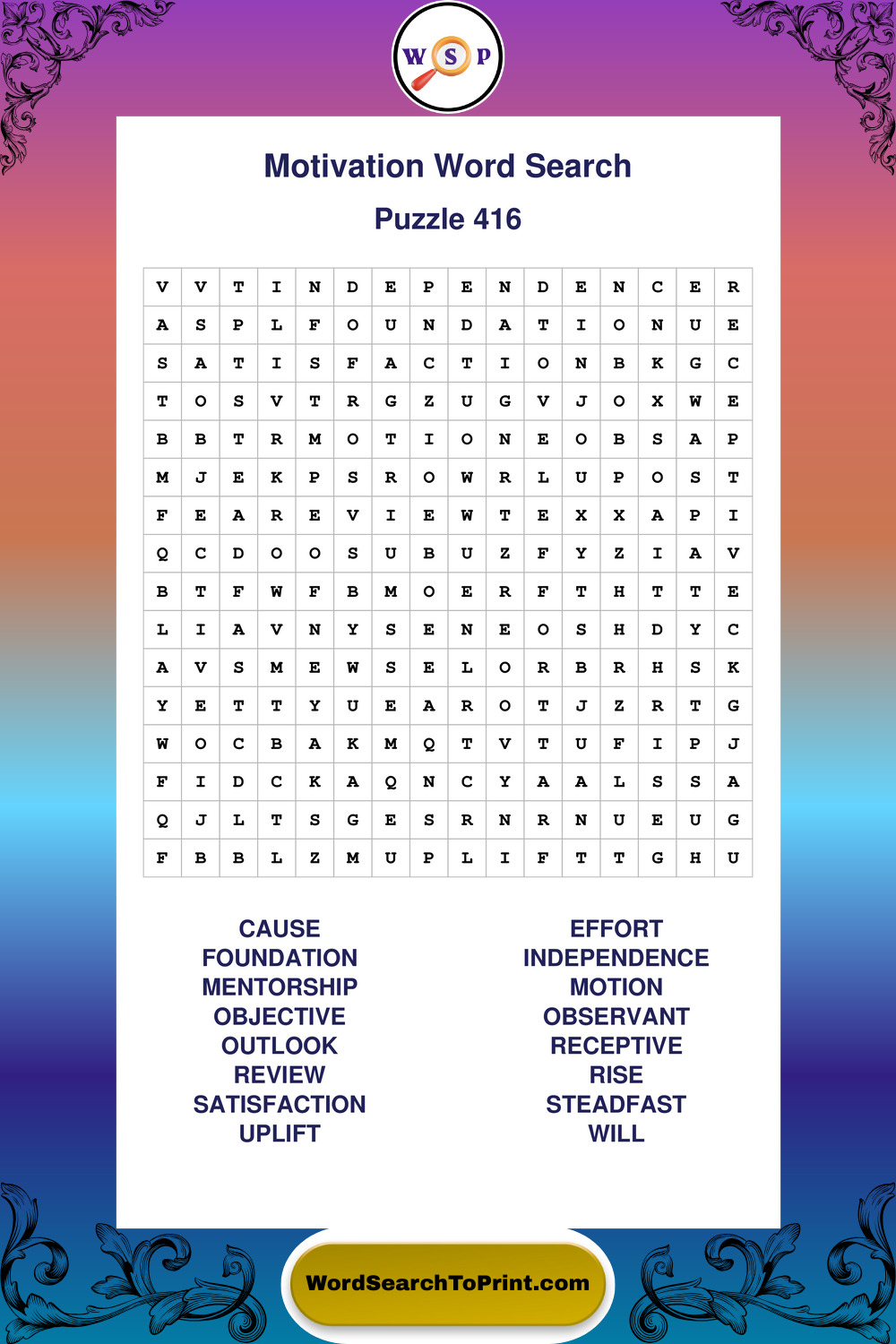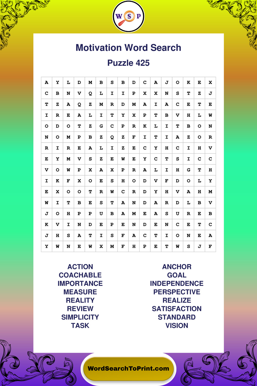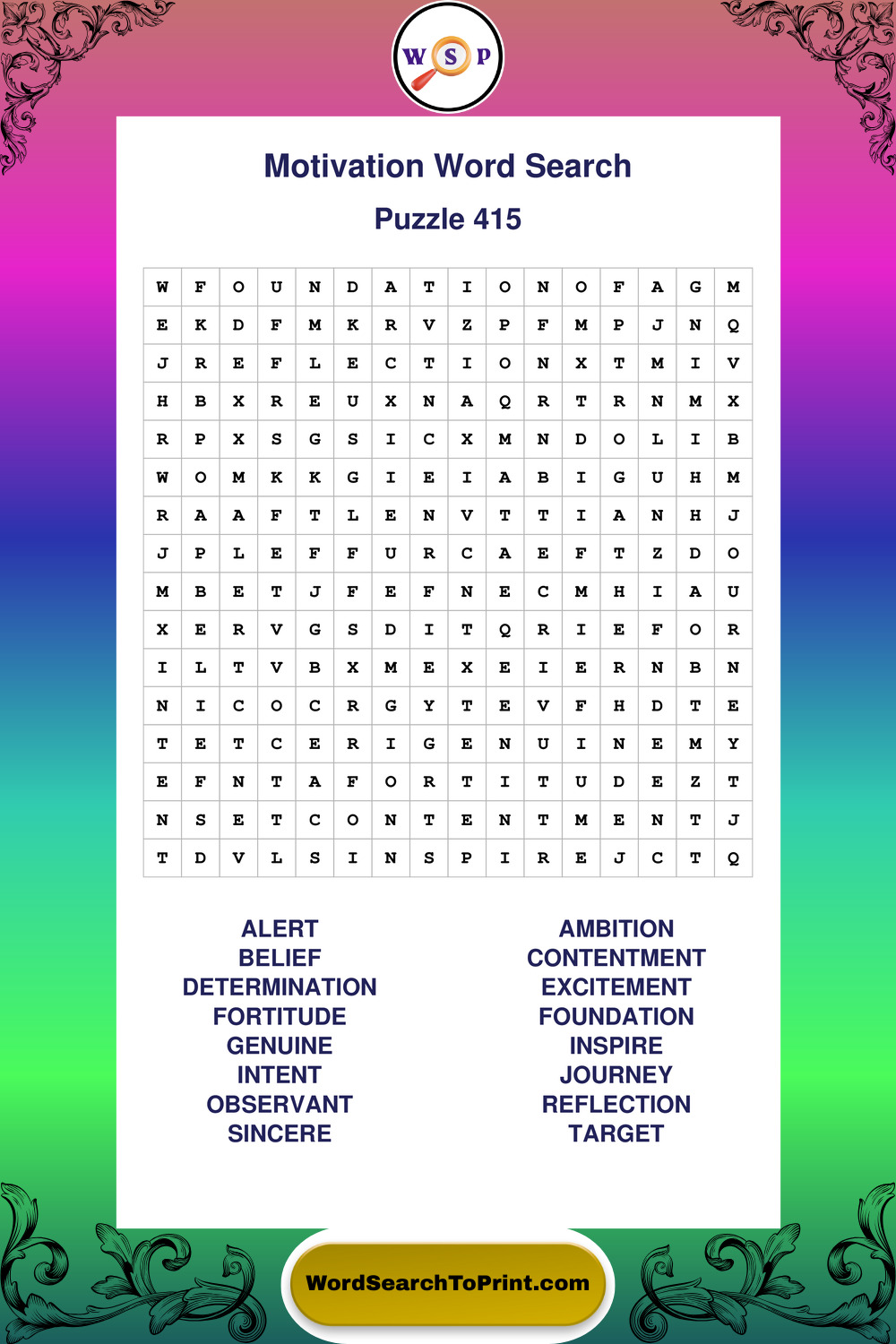 These puzzles focus on motivation, goal setting, life lessons, inspiration, and personal development concepts. They offer a structured and engaging way to explore this topic while strengthening concentration and vocabulary recognition. You may also enjoy our Inspiration word search puzzles and Wisdom word search puzzles.