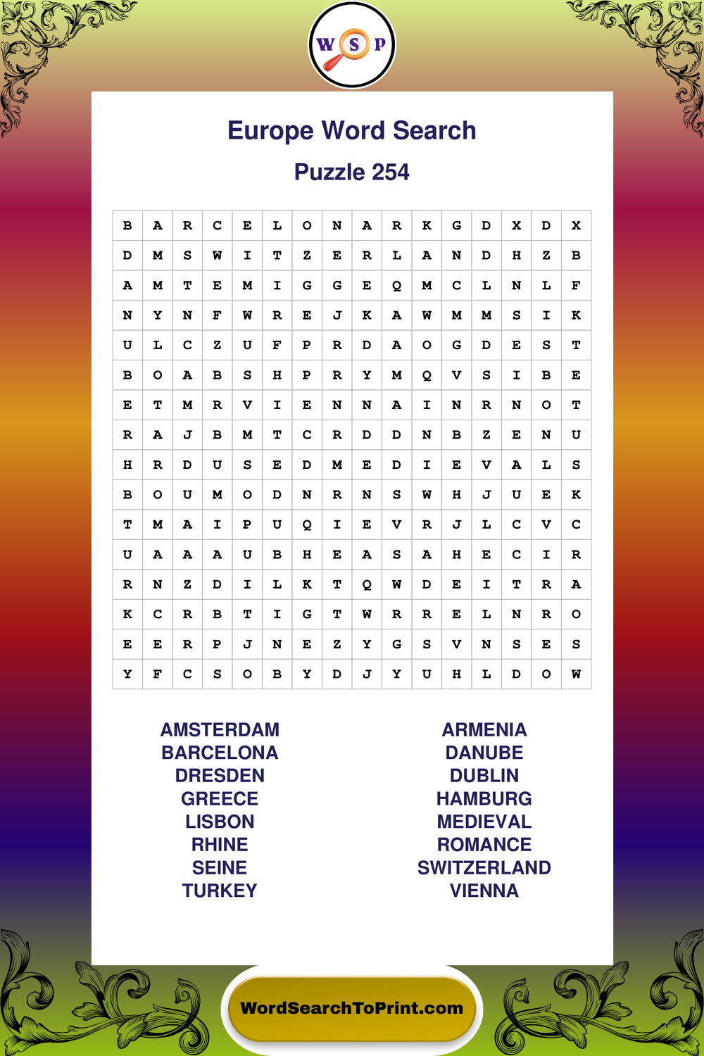 Printable Europe Wordsearch Puzzles