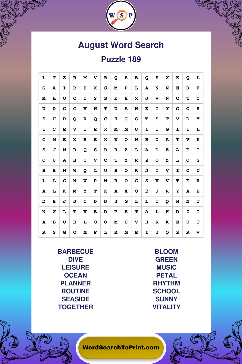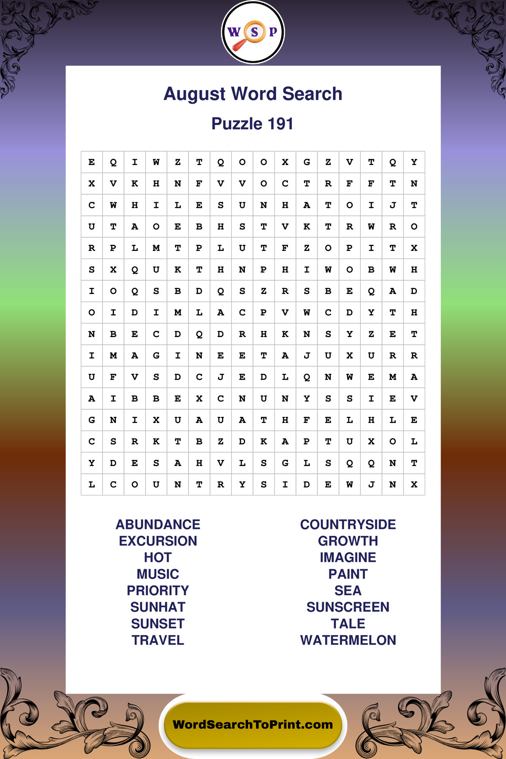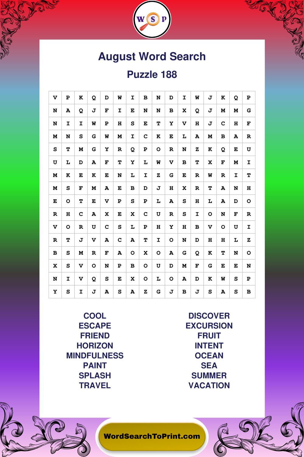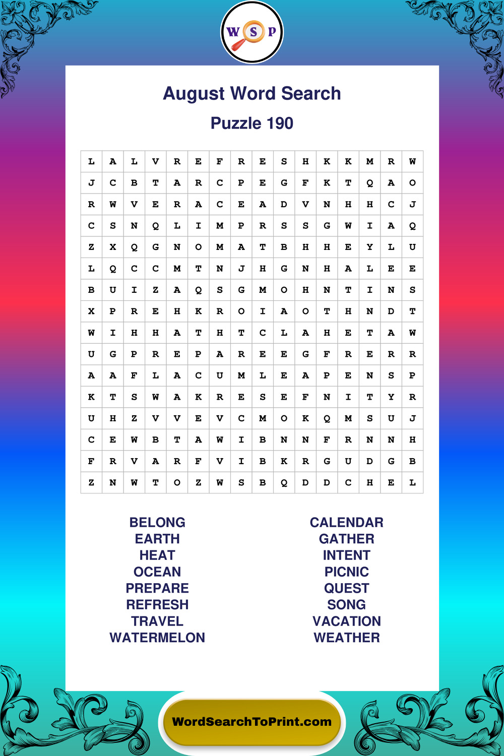This page features large print August wordsearches made for stress-free reading and relaxed concentration.