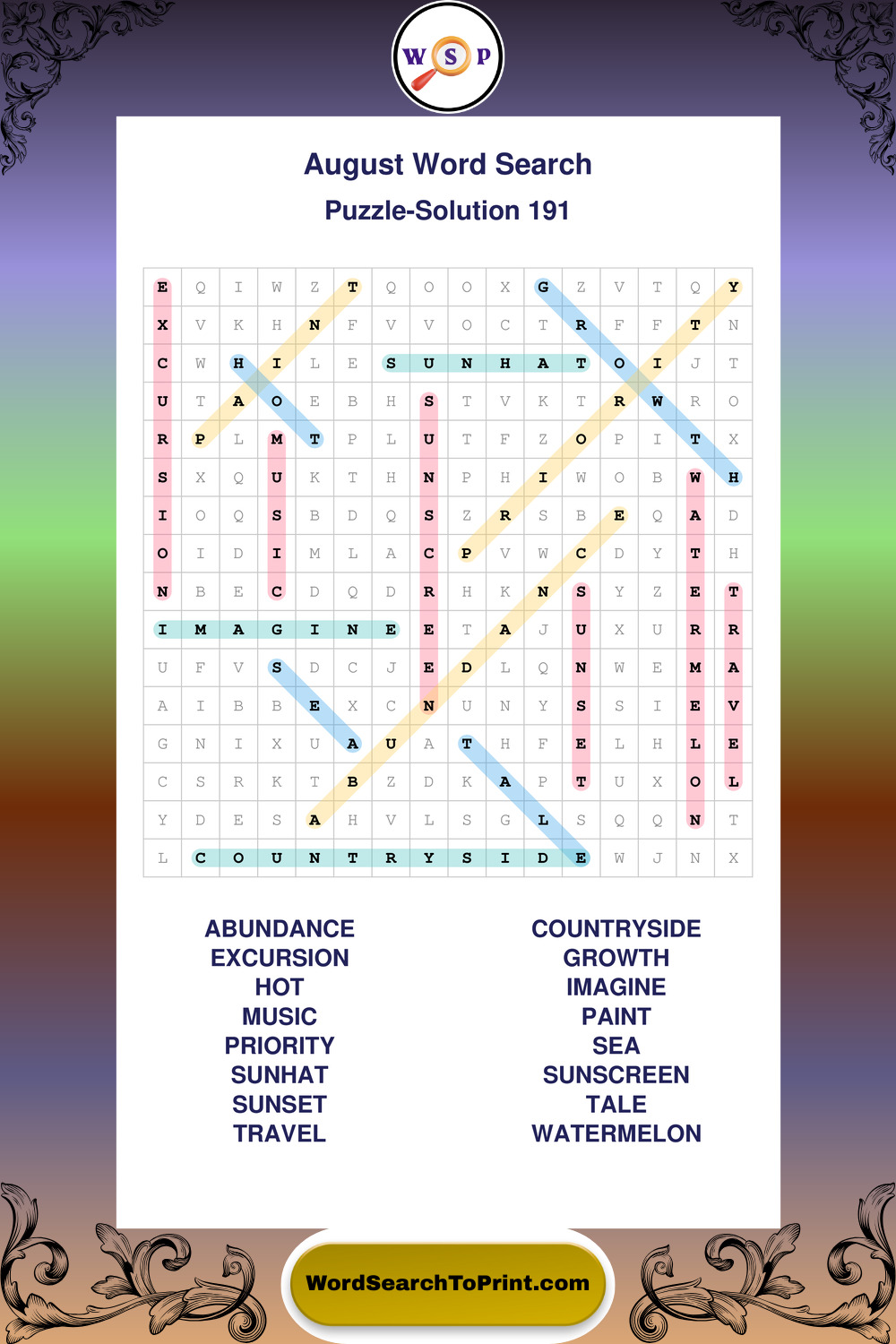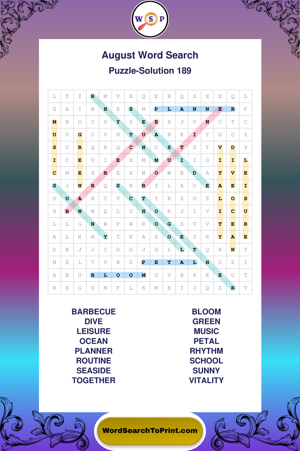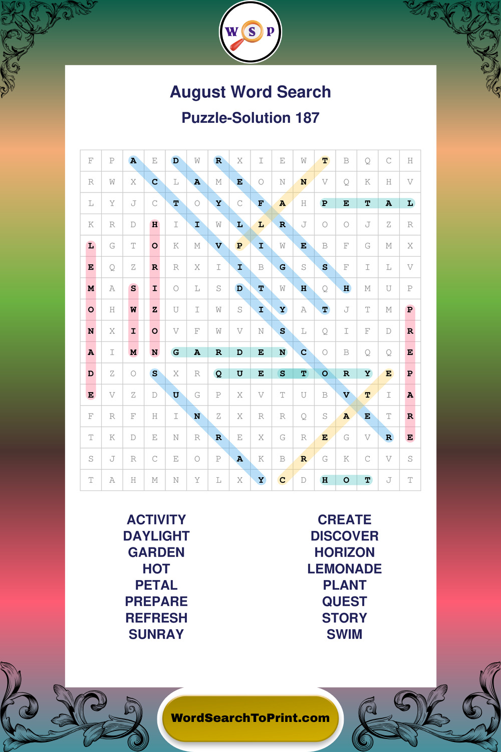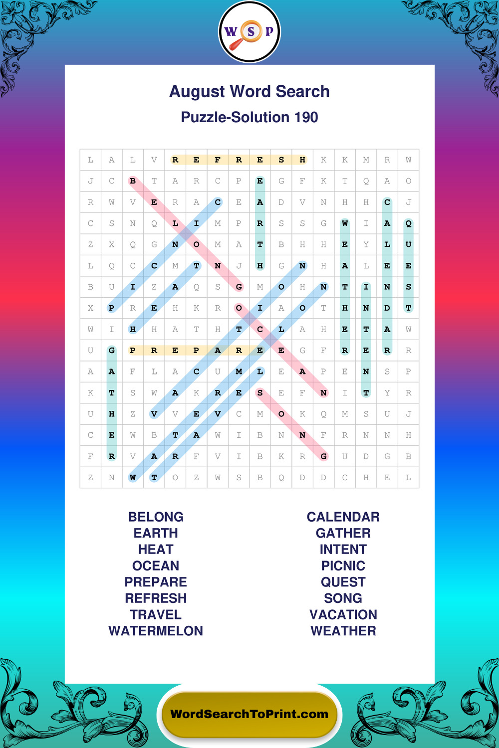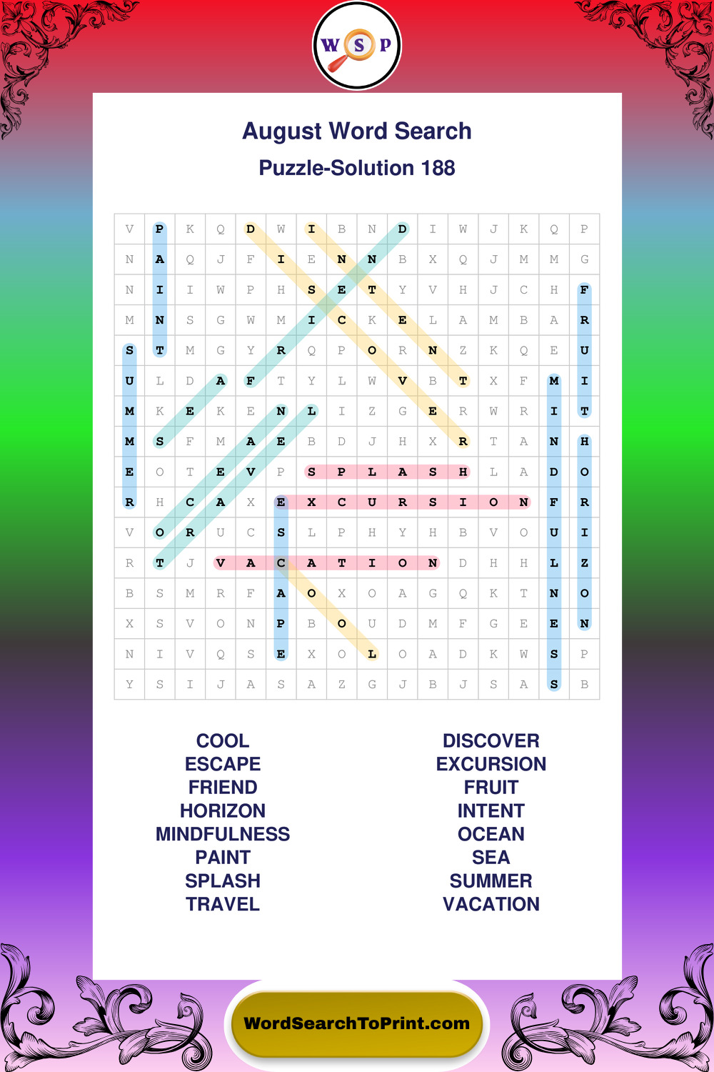 This page features large print August wordsearches made for stress-free reading and relaxed concentration.