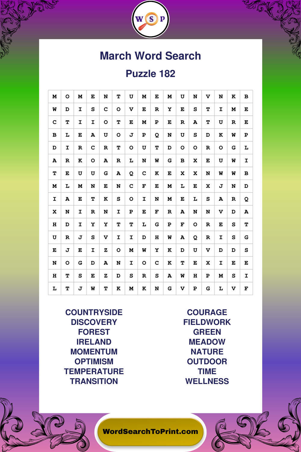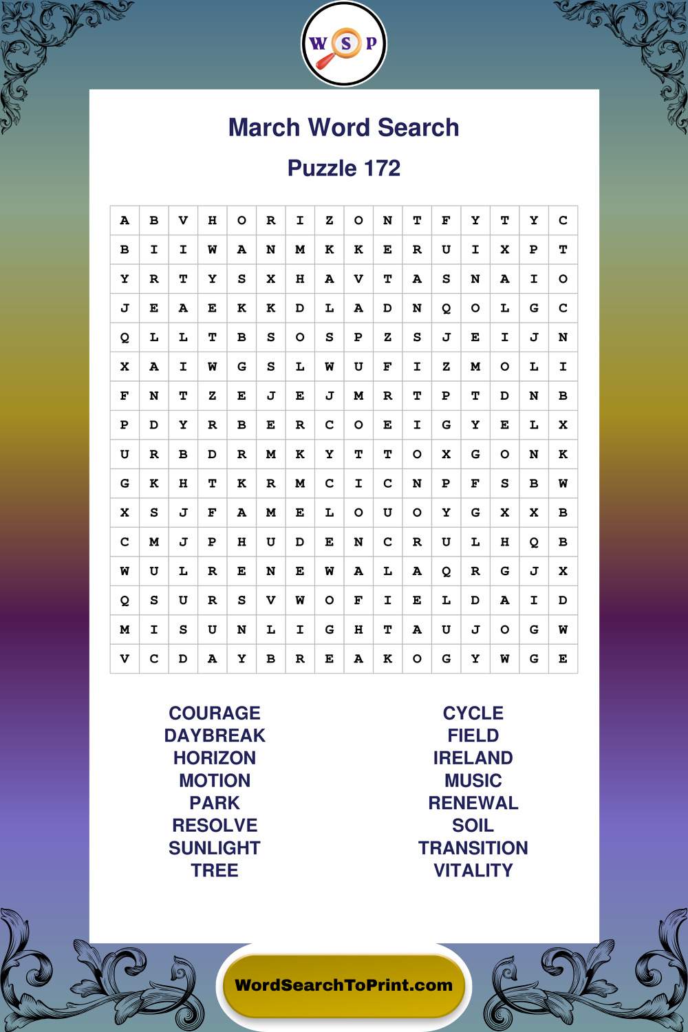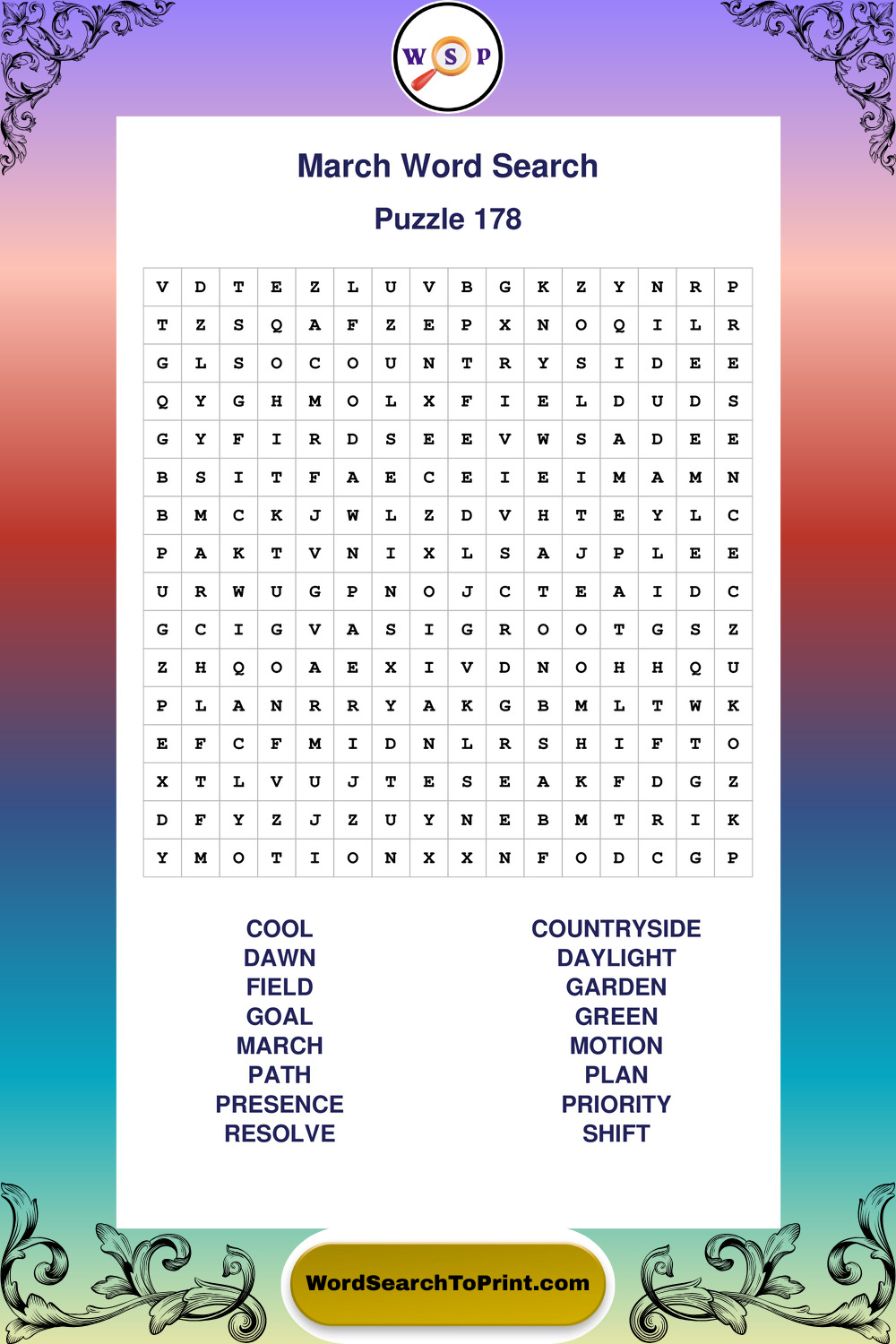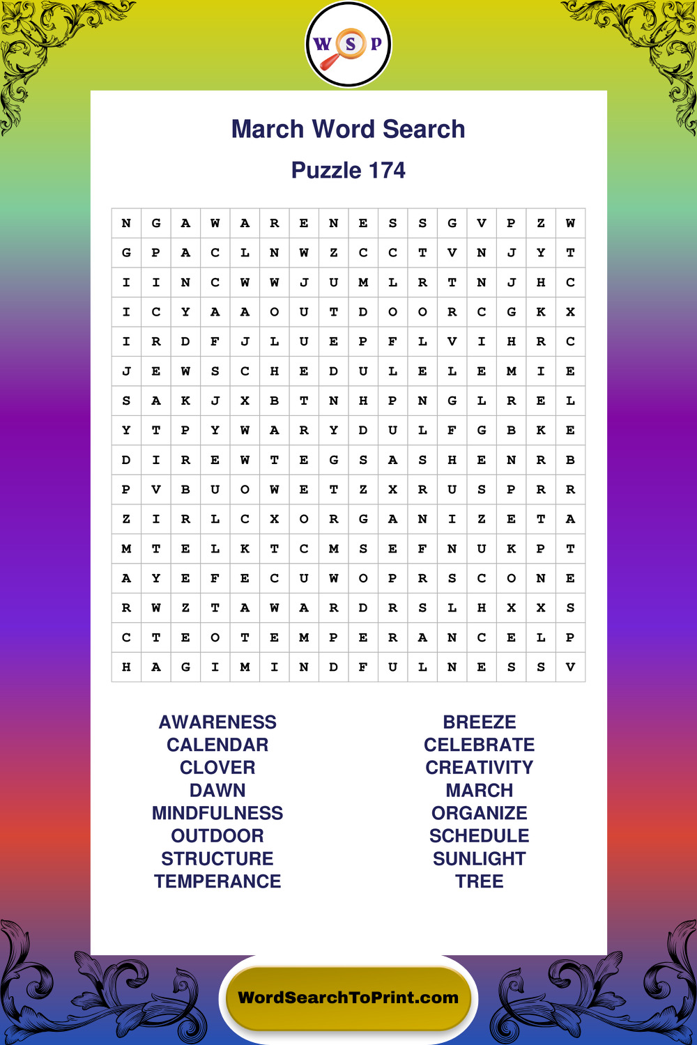 A relaxing collection of large print March wordsearches designed for comfortable solving and steady focus.
