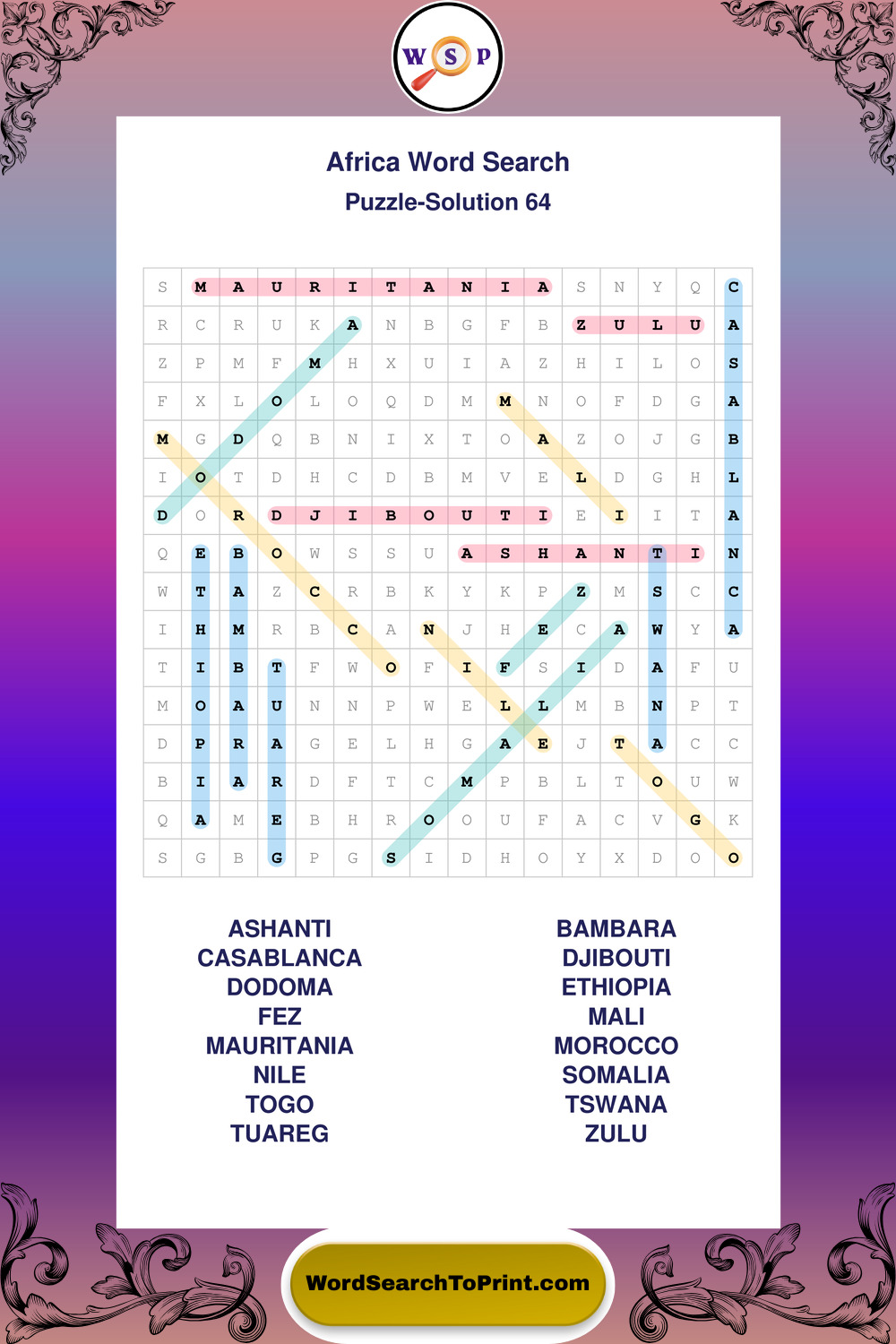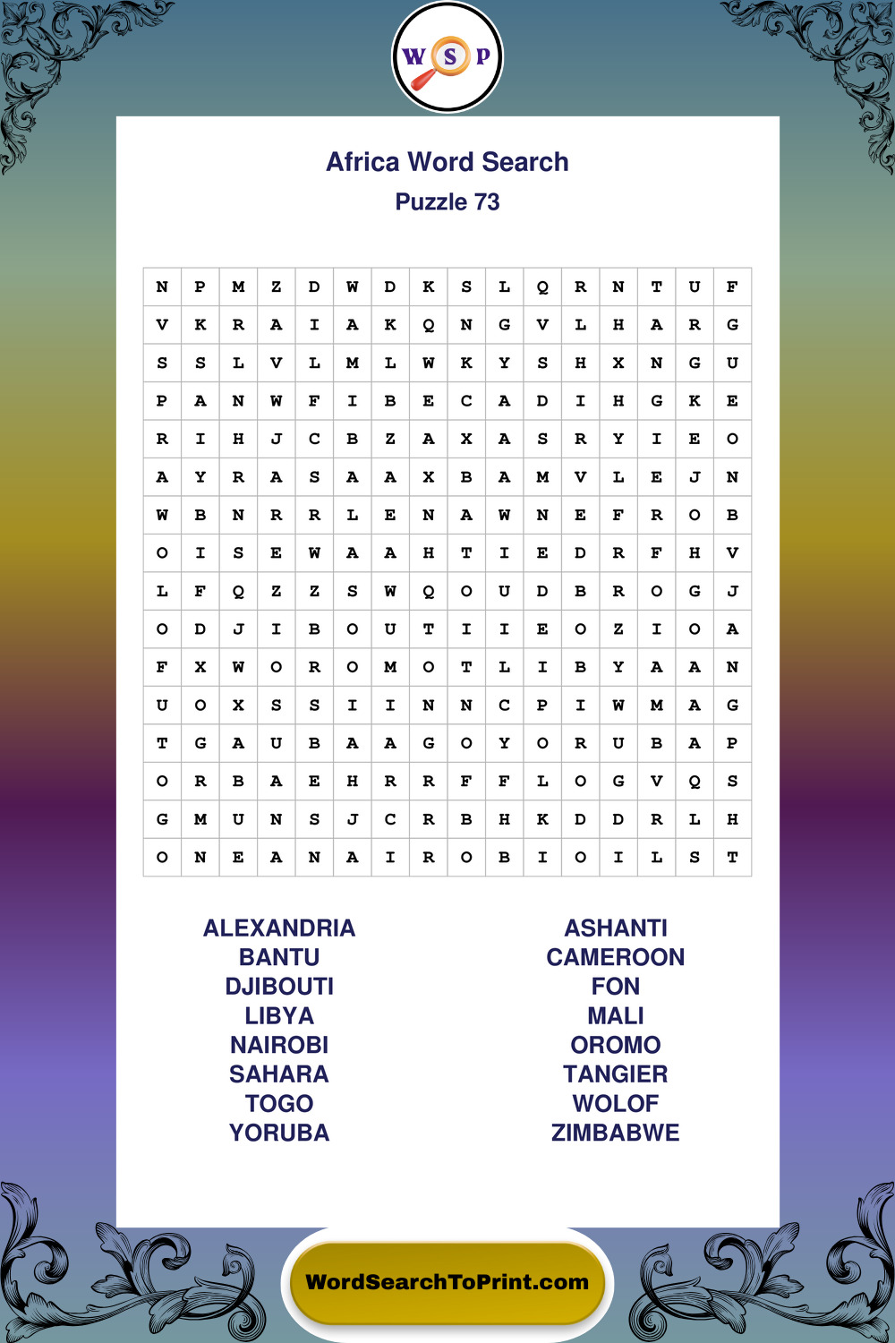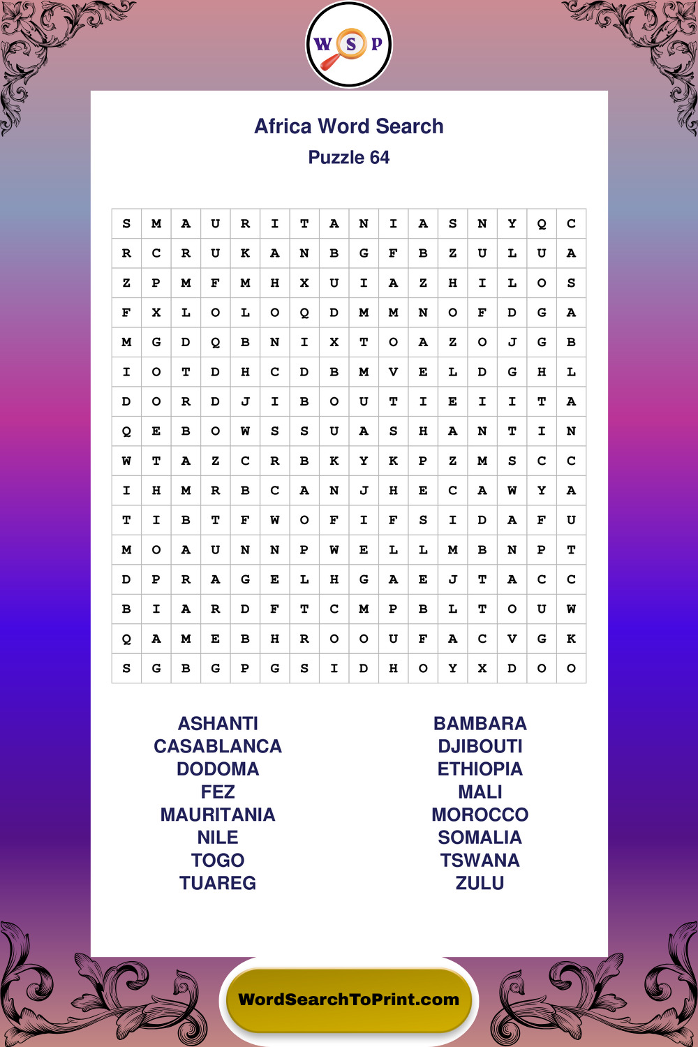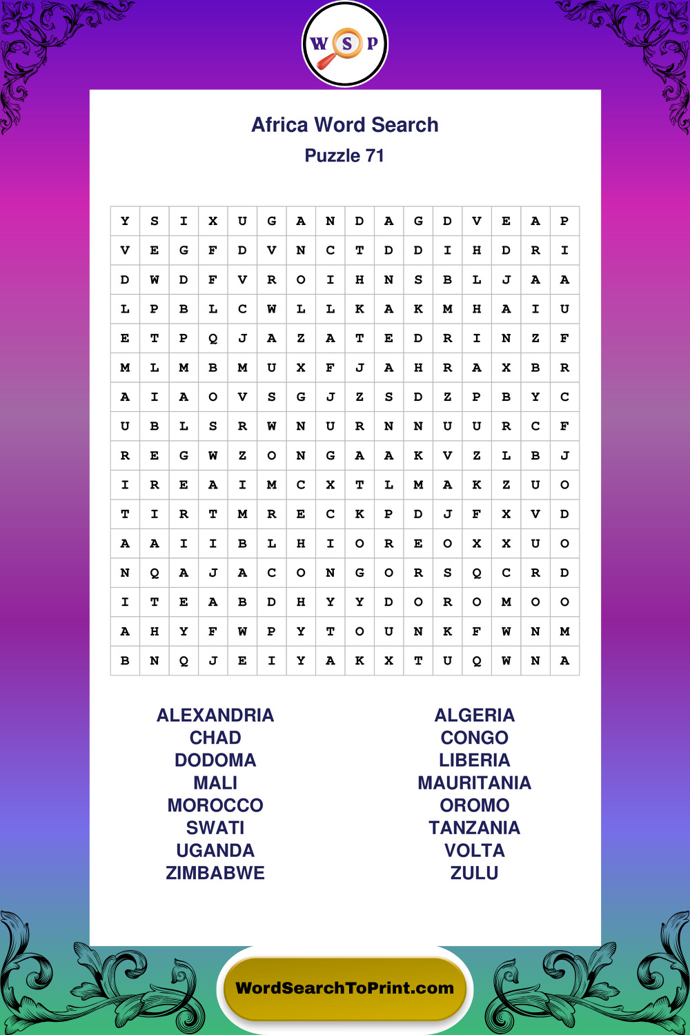 Find easy-to-read large print Africa wordsearches designed for peaceful focus and simple, enjoyable solving.