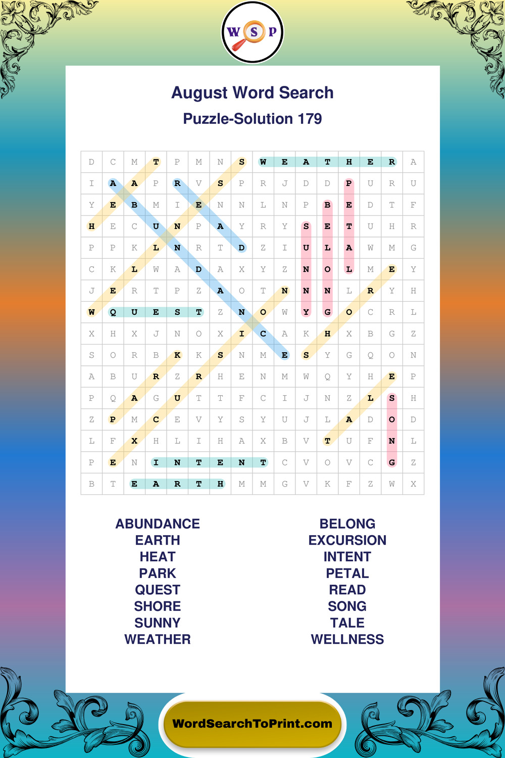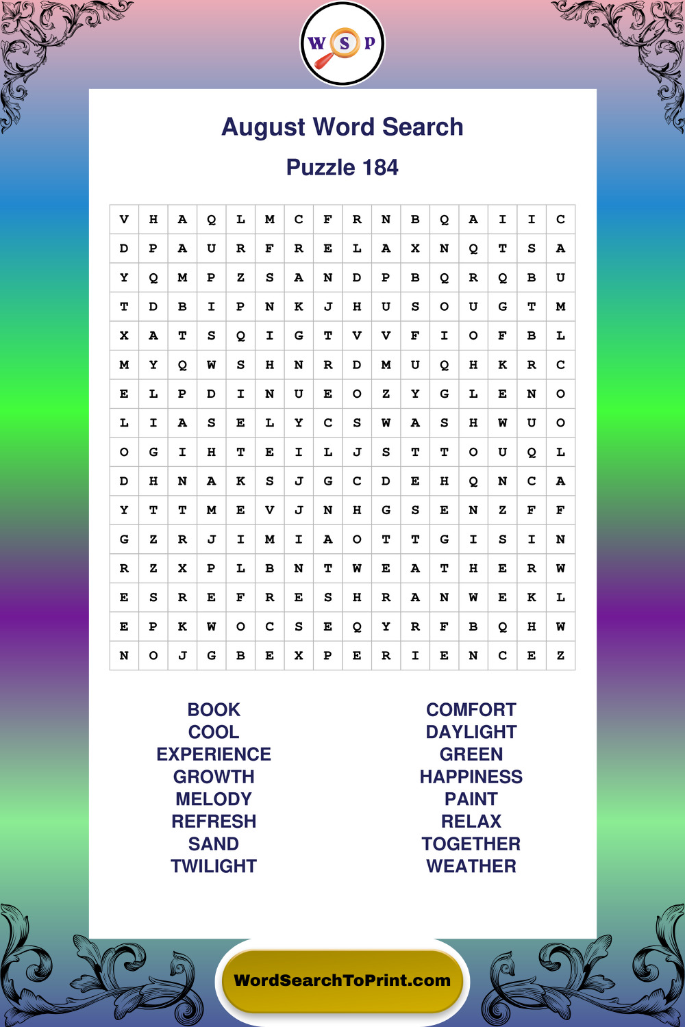 This page features large print August wordsearches made for stress-free reading and relaxed concentration.