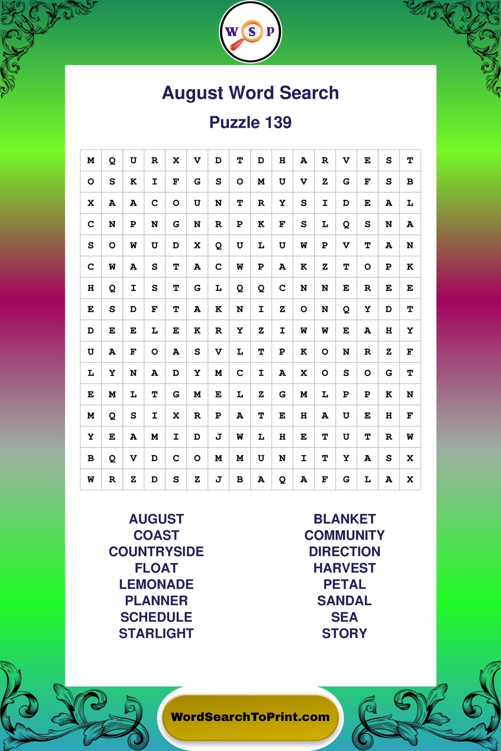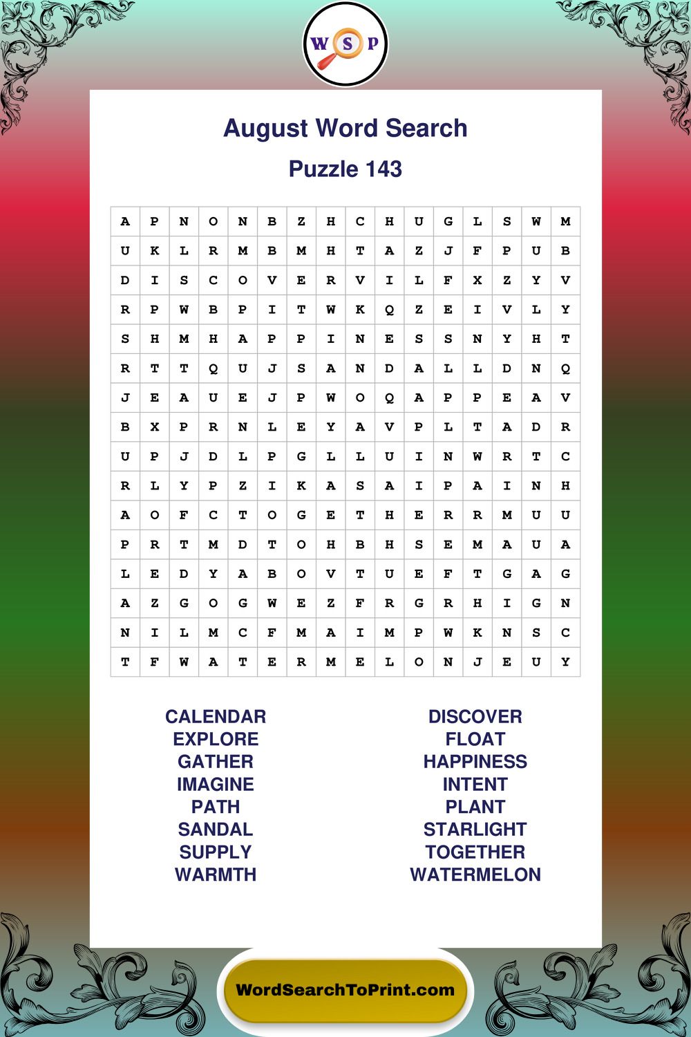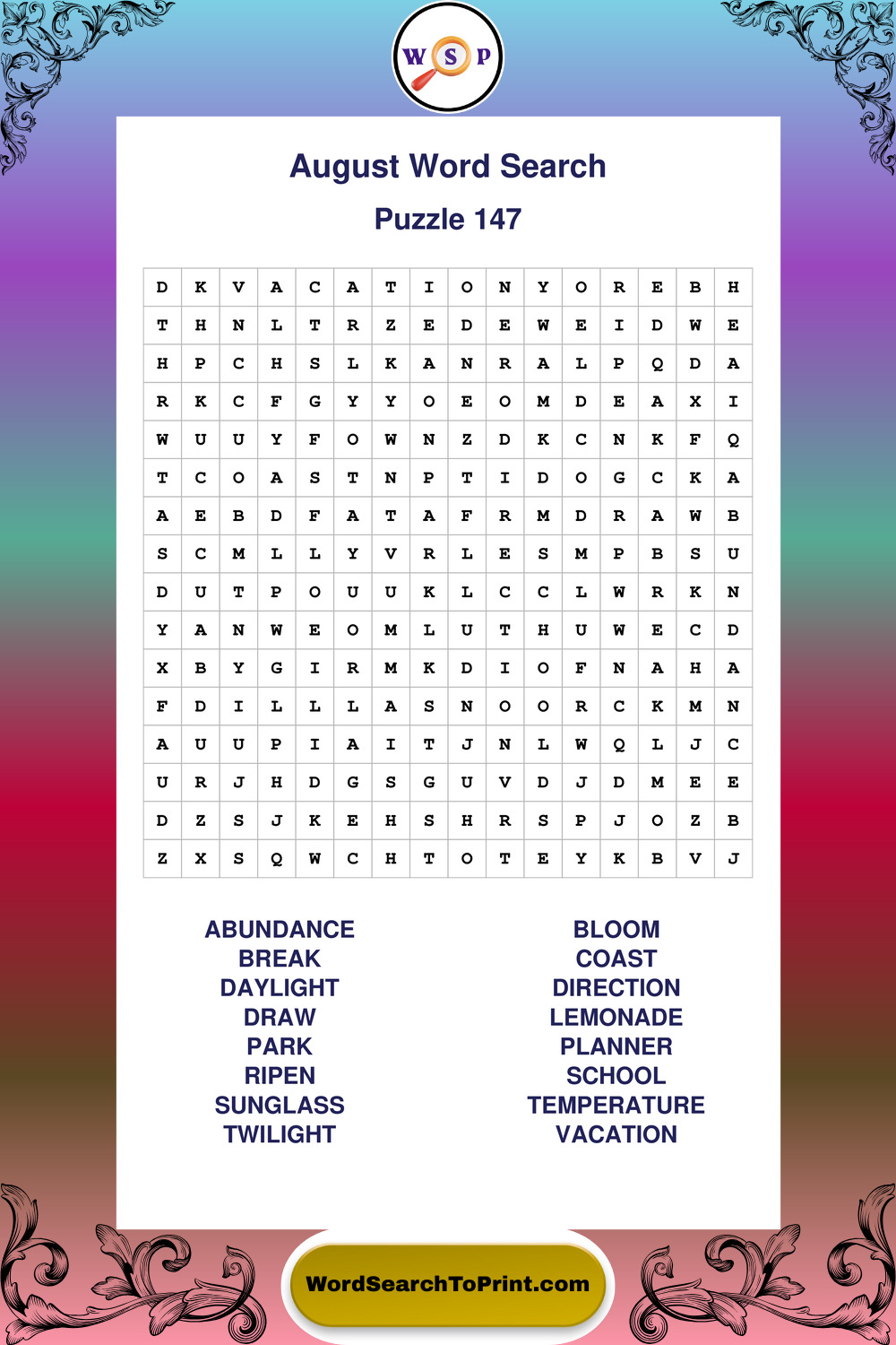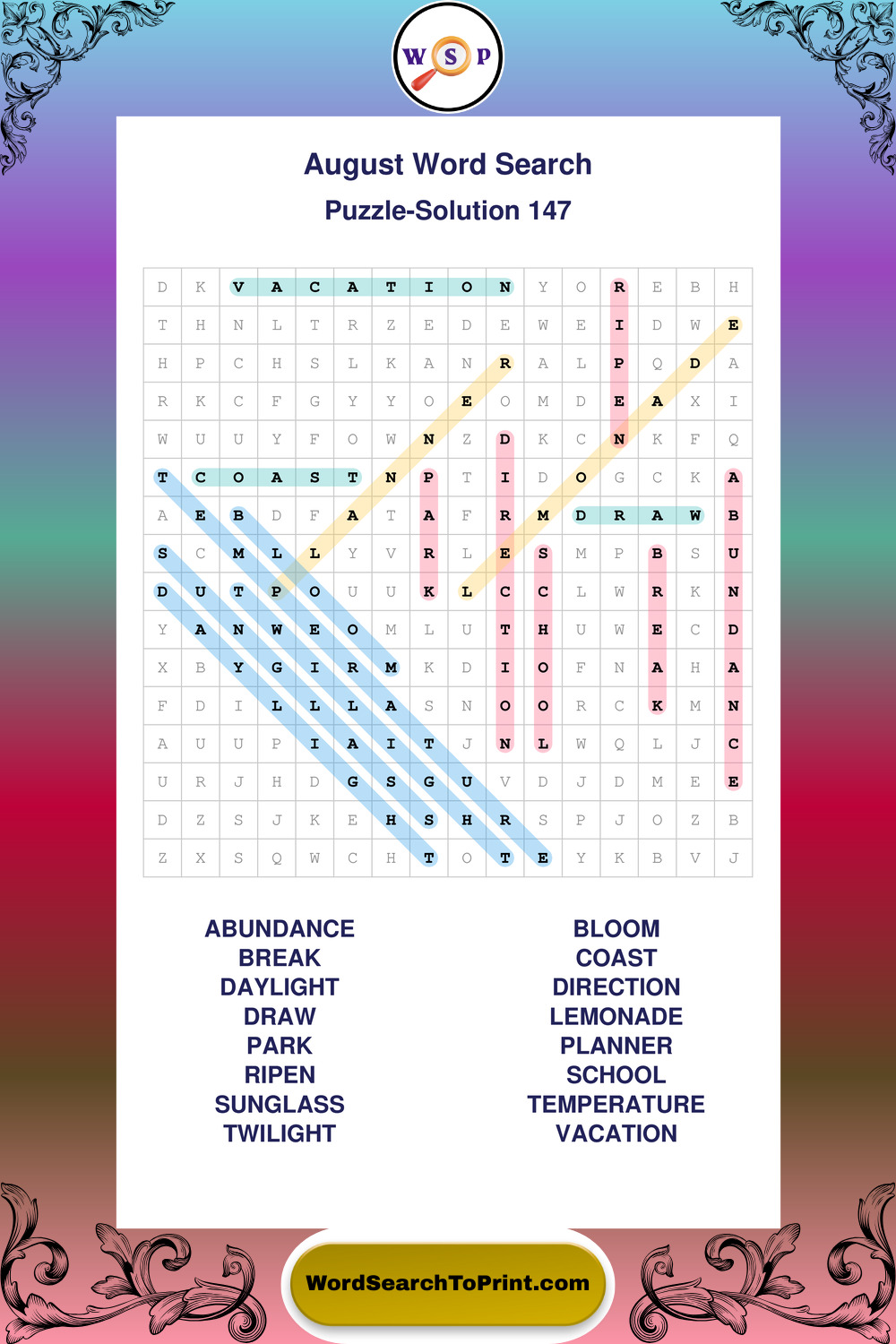 Printable August Wordsearch Puzzles