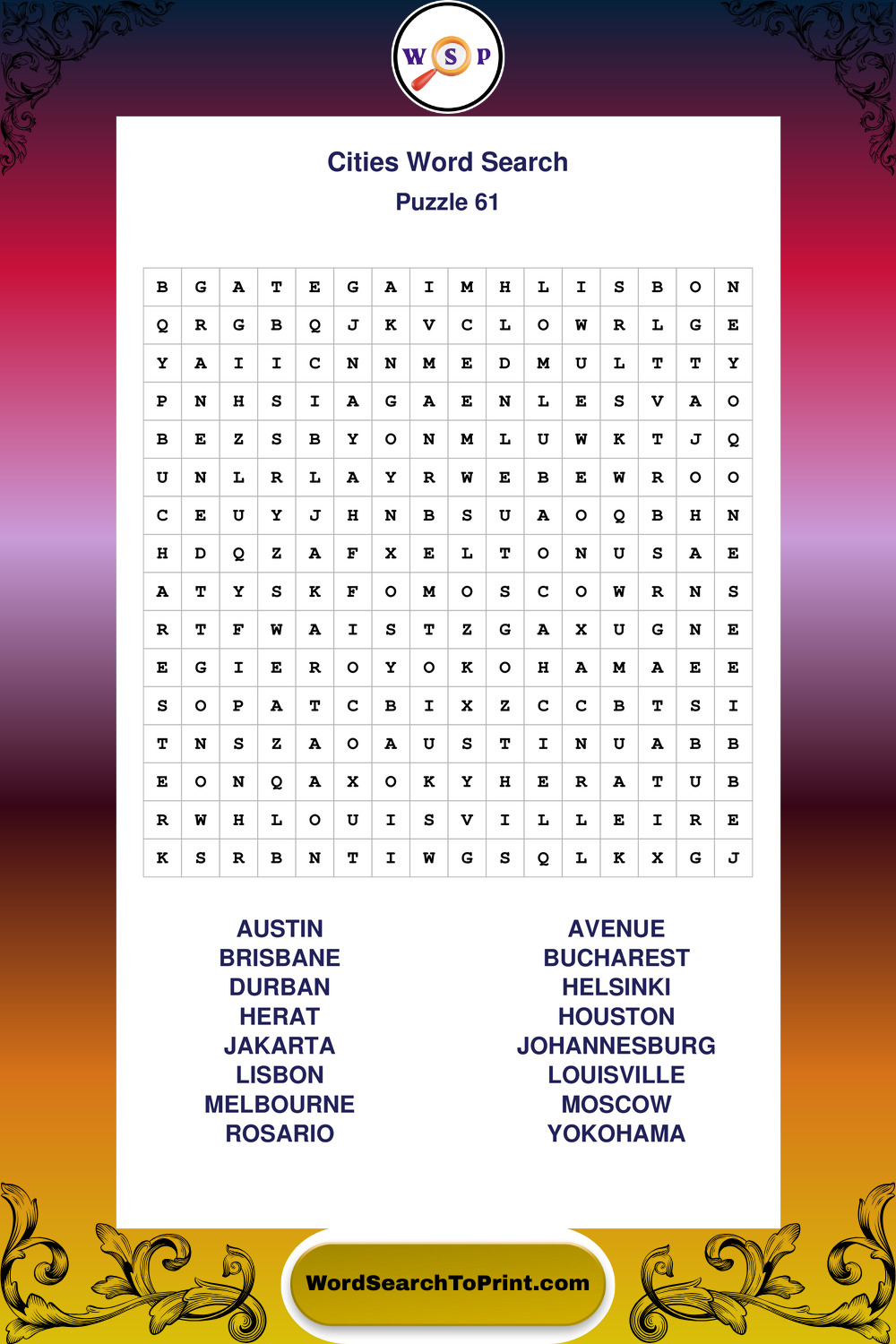 Enjoy large print Cities wordsearches that balance clarity, simplicity, and enjoyable mental activity.