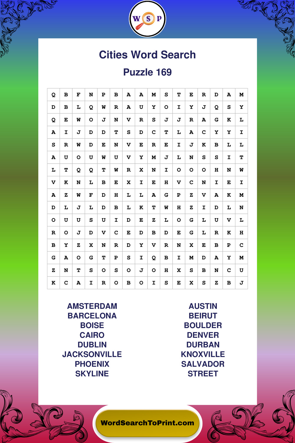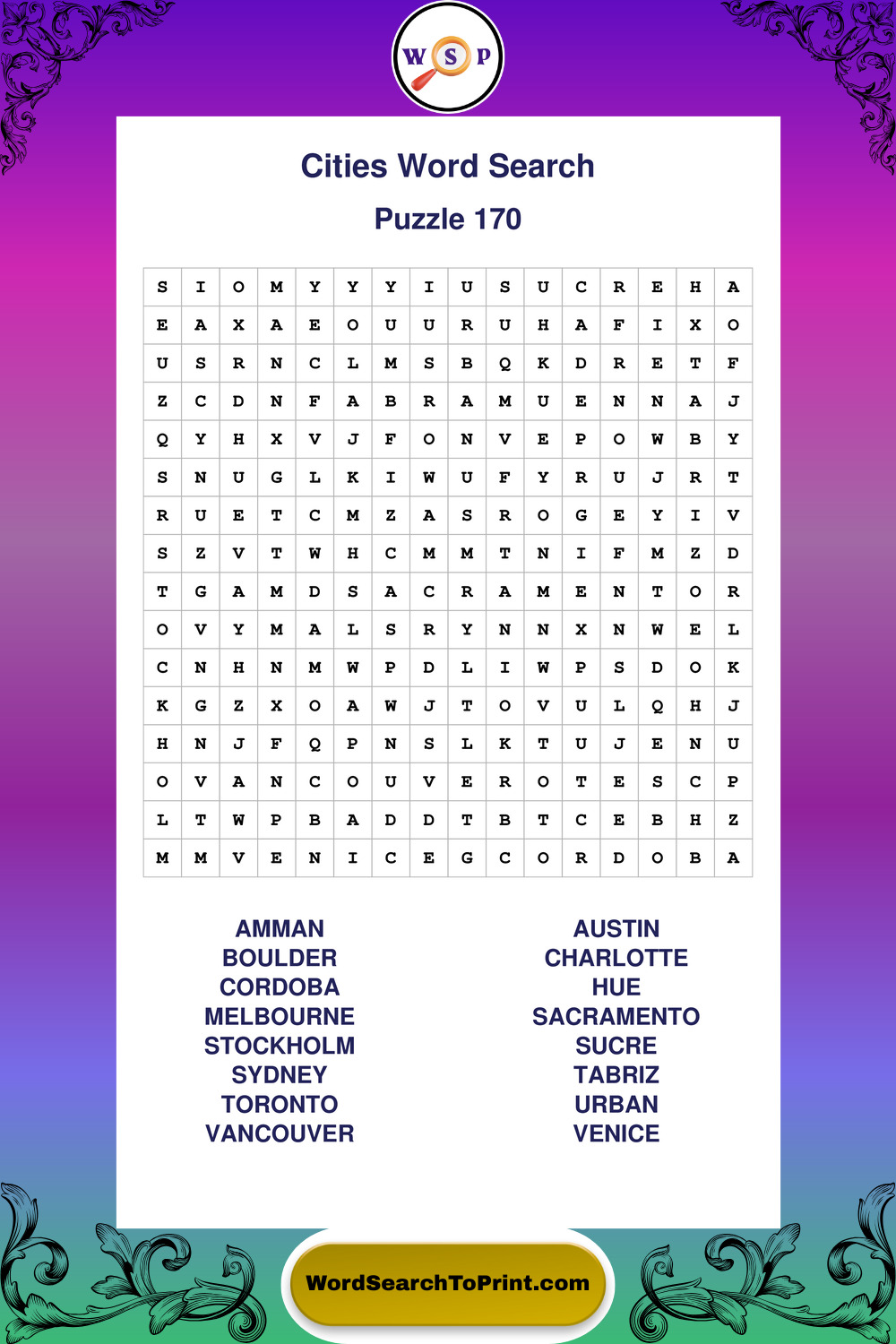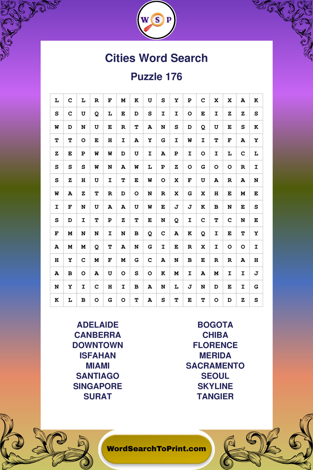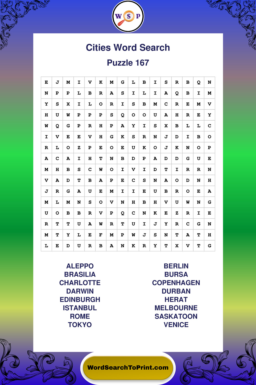 Enjoy large print Cities wordsearches that balance clarity, simplicity, and enjoyable mental activity.