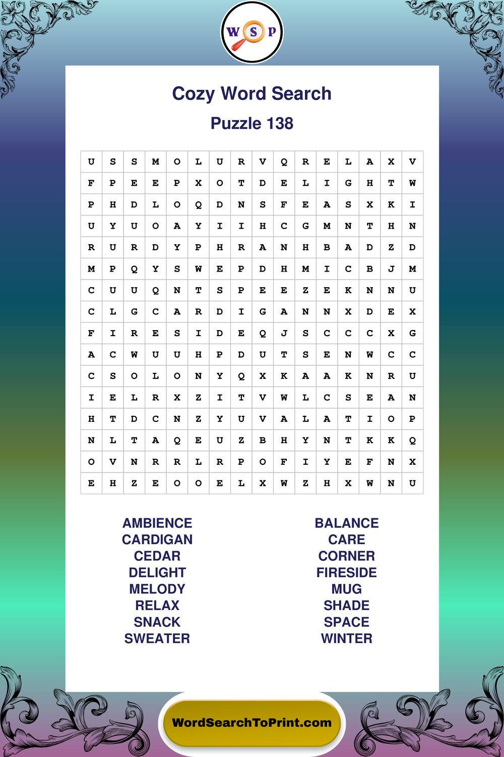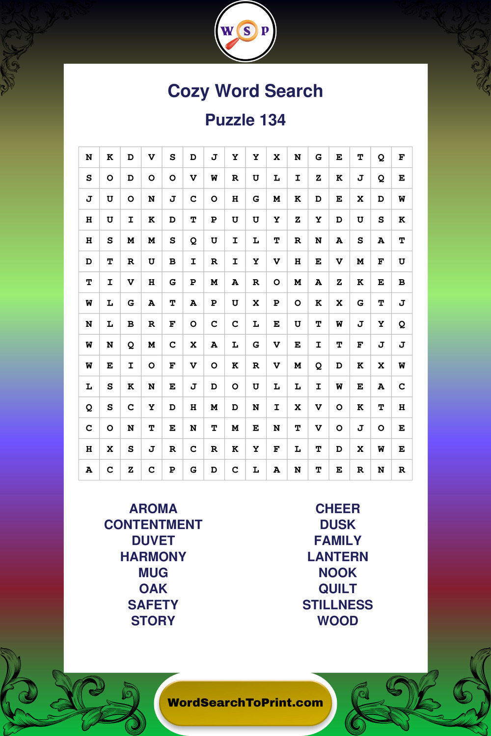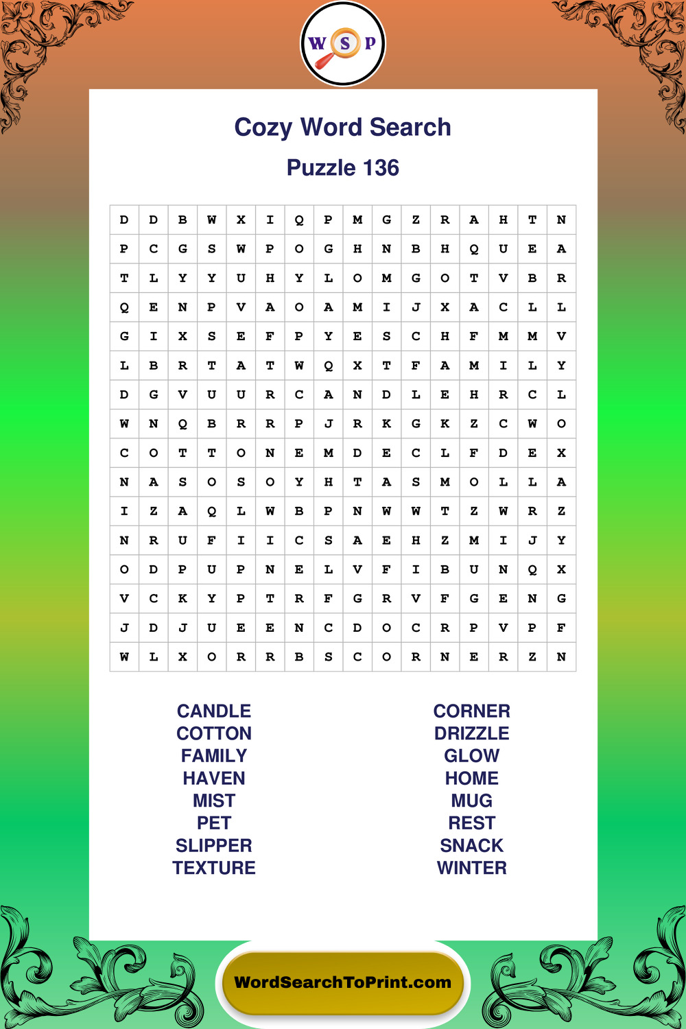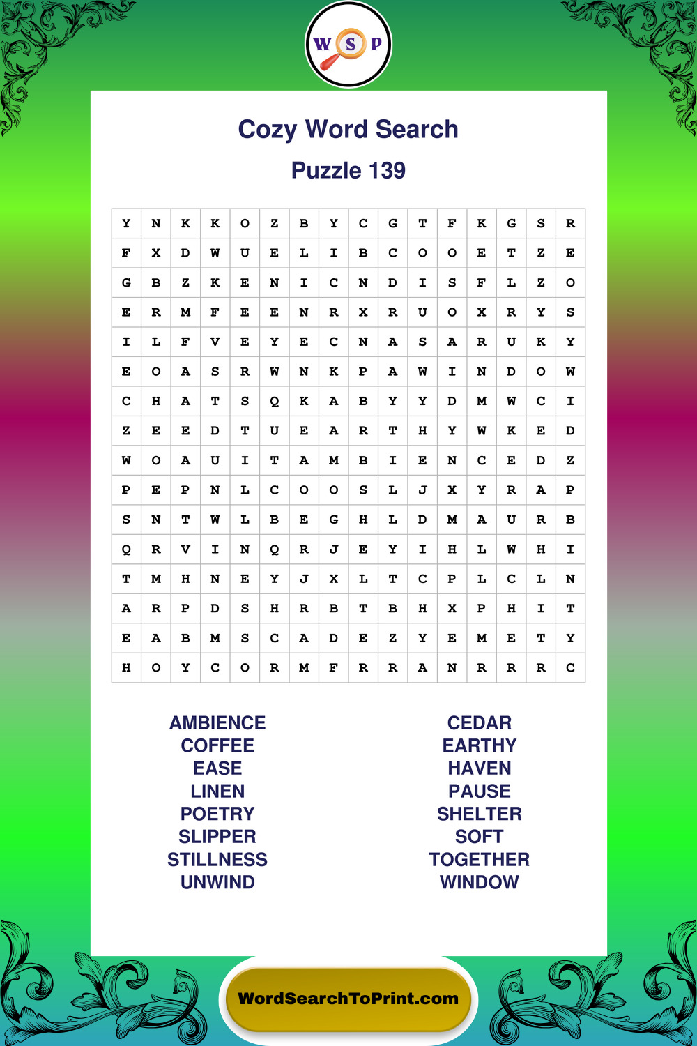 These printable large print Cozy wordsearches offer a calm and accessible puzzle experience for all skill levels.