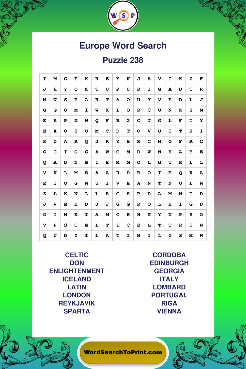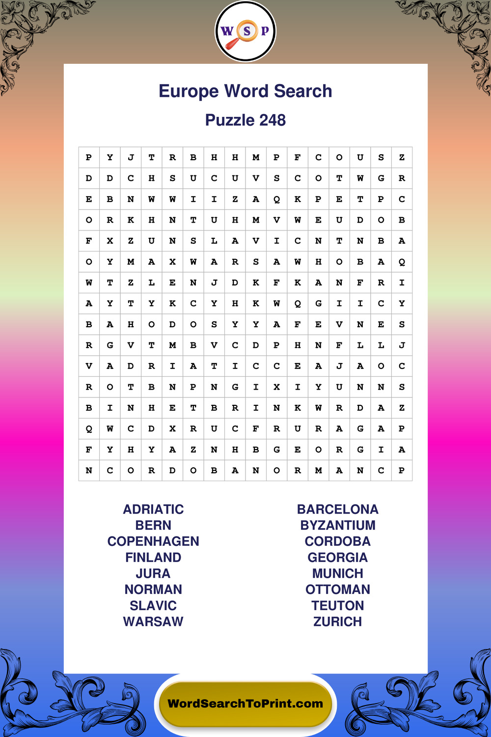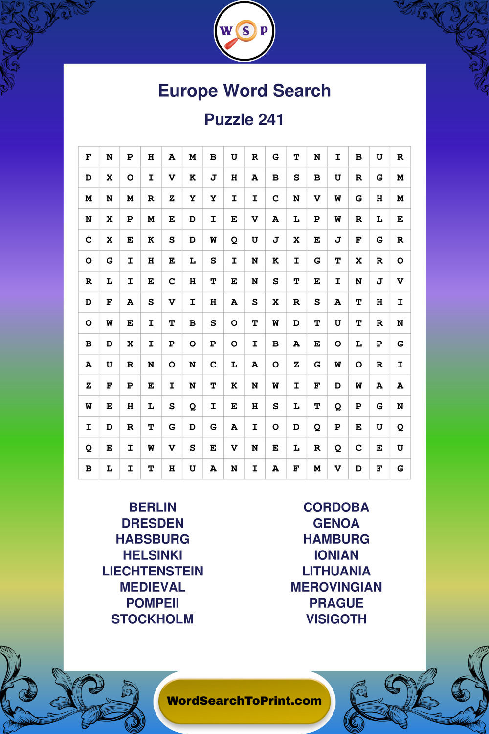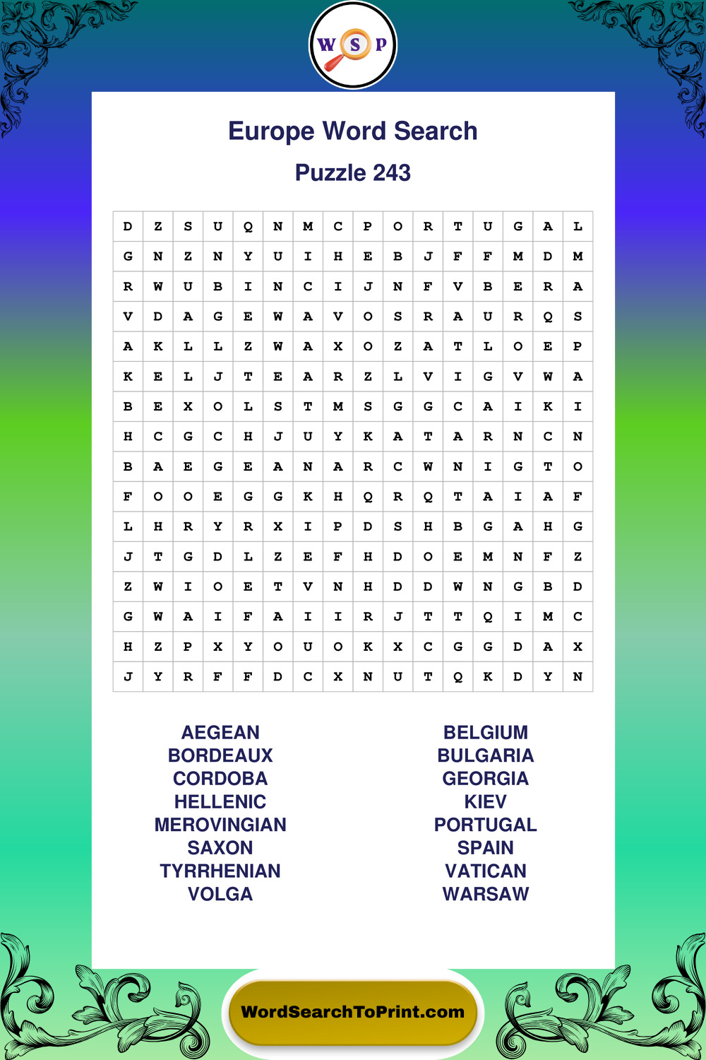 Browse easy-to-read large print Europe wordsearches created for peaceful moments and clear visual comfort.