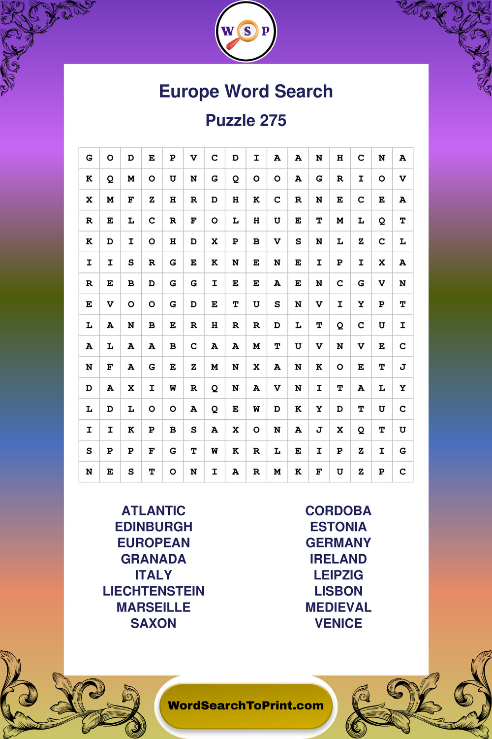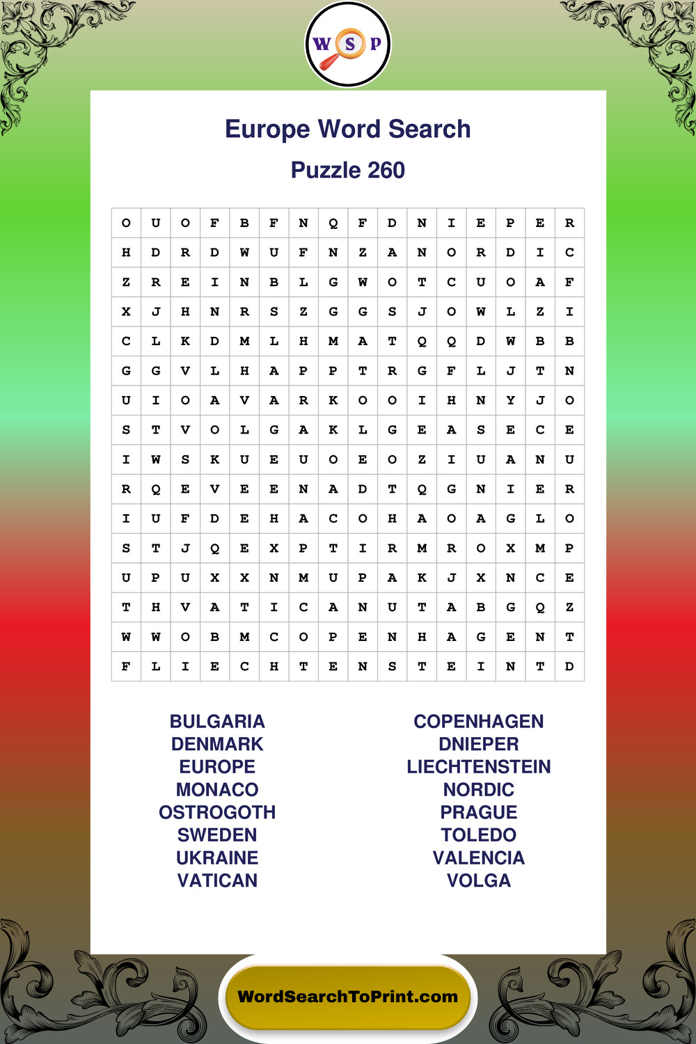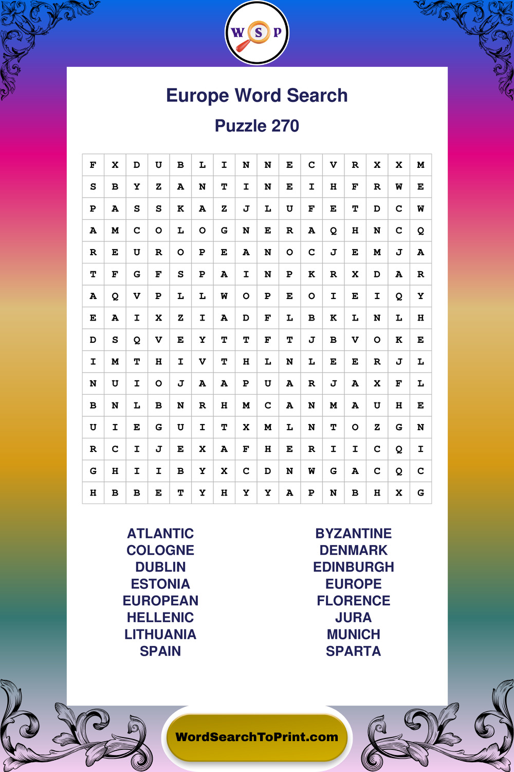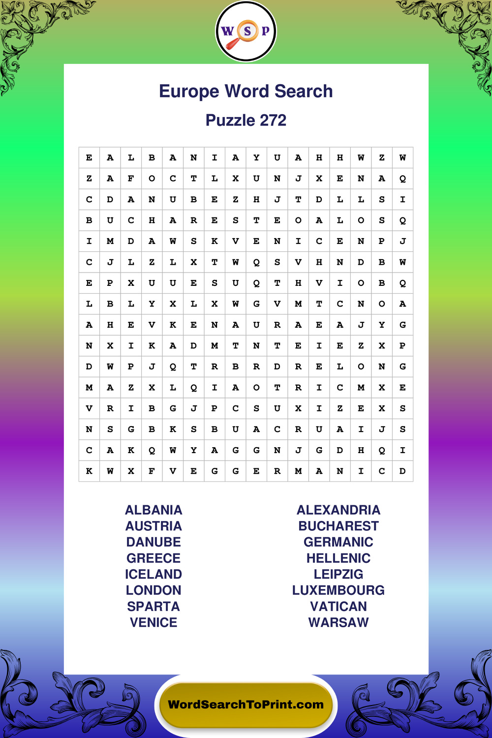 Printable Europe Wordsearch Puzzles