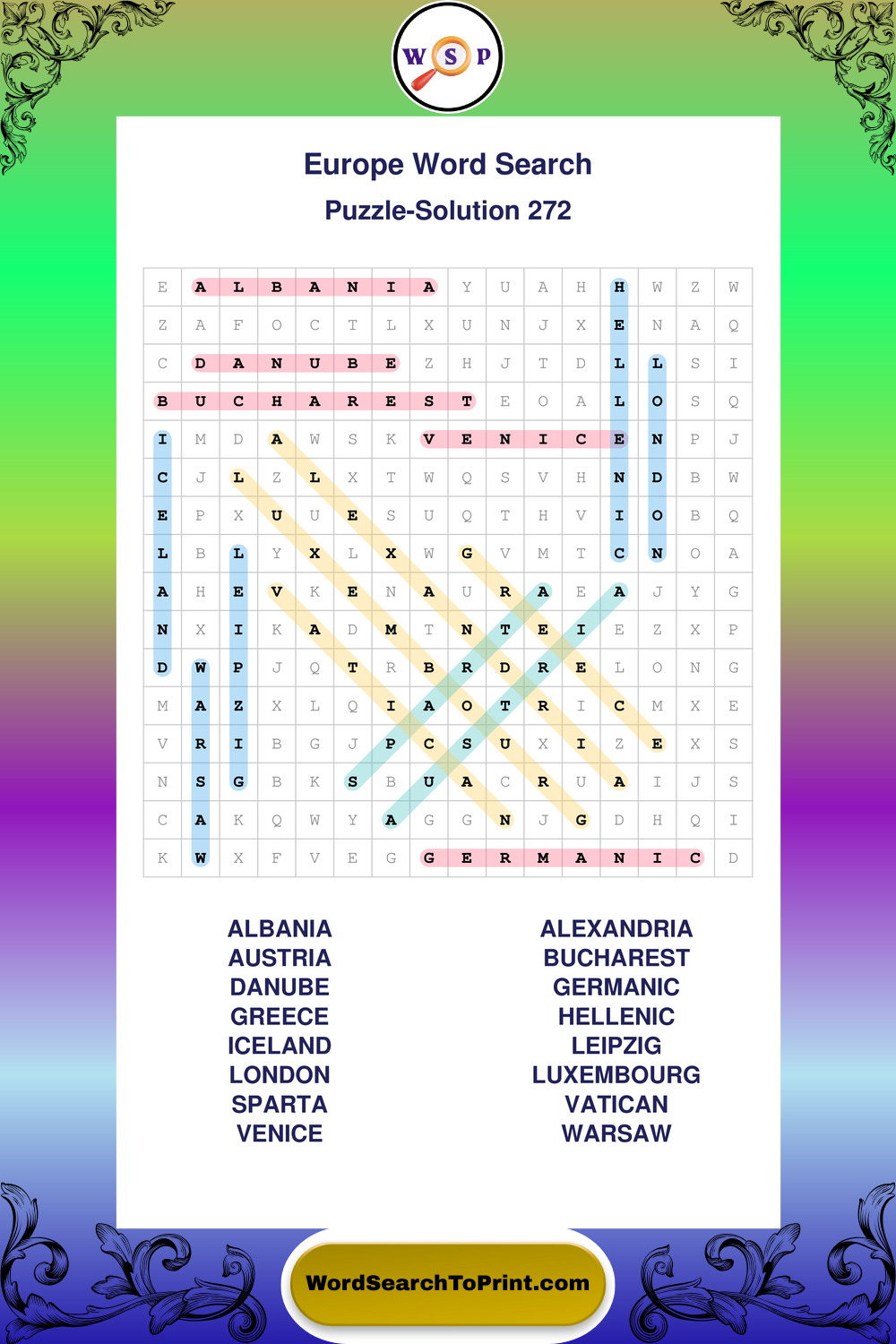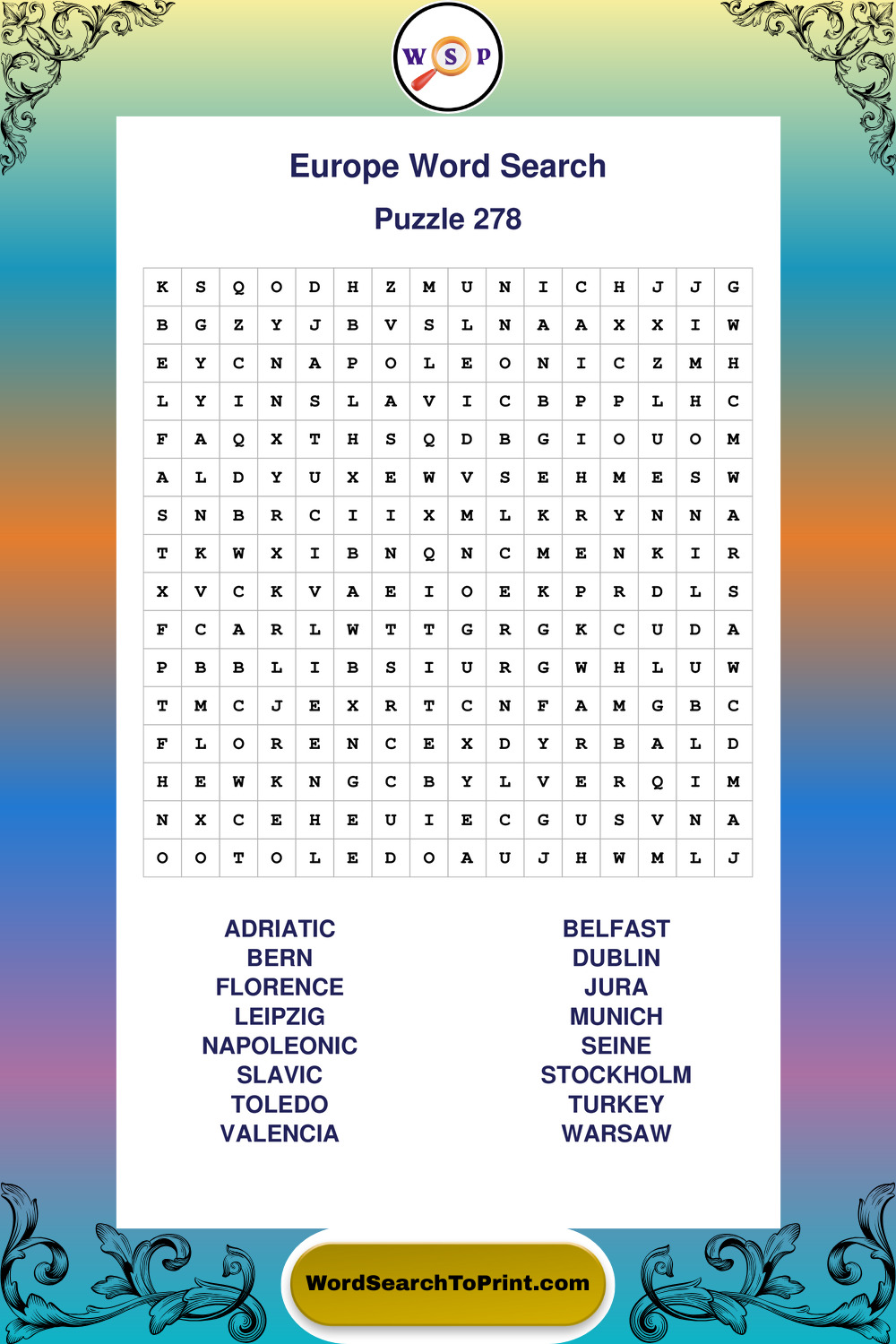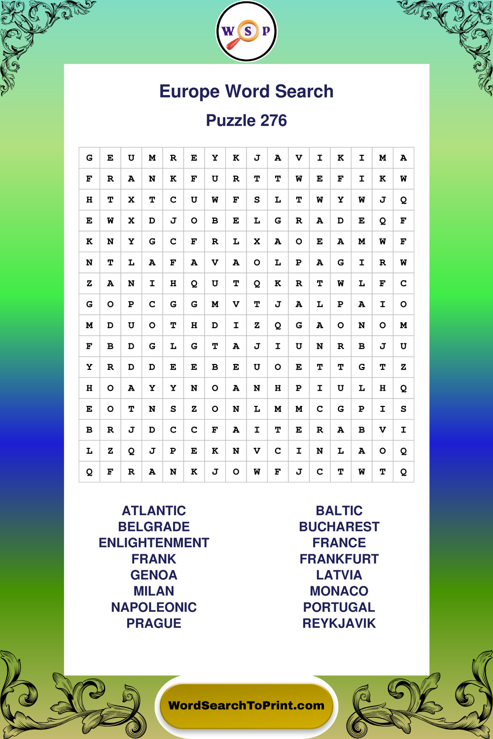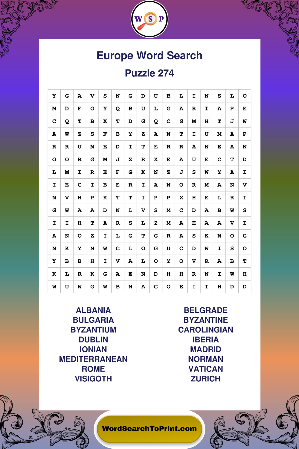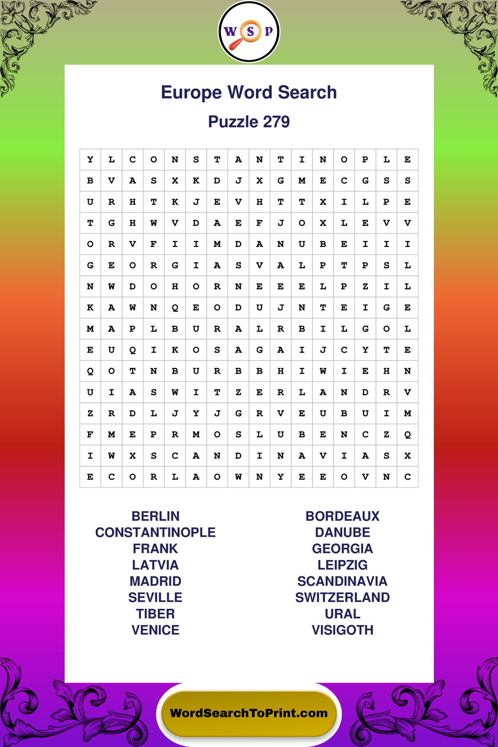 Printable Europe Wordsearch Puzzles