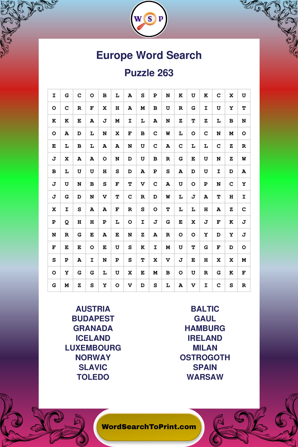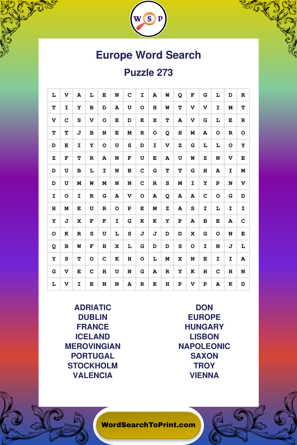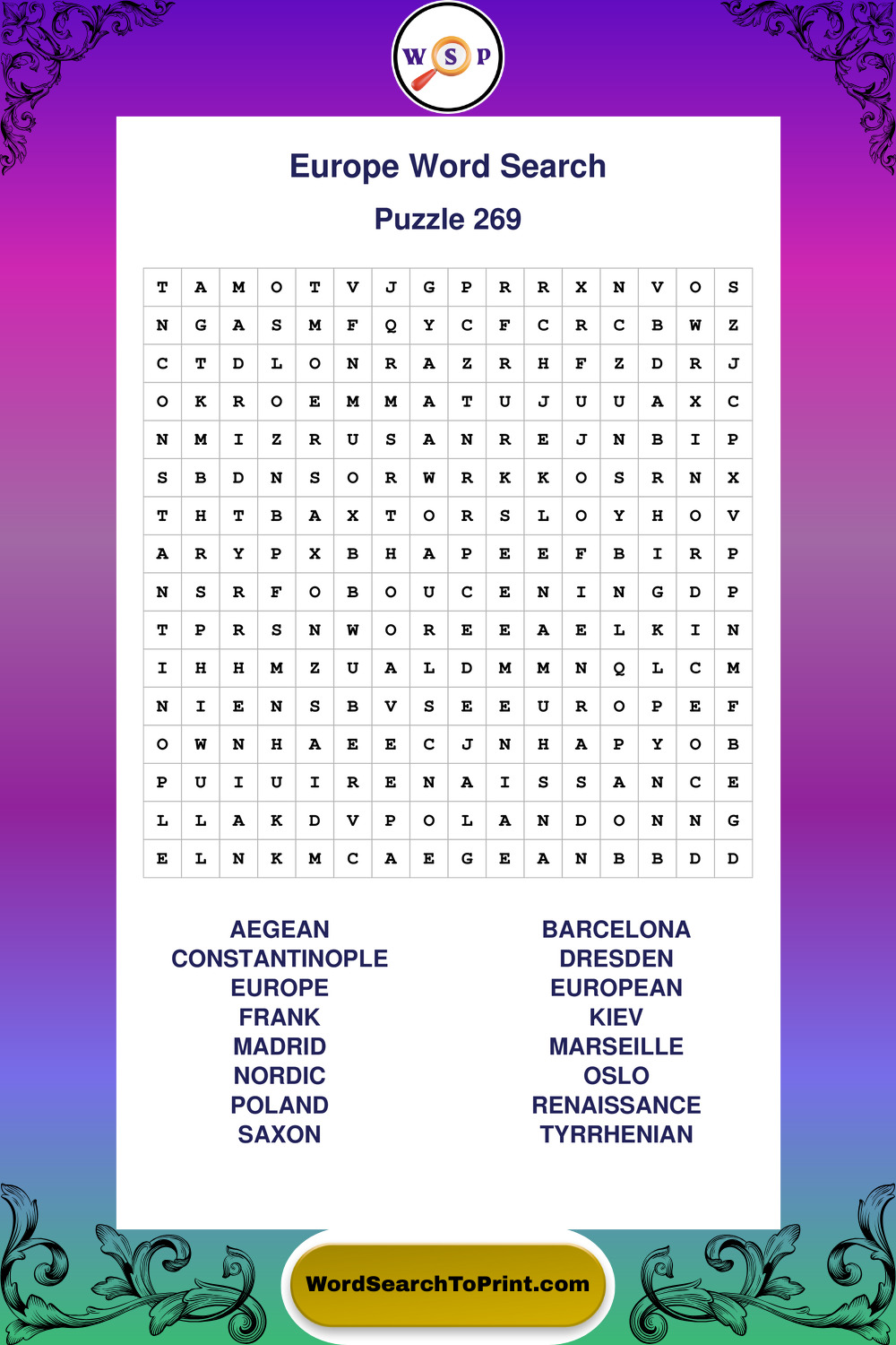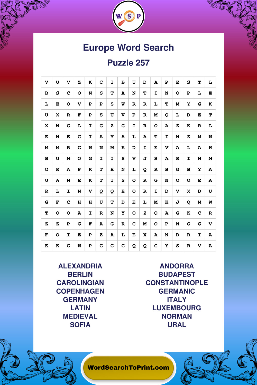Printable Europe Wordsearch Puzzles