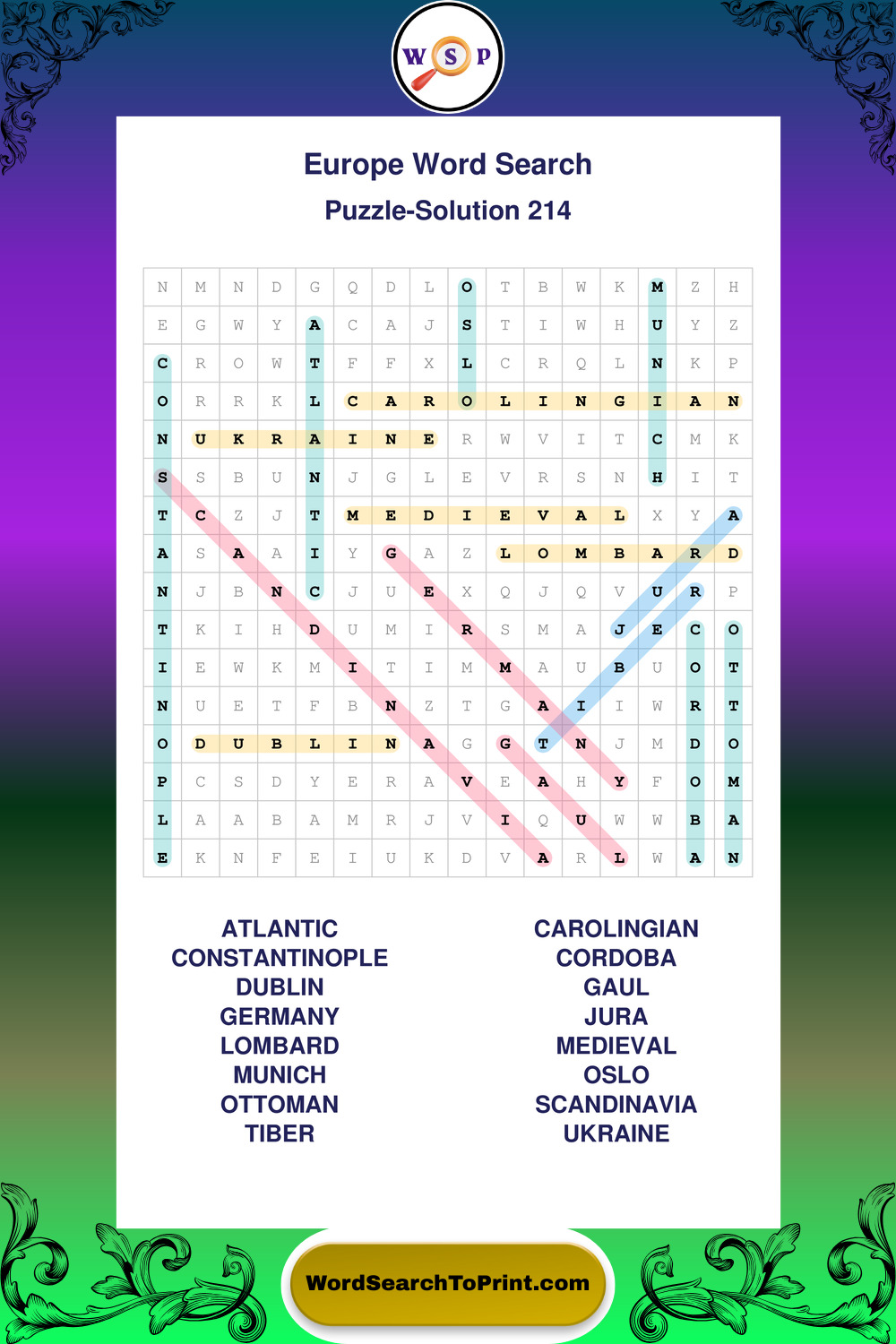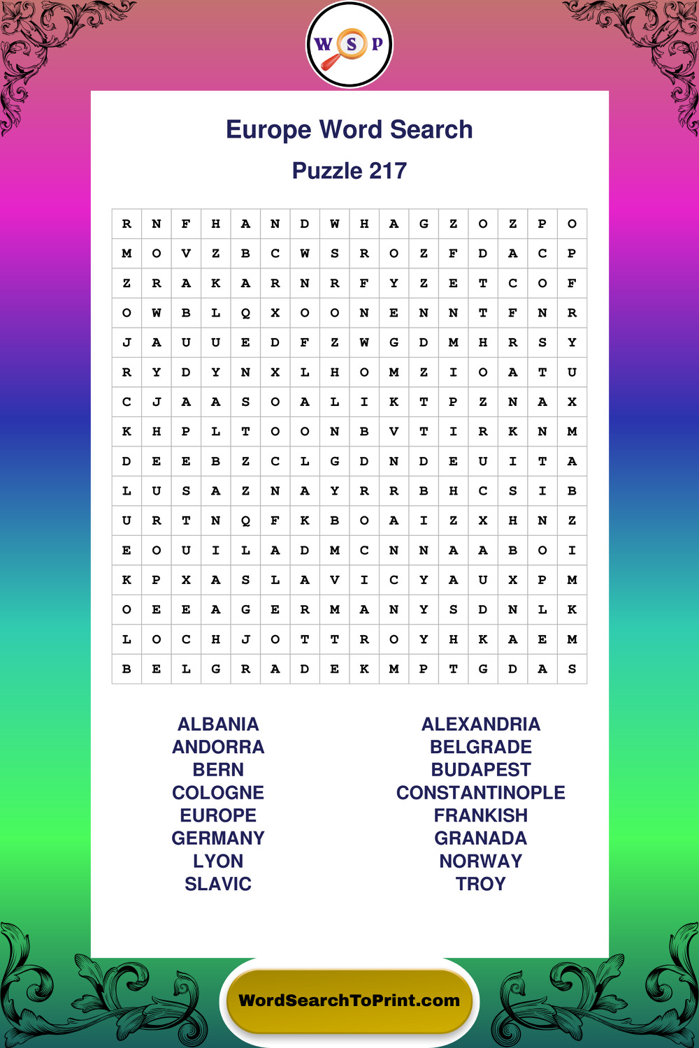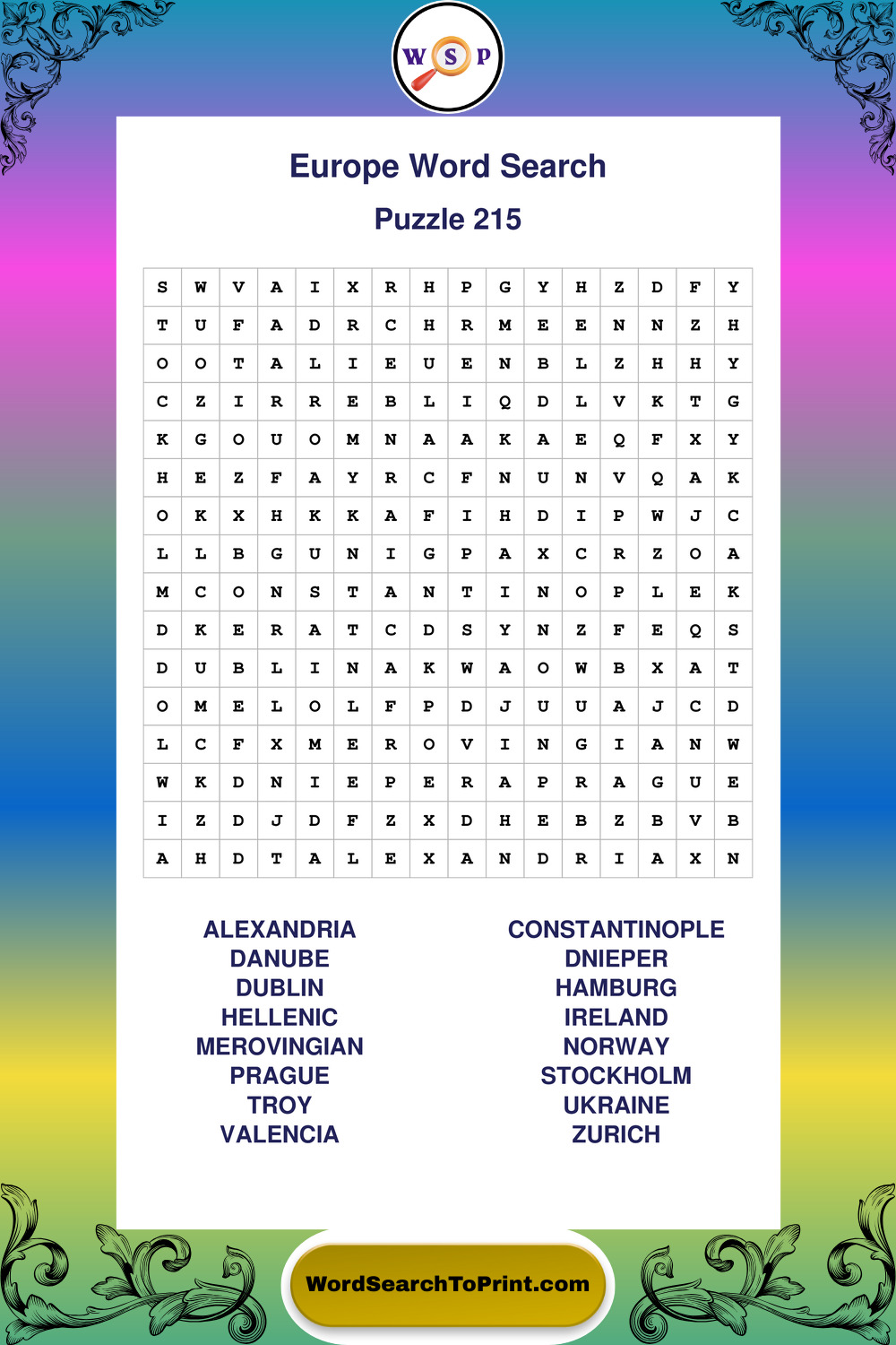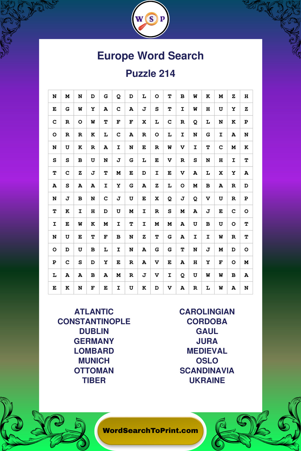 Printable Europe Wordsearch Puzzles