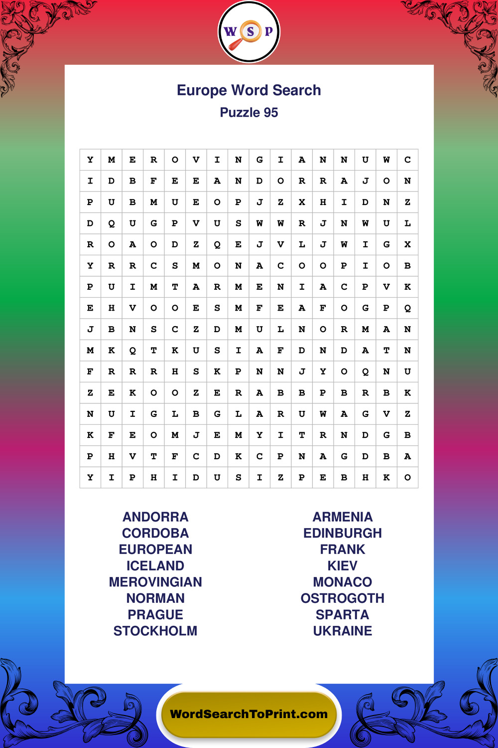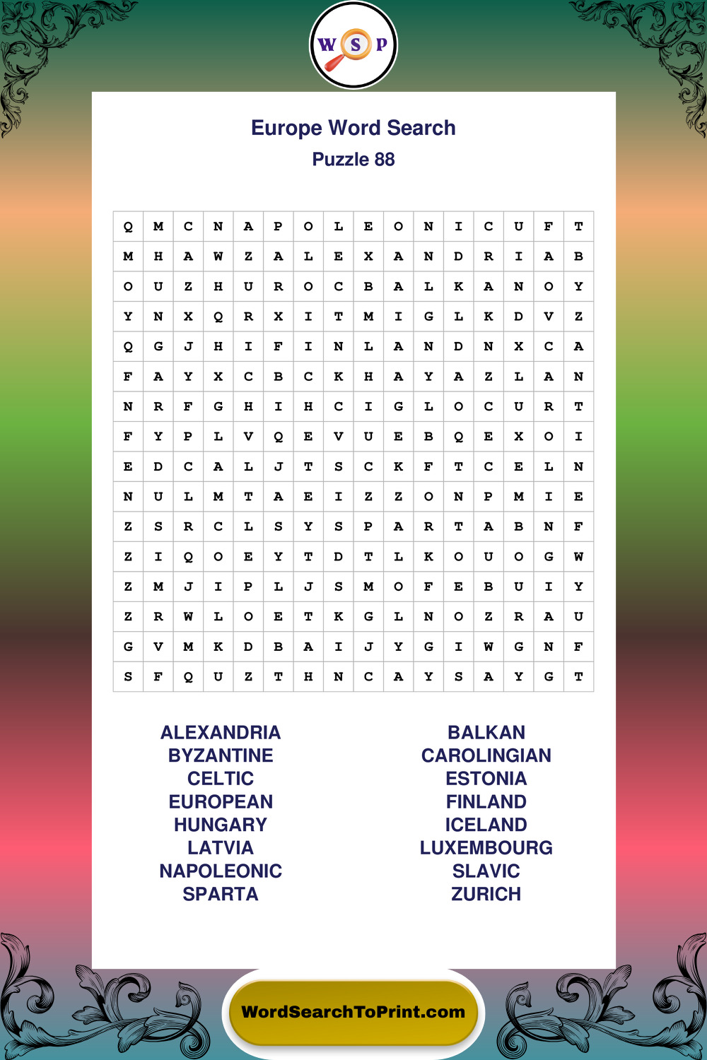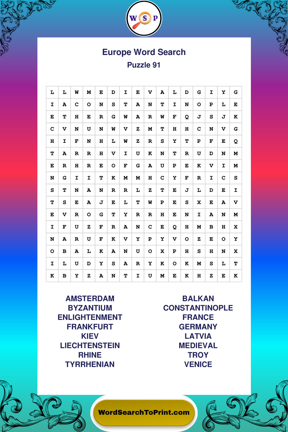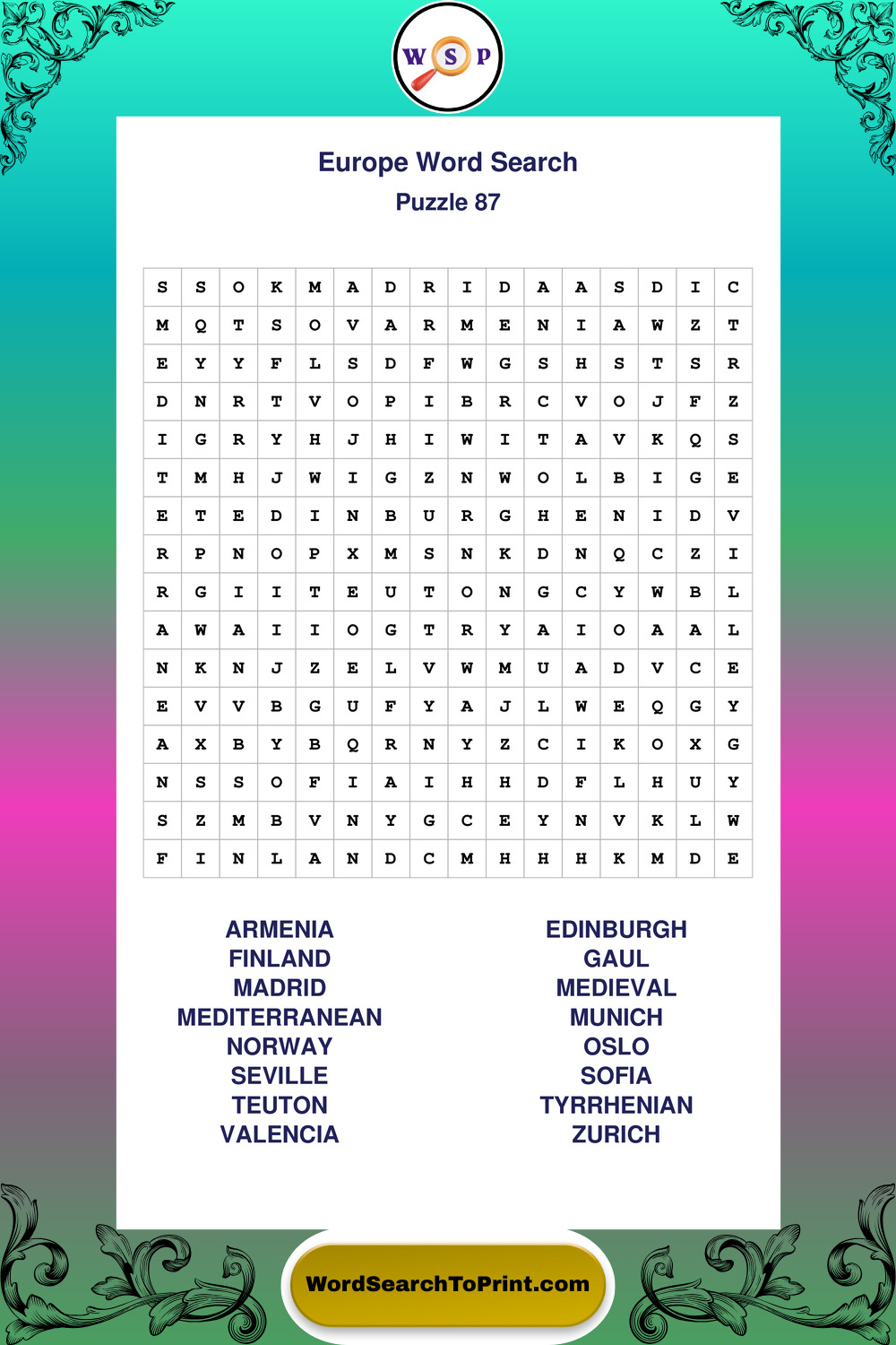 Printable Europe Wordsearch Puzzles