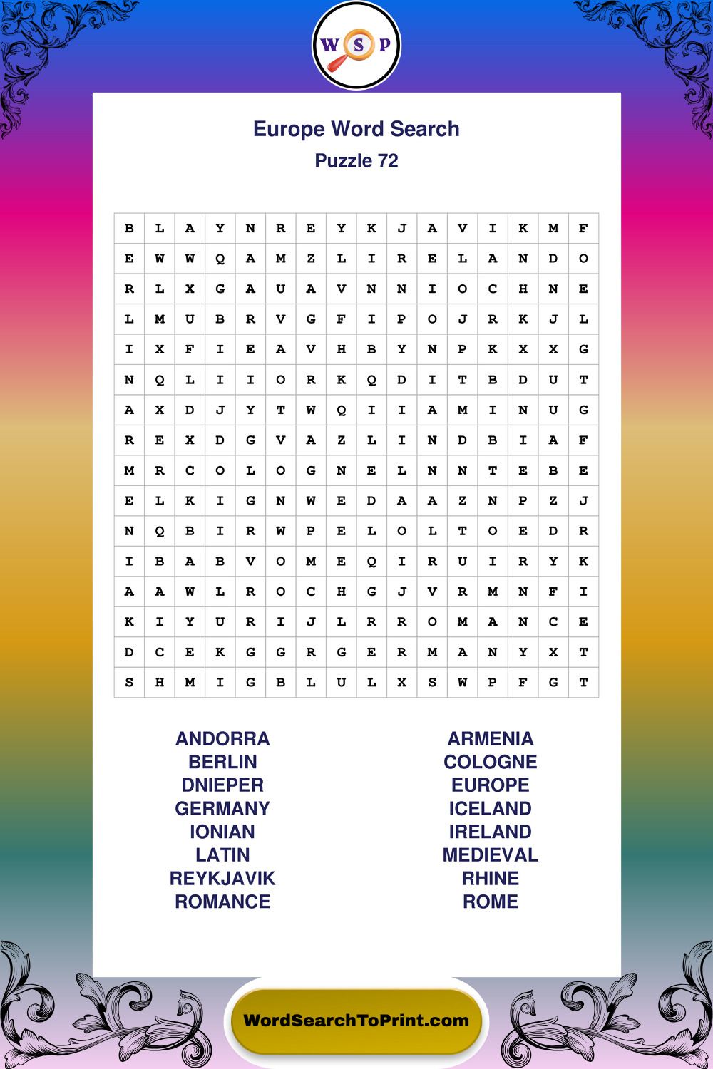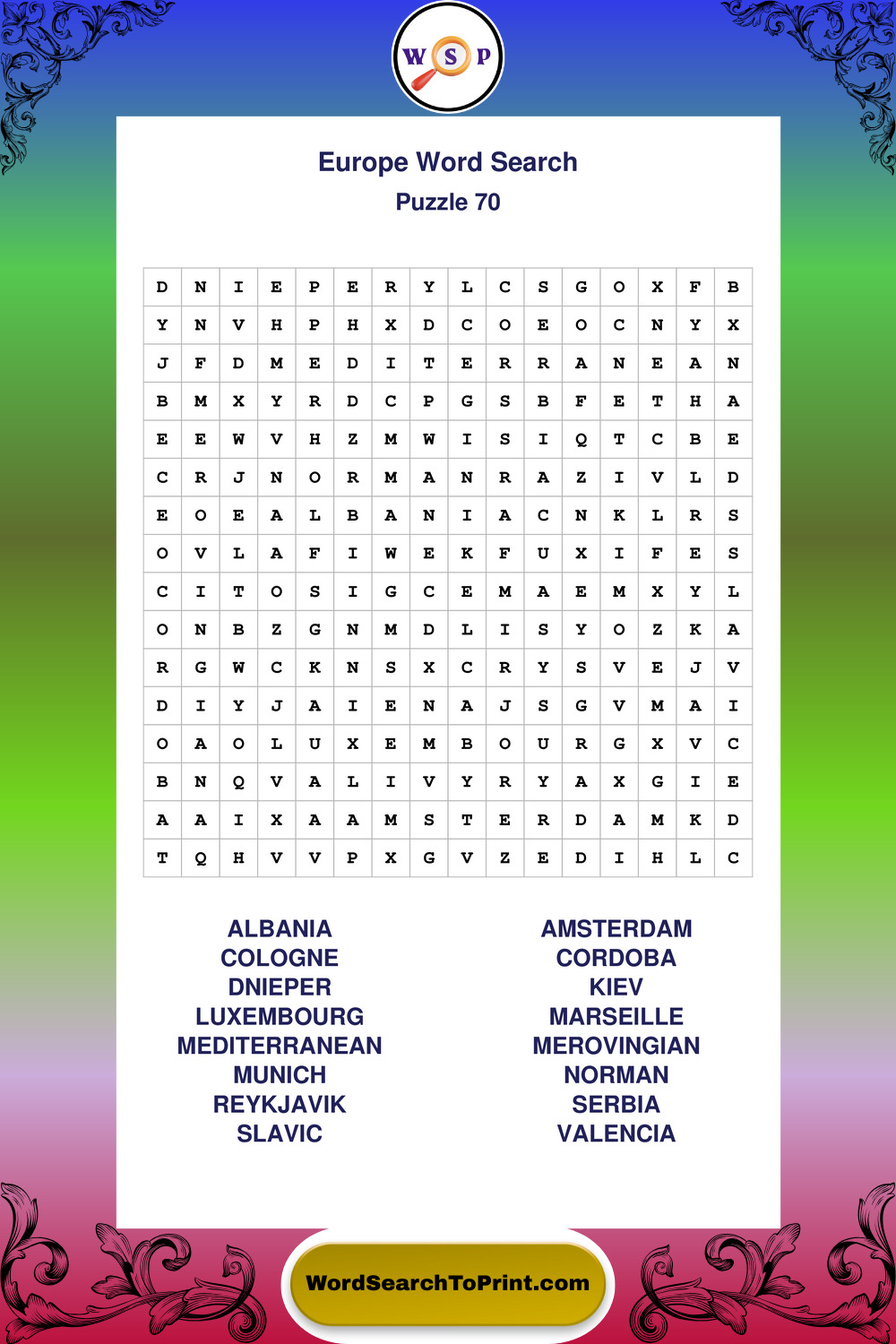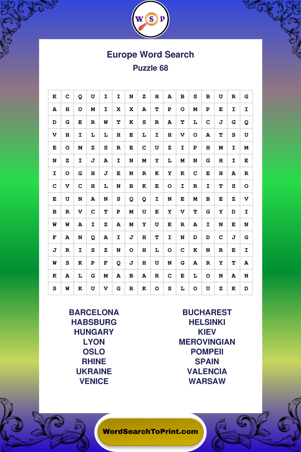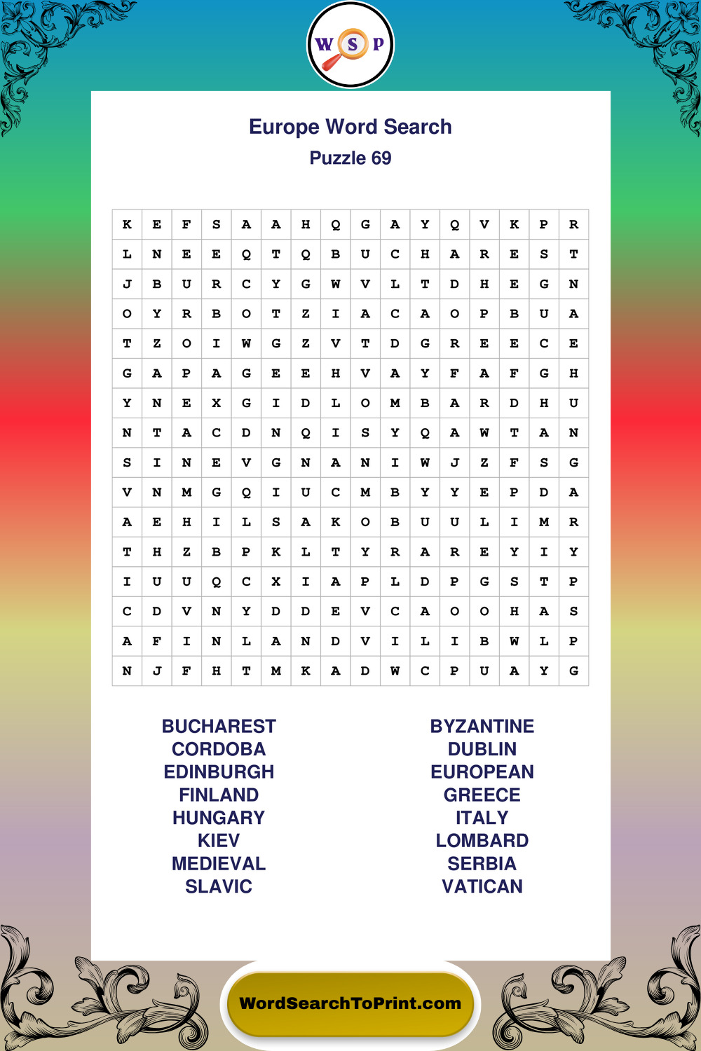 Printable Europe Wordsearch Puzzles