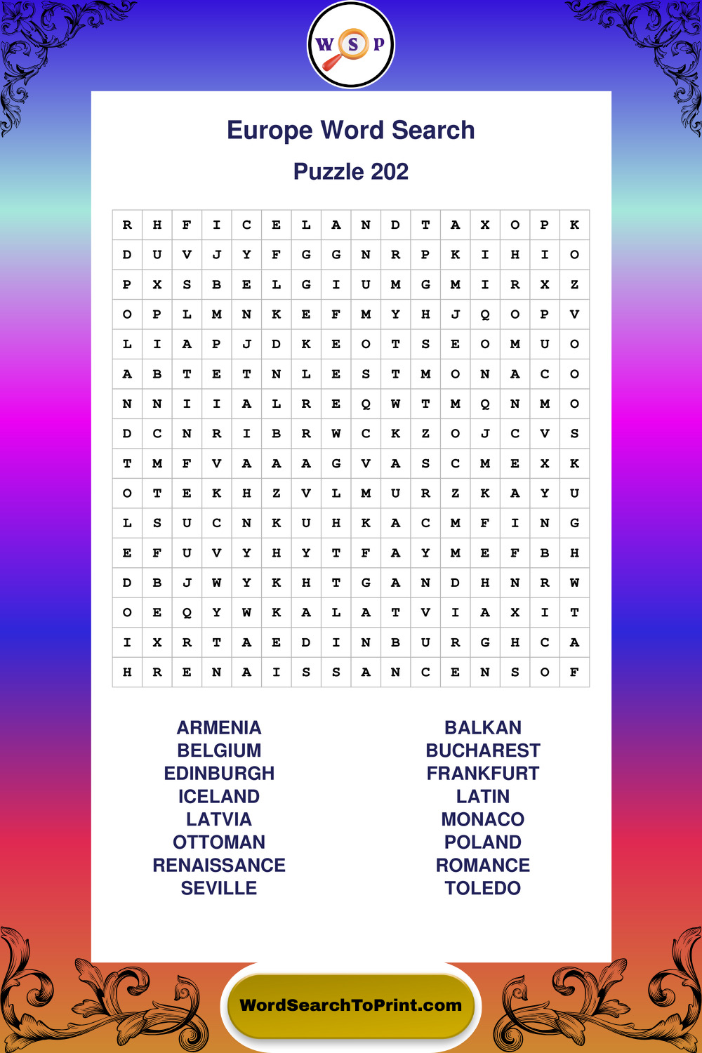 Browse easy-to-read large print Europe wordsearches created for peaceful moments and clear visual comfort.