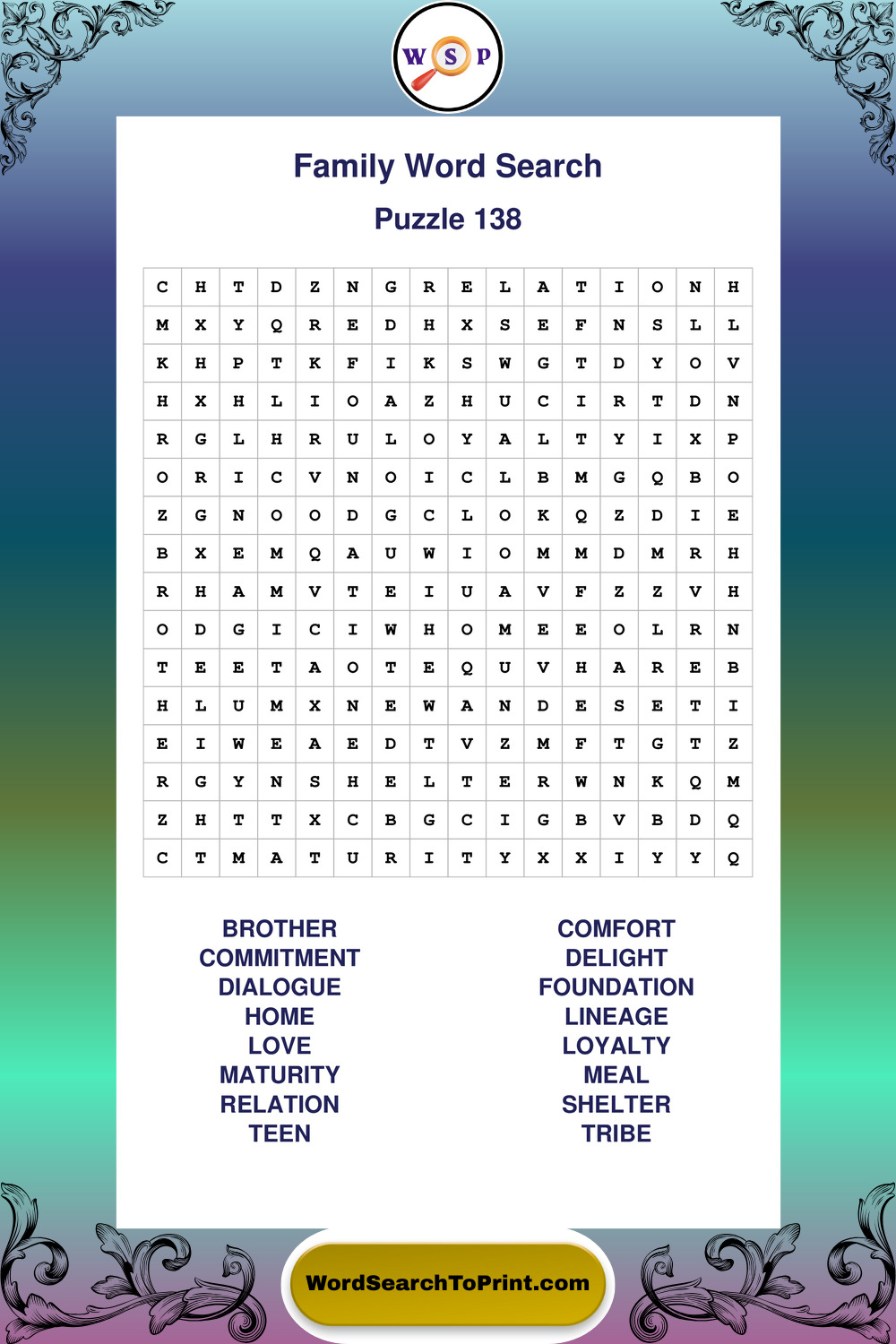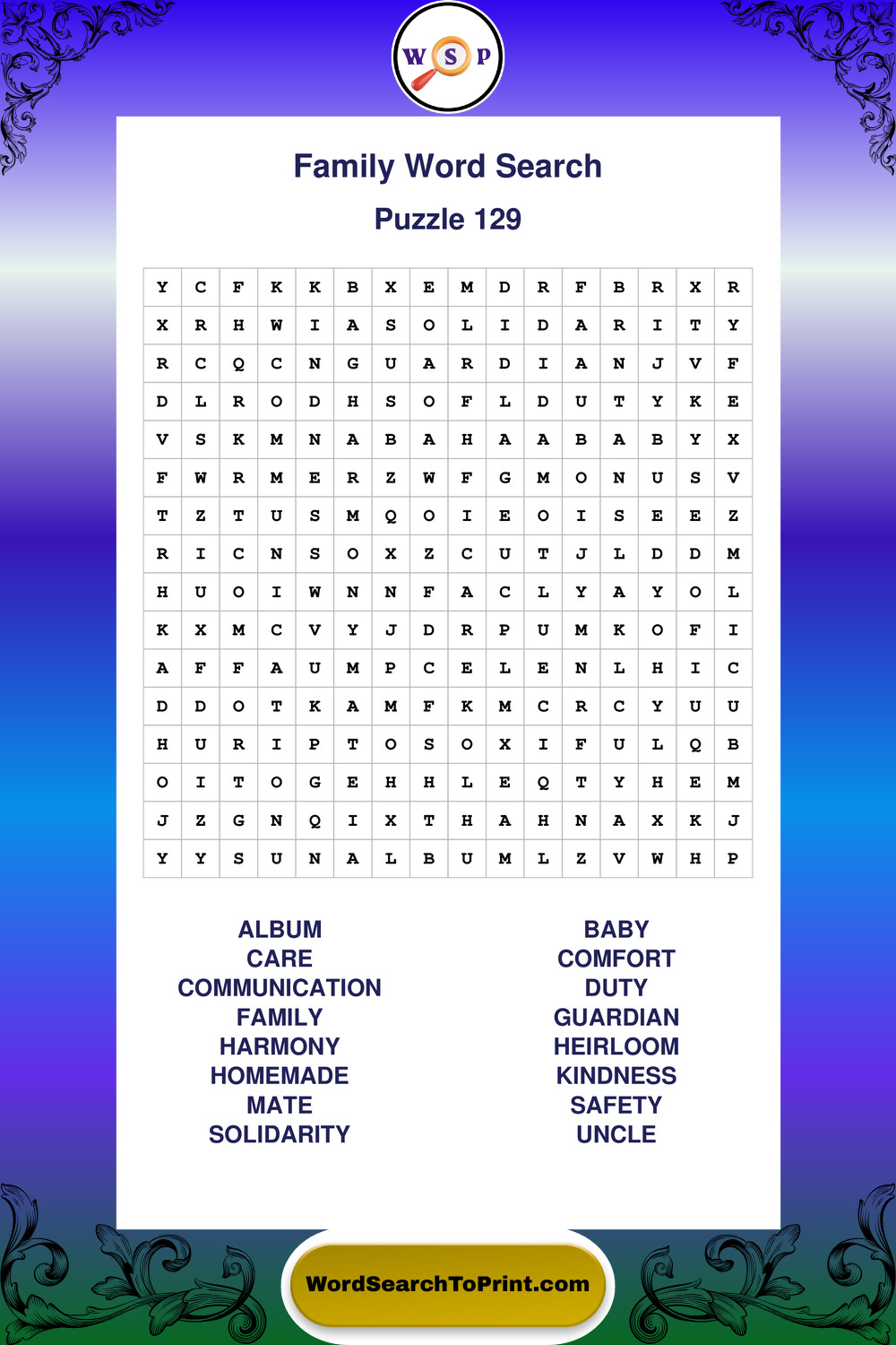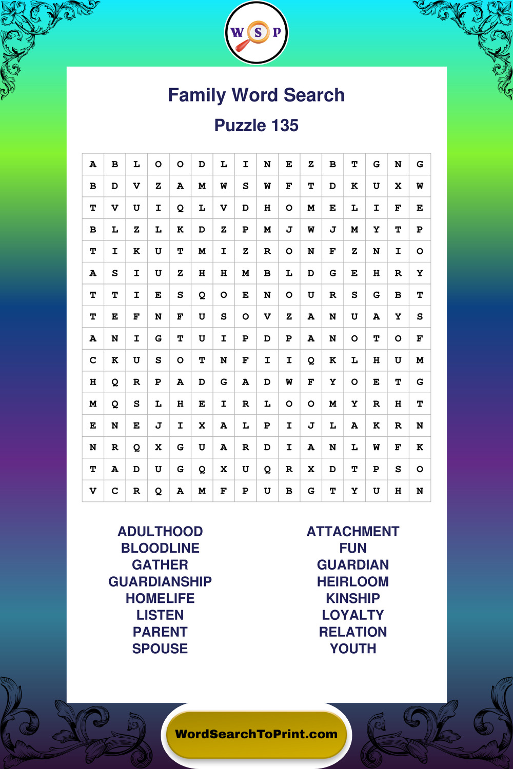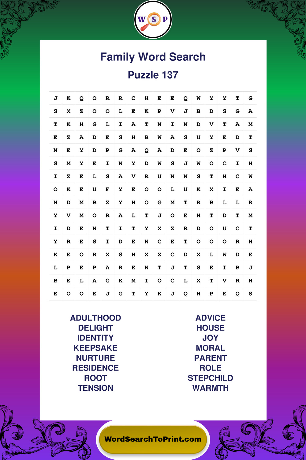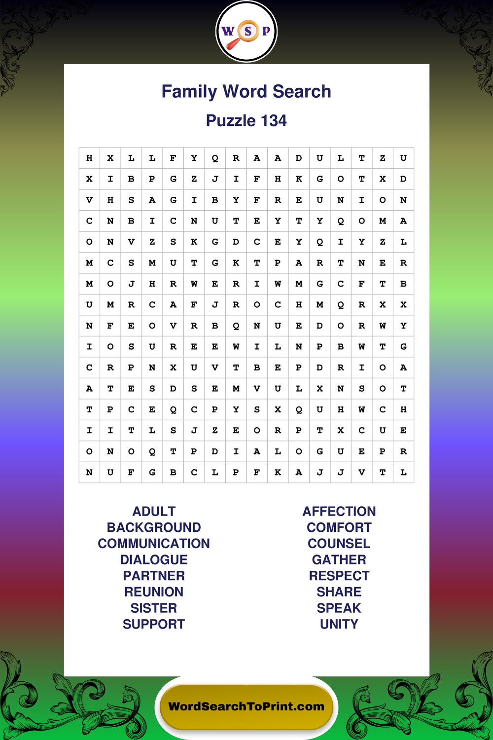Find easy-to-read large print Family wordsearches designed for peaceful focus and simple, enjoyable solving.