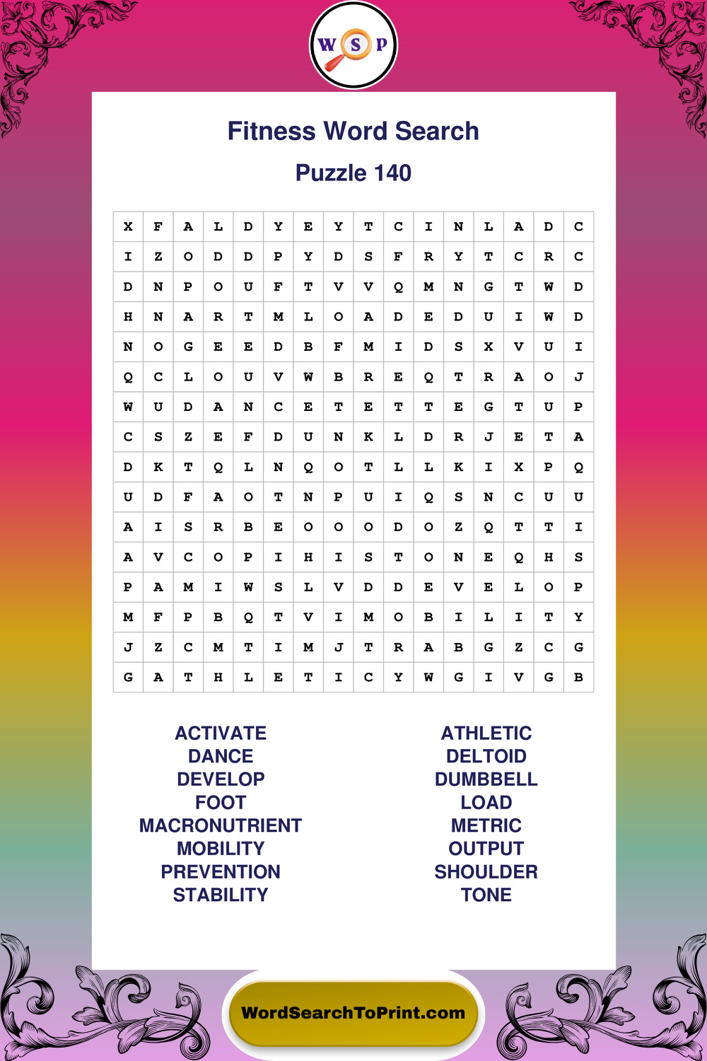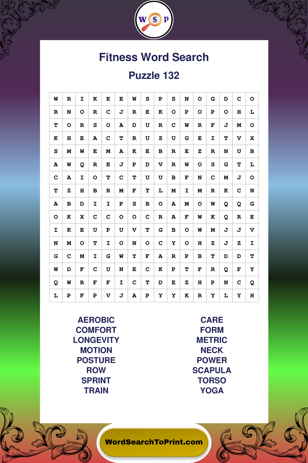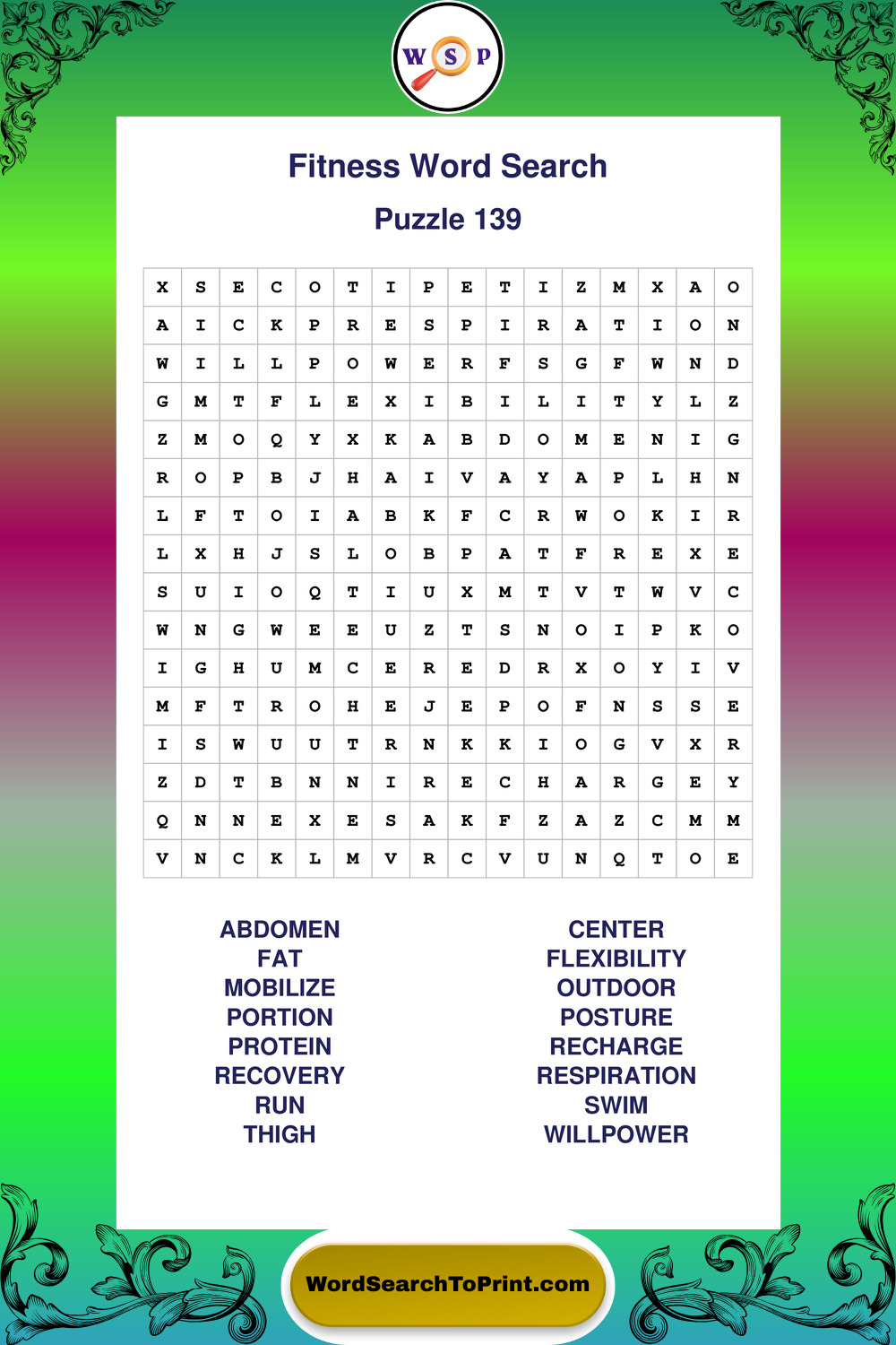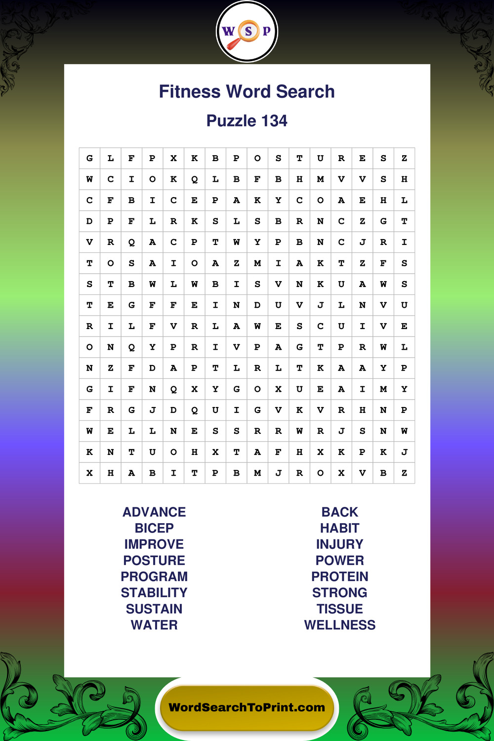 Enjoy these free large print Fitness wordsearches designed for easy reading and relaxed puzzle solving. Perfect for teens, adults, and seniors.