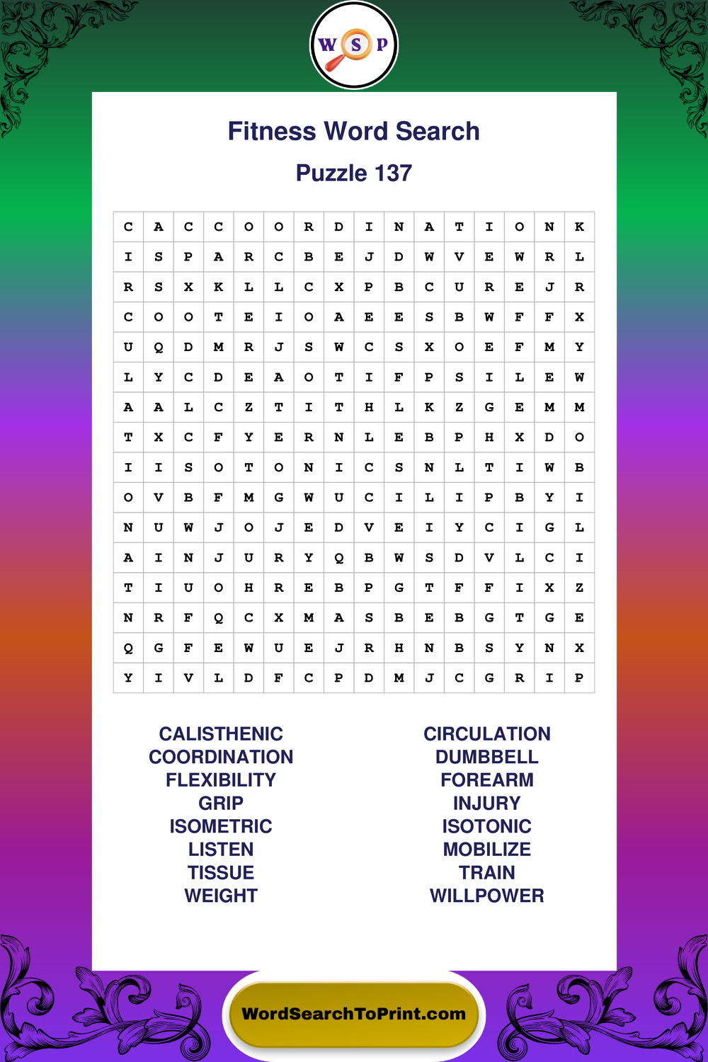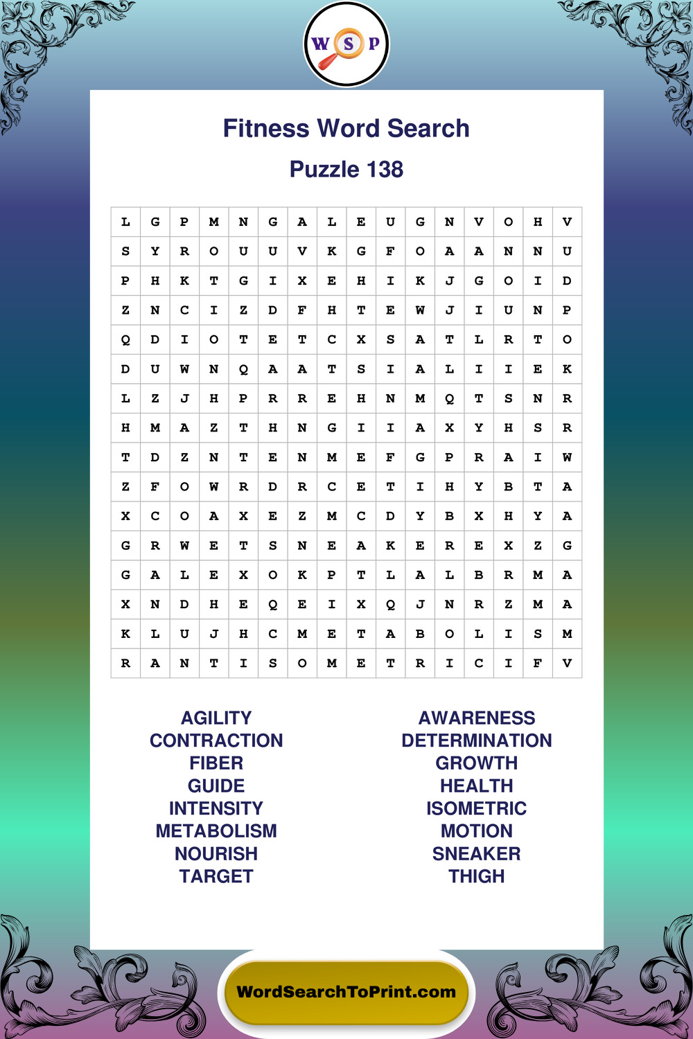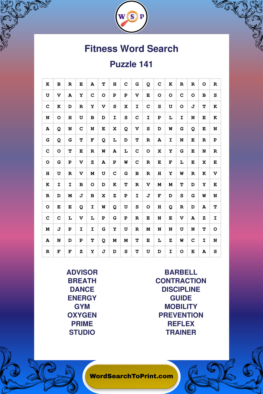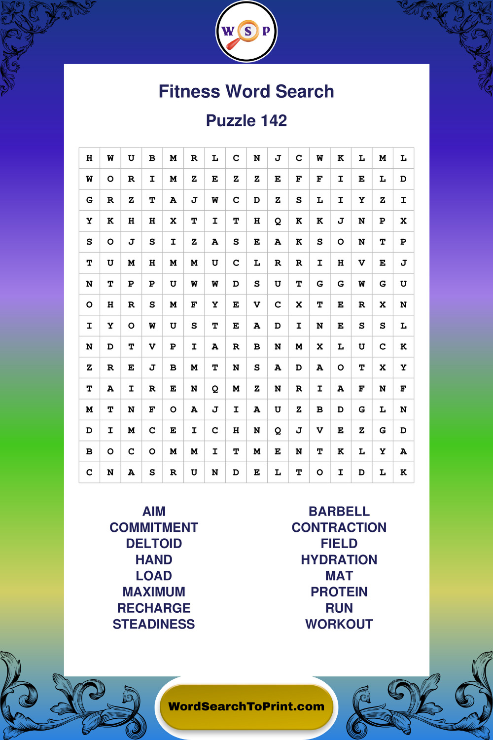 Enjoy these free large print Fitness wordsearches designed for easy reading and relaxed puzzle solving. Perfect for teens, adults, and seniors.