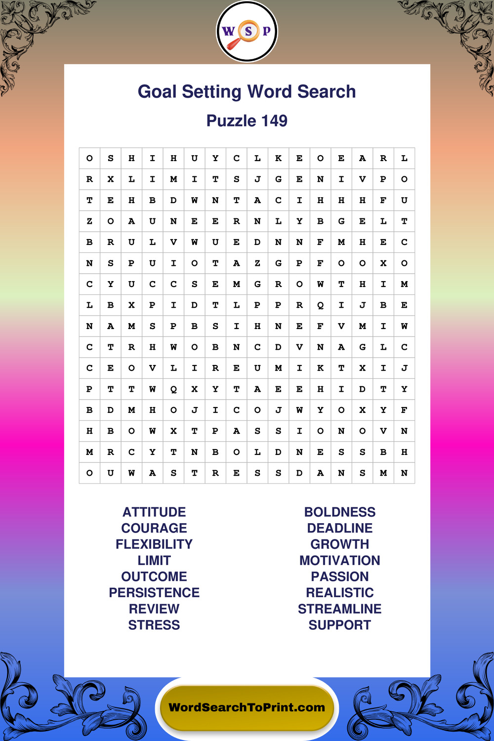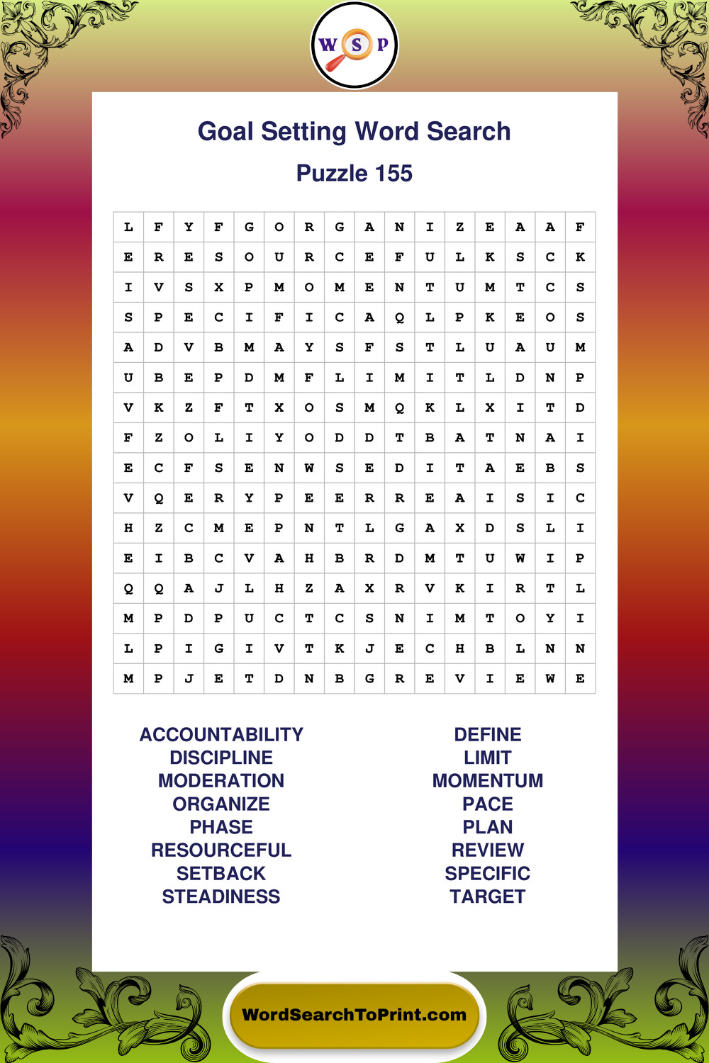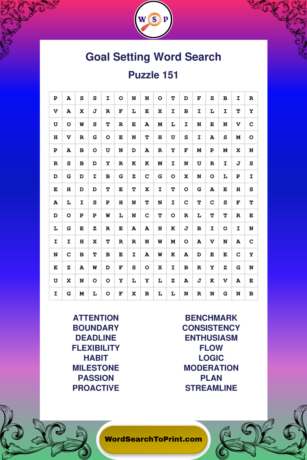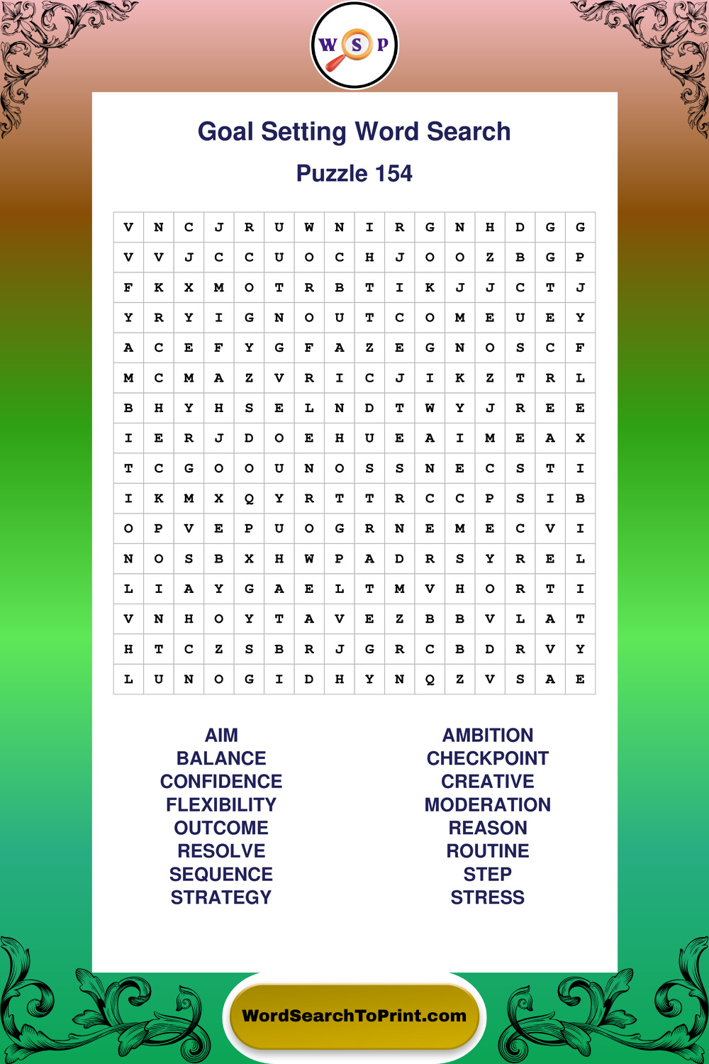 Discover printable large print Goal Setting wordsearches made for relaxed enjoyment and clear, uncluttered solving.