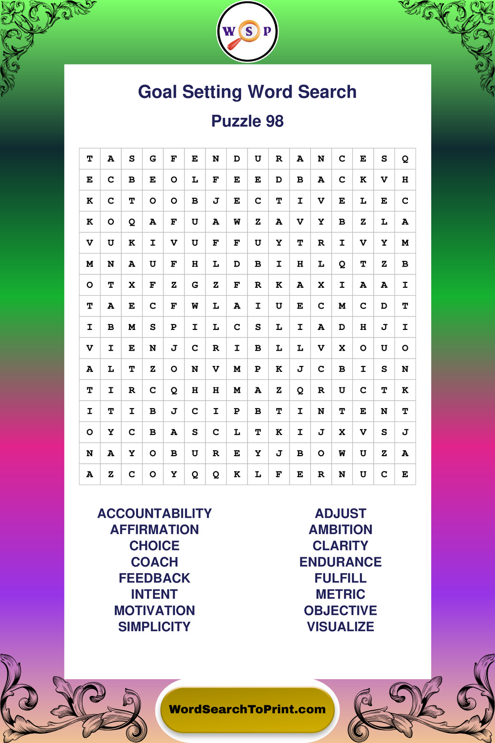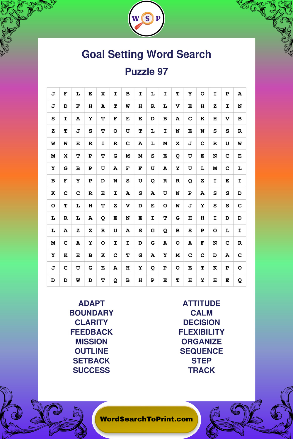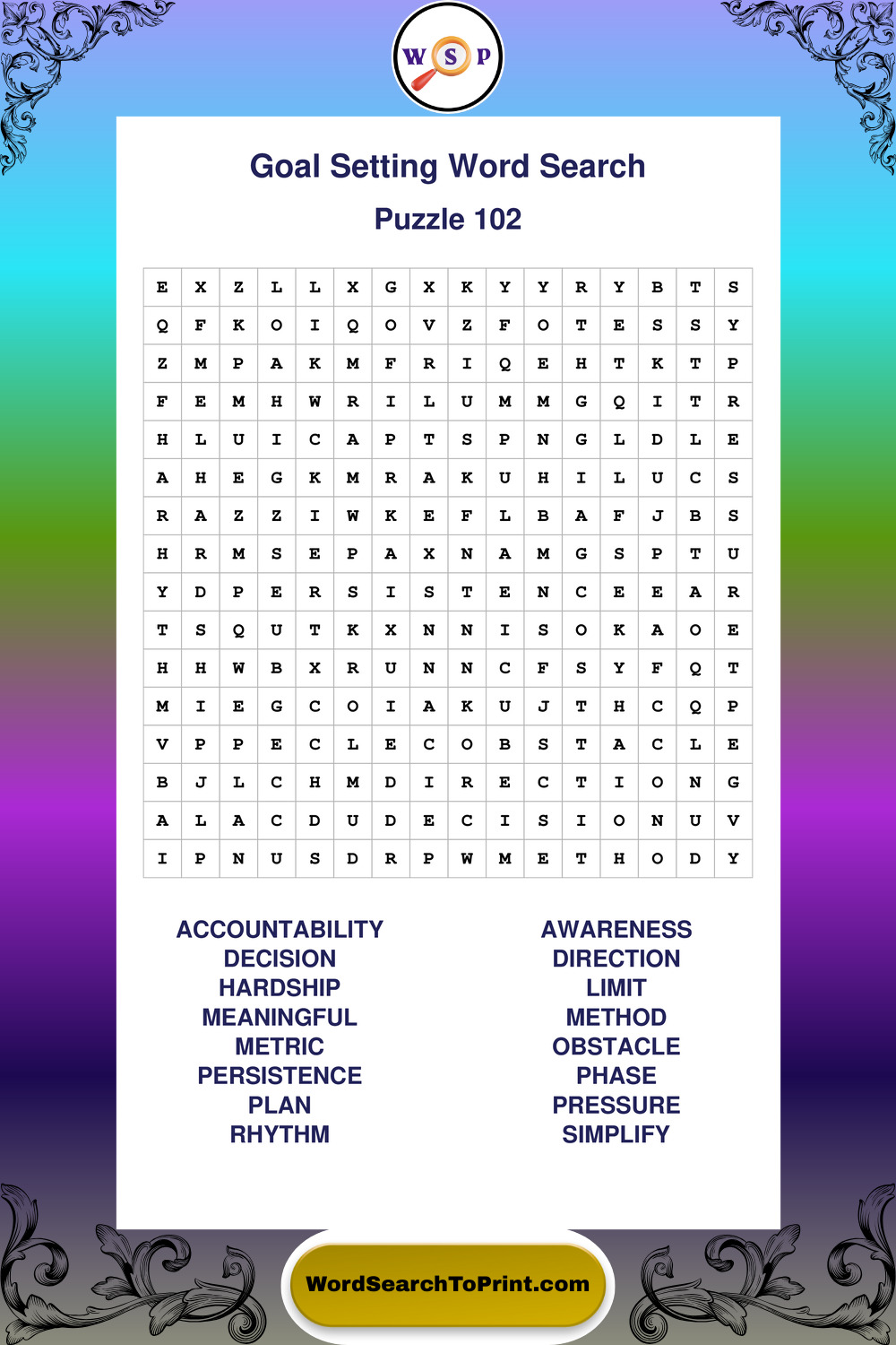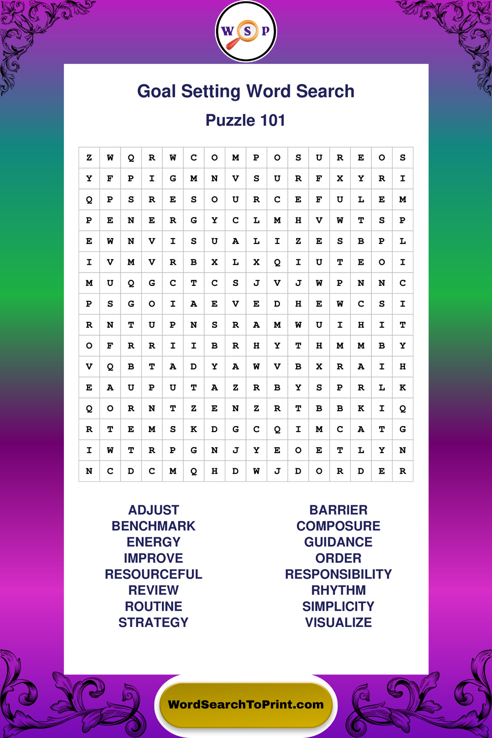 Discover printable large print Goal Setting wordsearches made for relaxed enjoyment and clear, uncluttered solving.