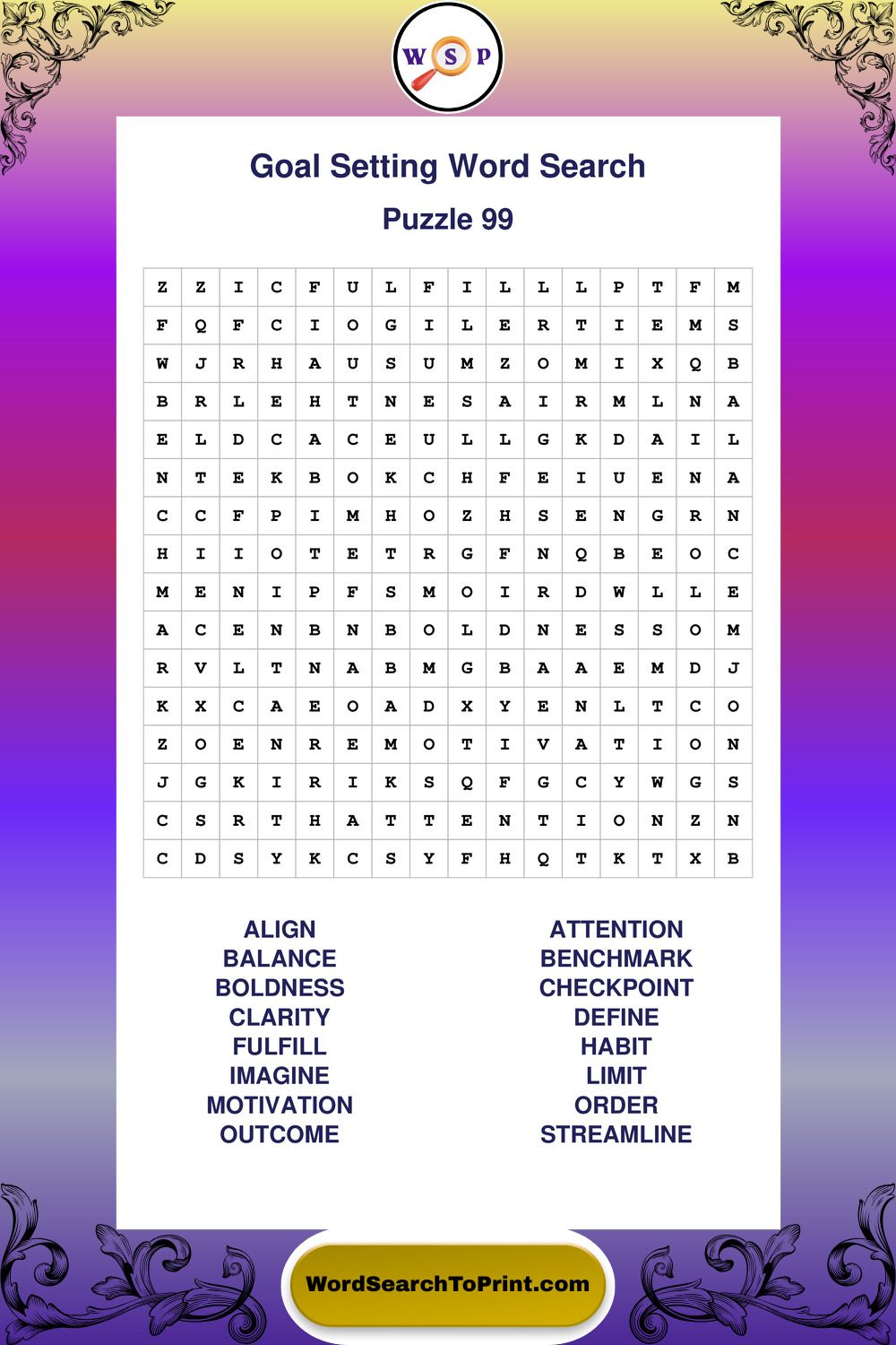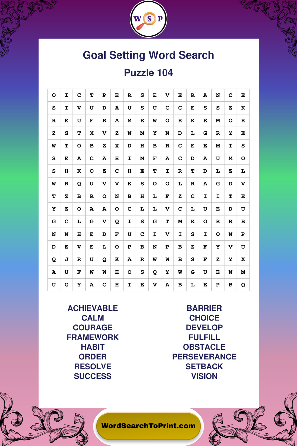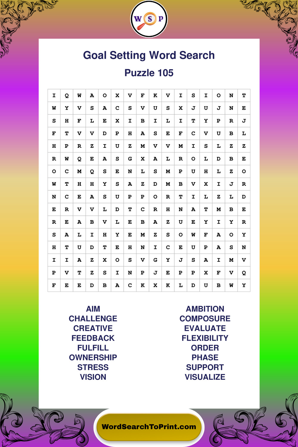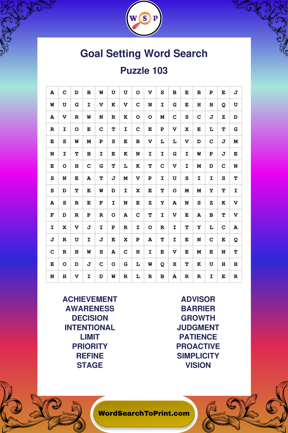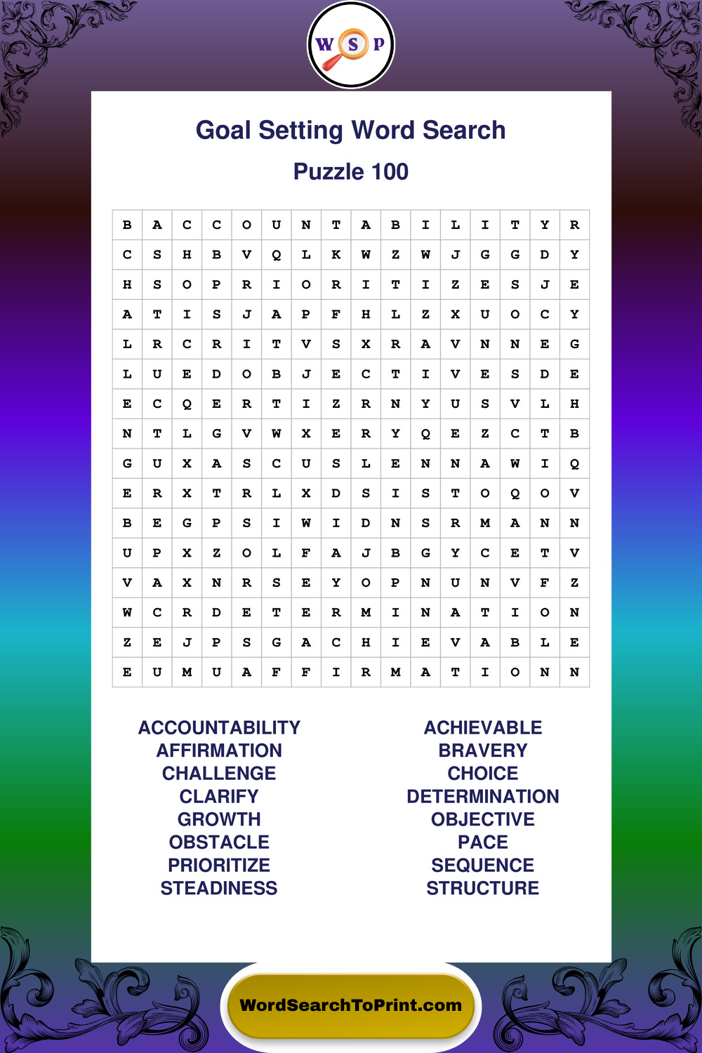 Discover printable large print Goal Setting wordsearches made for relaxed enjoyment and clear, uncluttered solving.