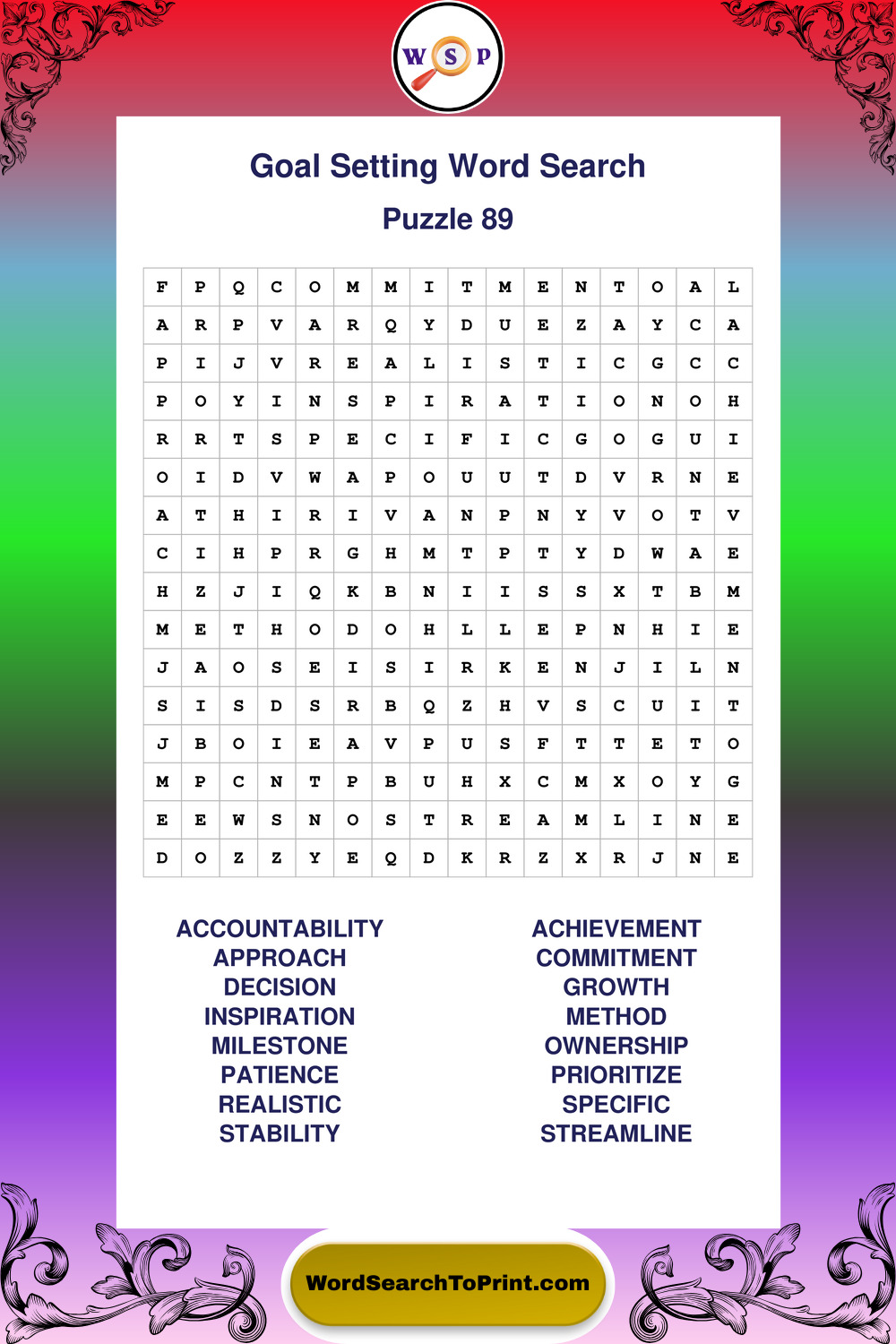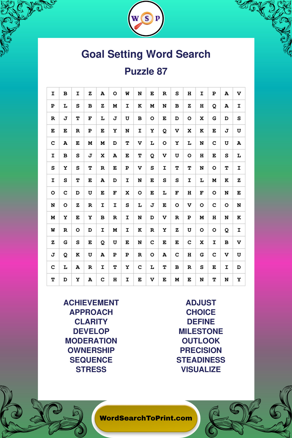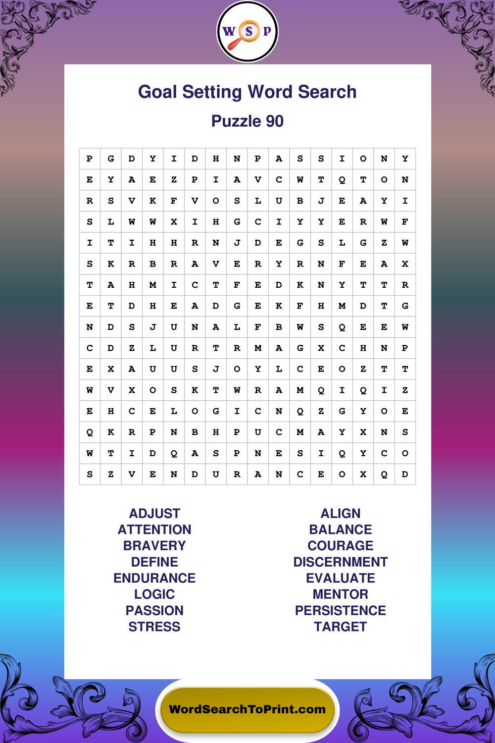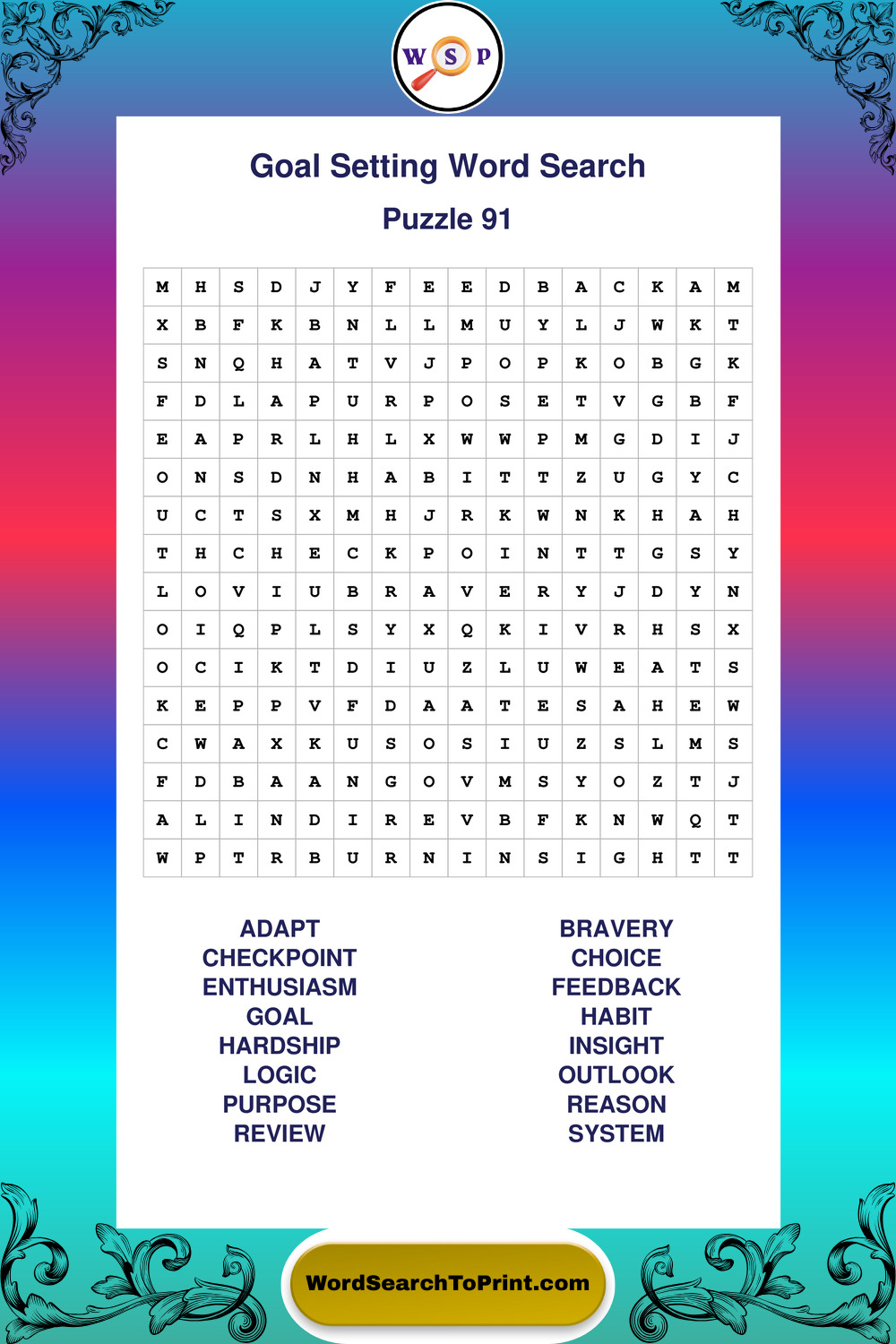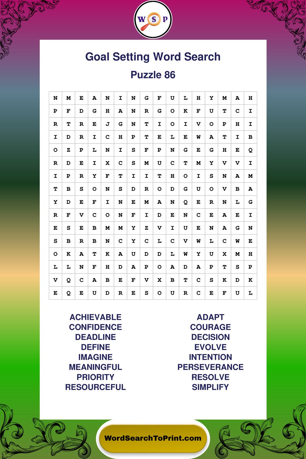 Discover printable large print Goal Setting wordsearches made for relaxed enjoyment and clear, uncluttered solving.
