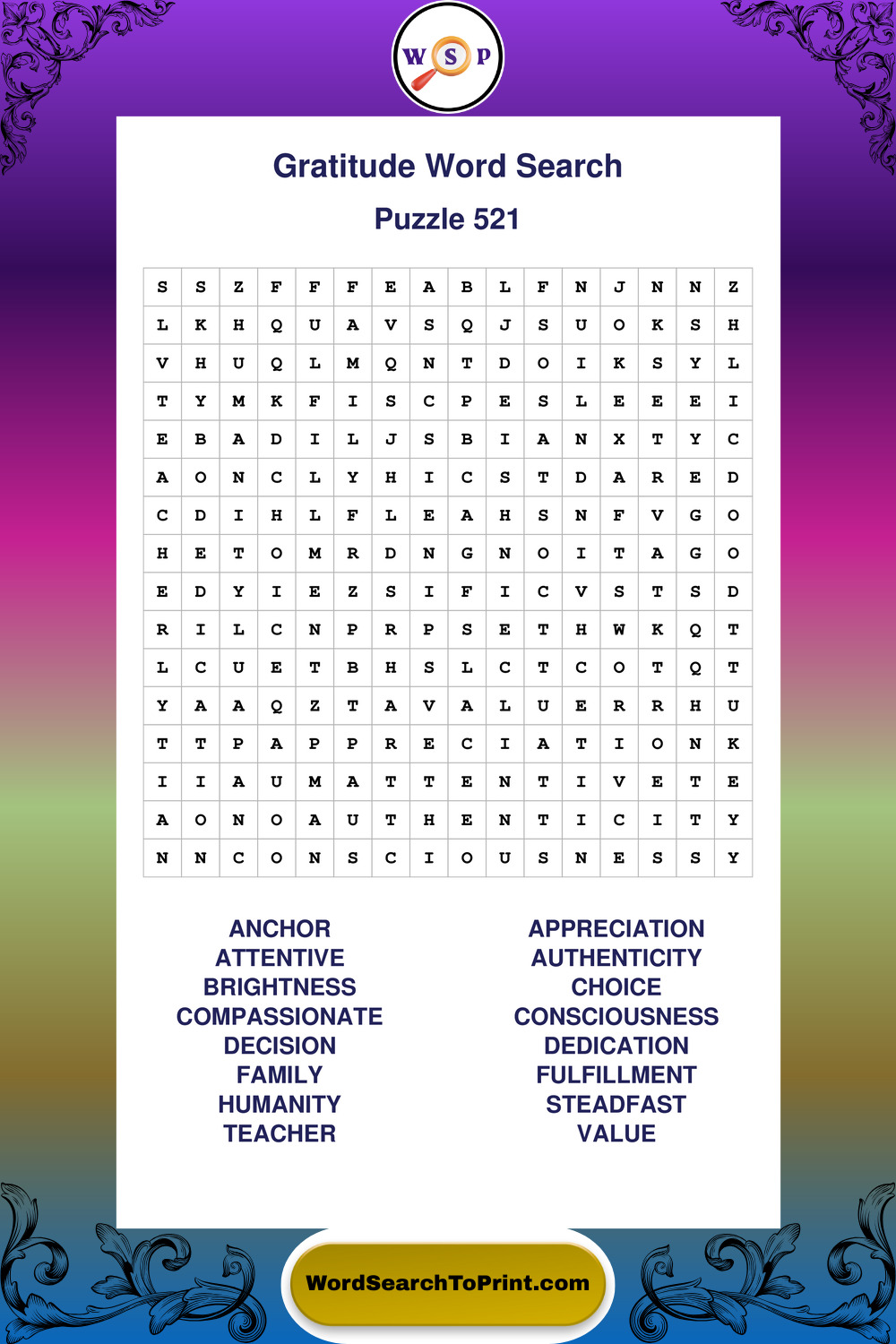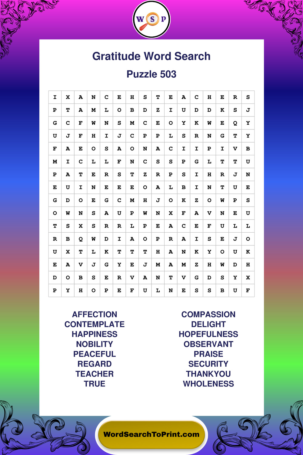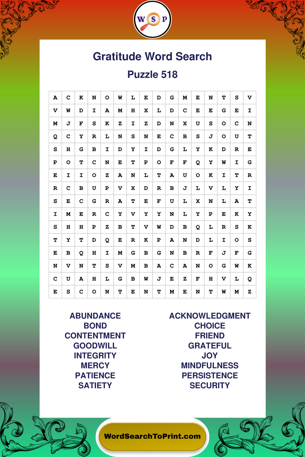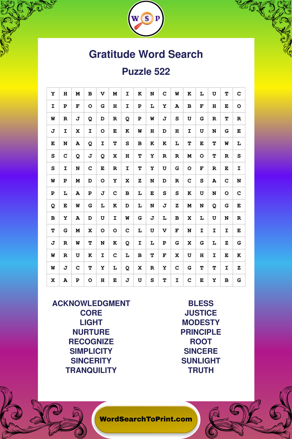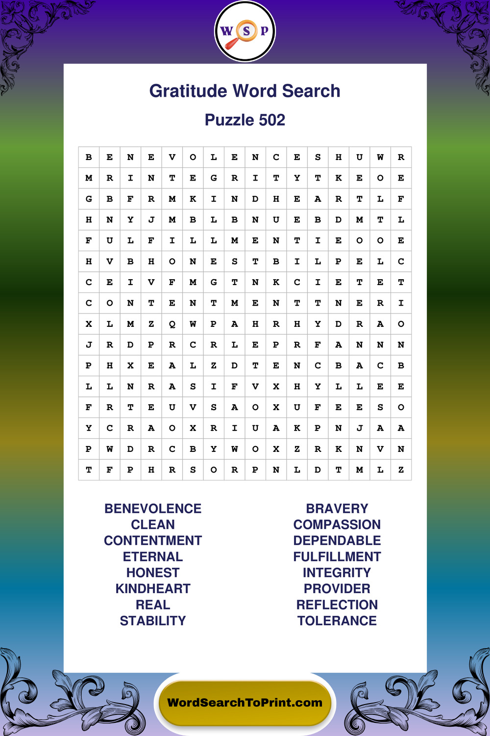 Browse our free large print Gratitude wordsearches below. All puzzles are printable and include solutions.