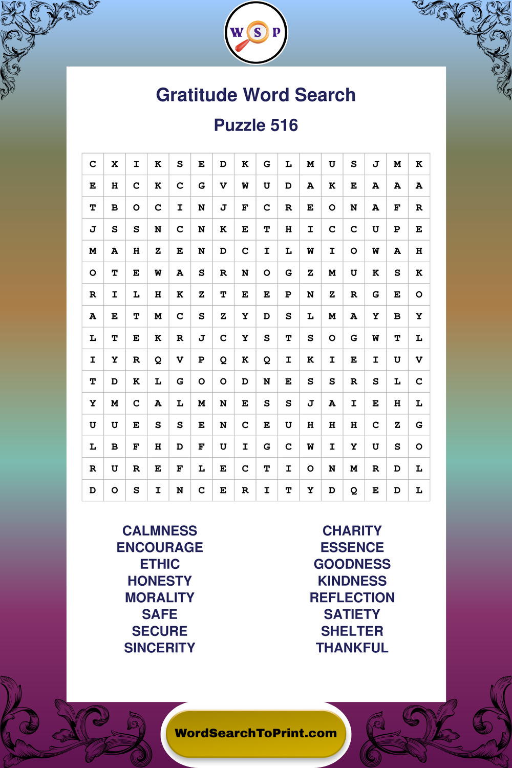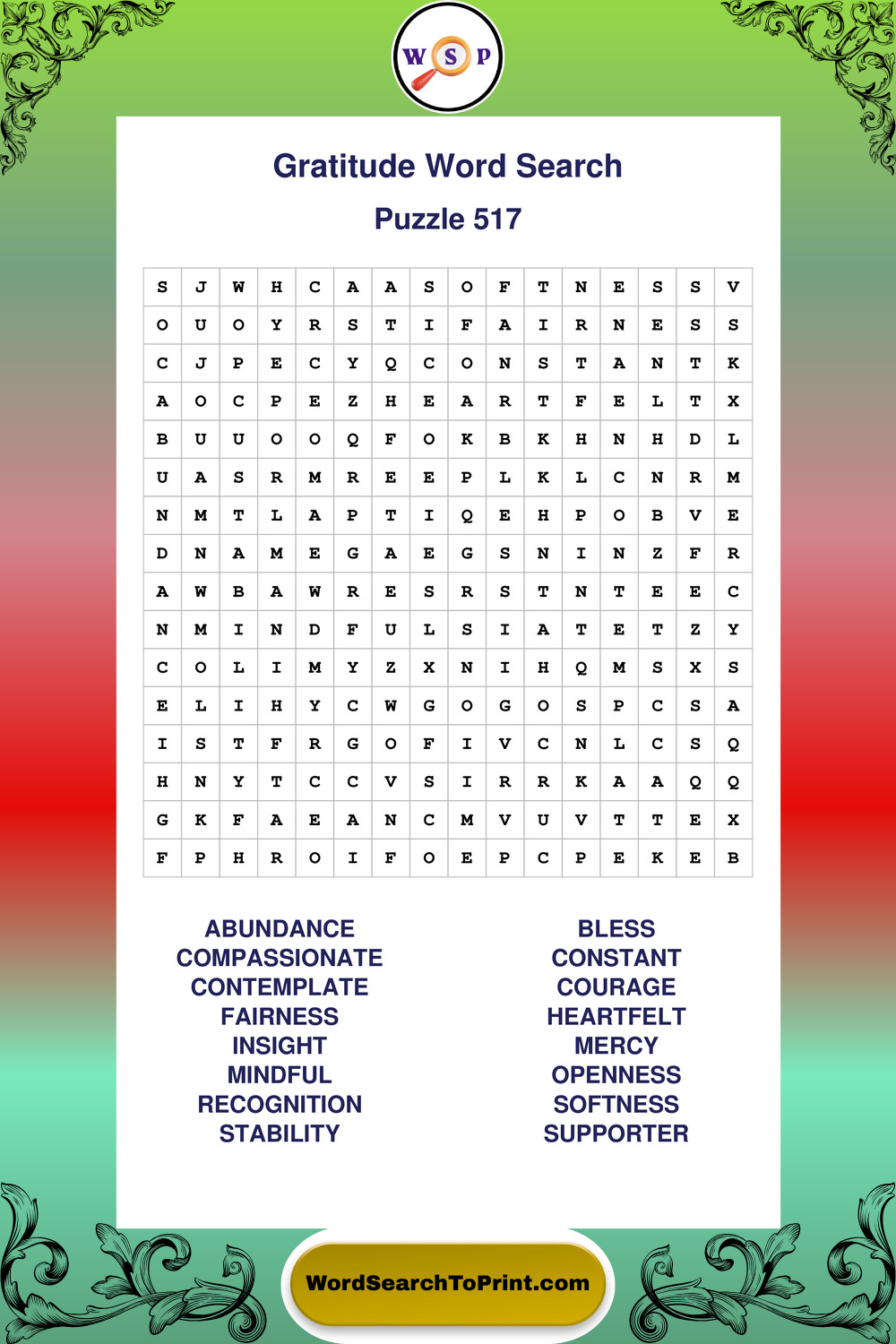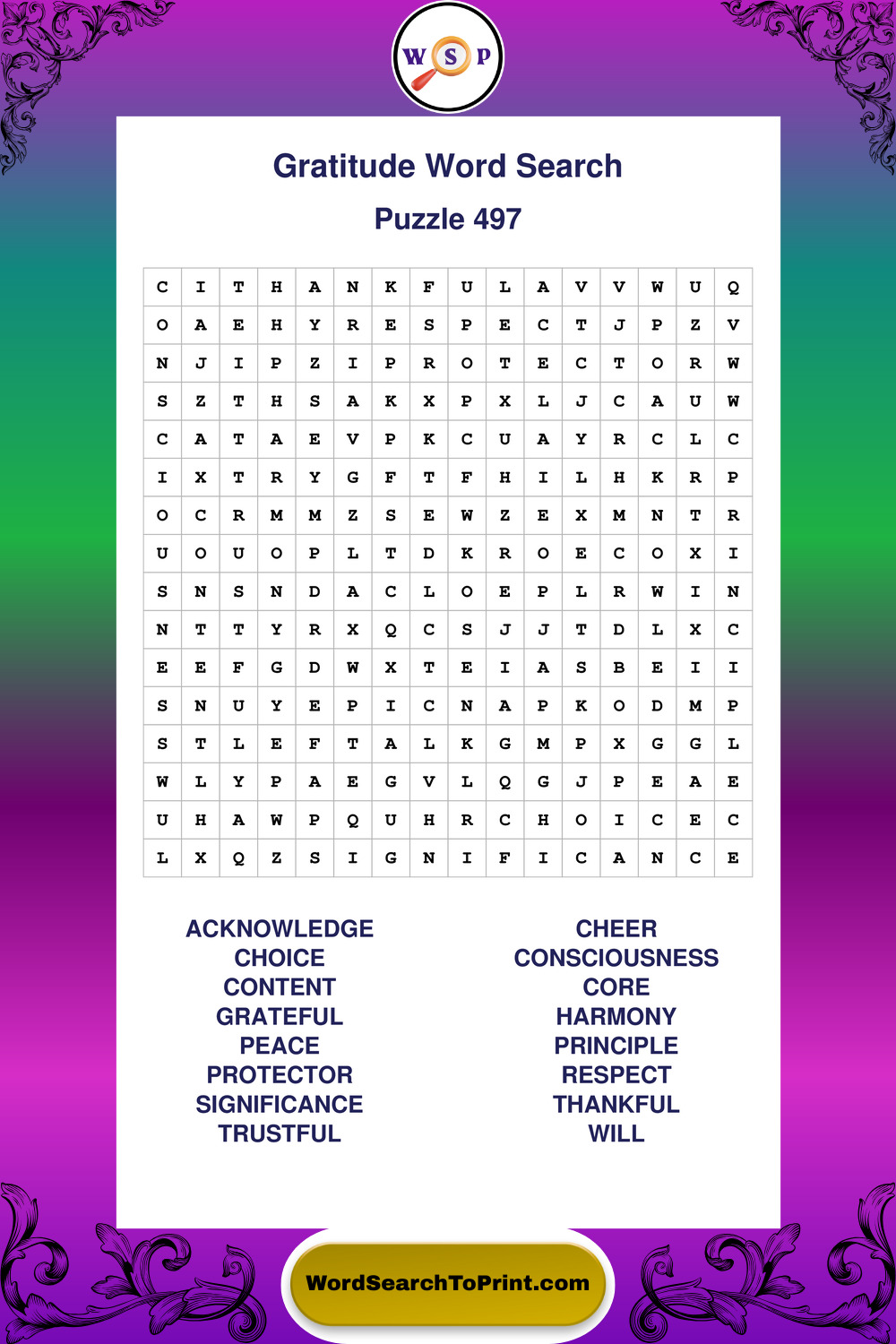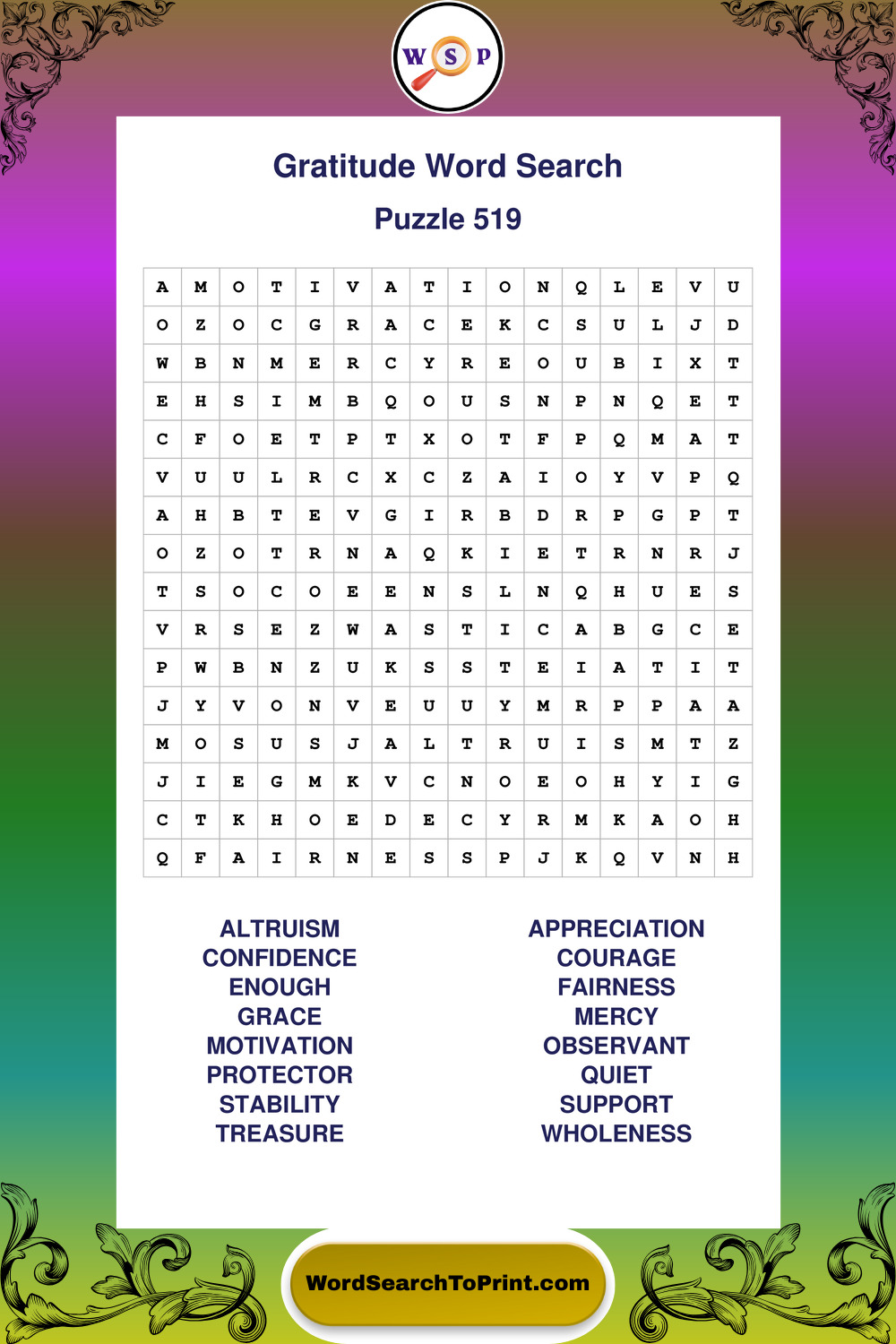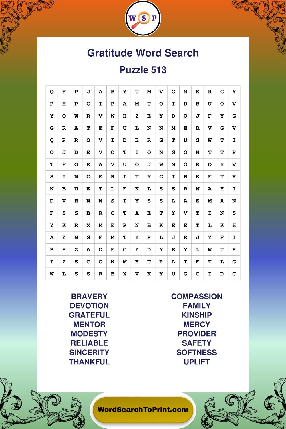Browse our free large print Gratitude wordsearches below. All puzzles are printable and include solutions.
