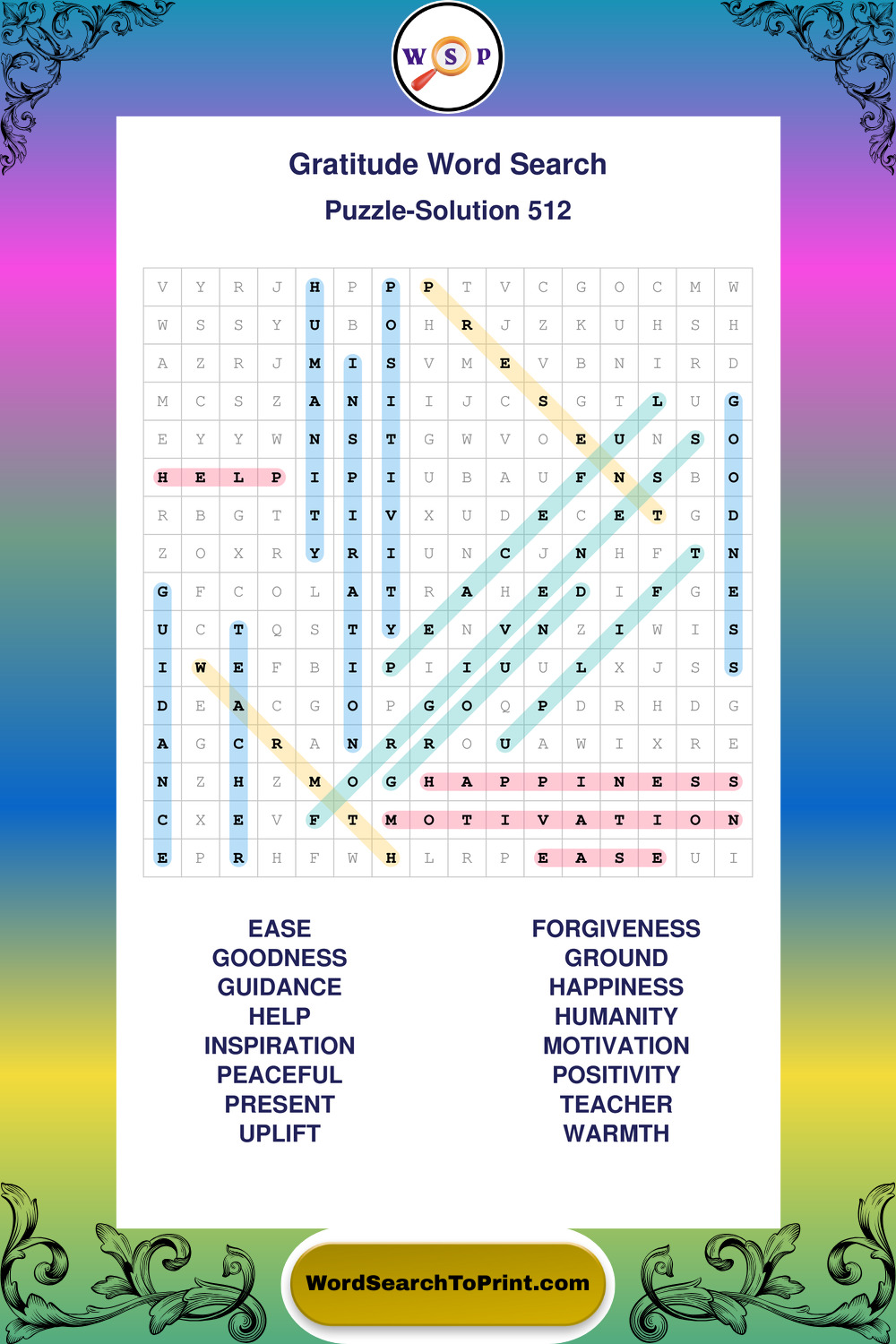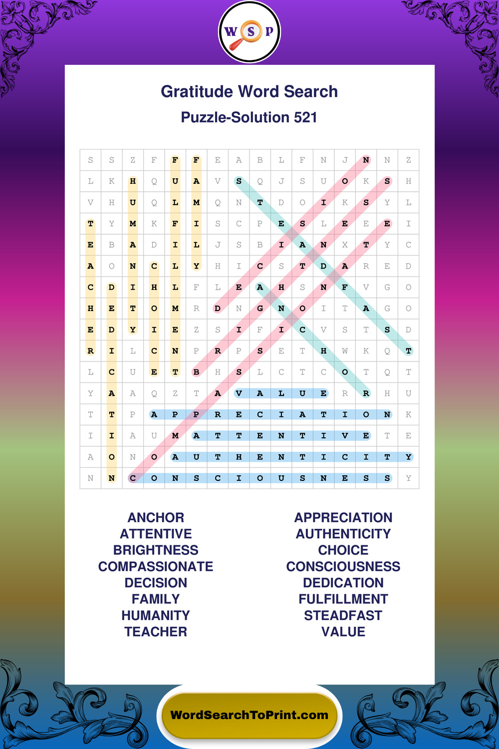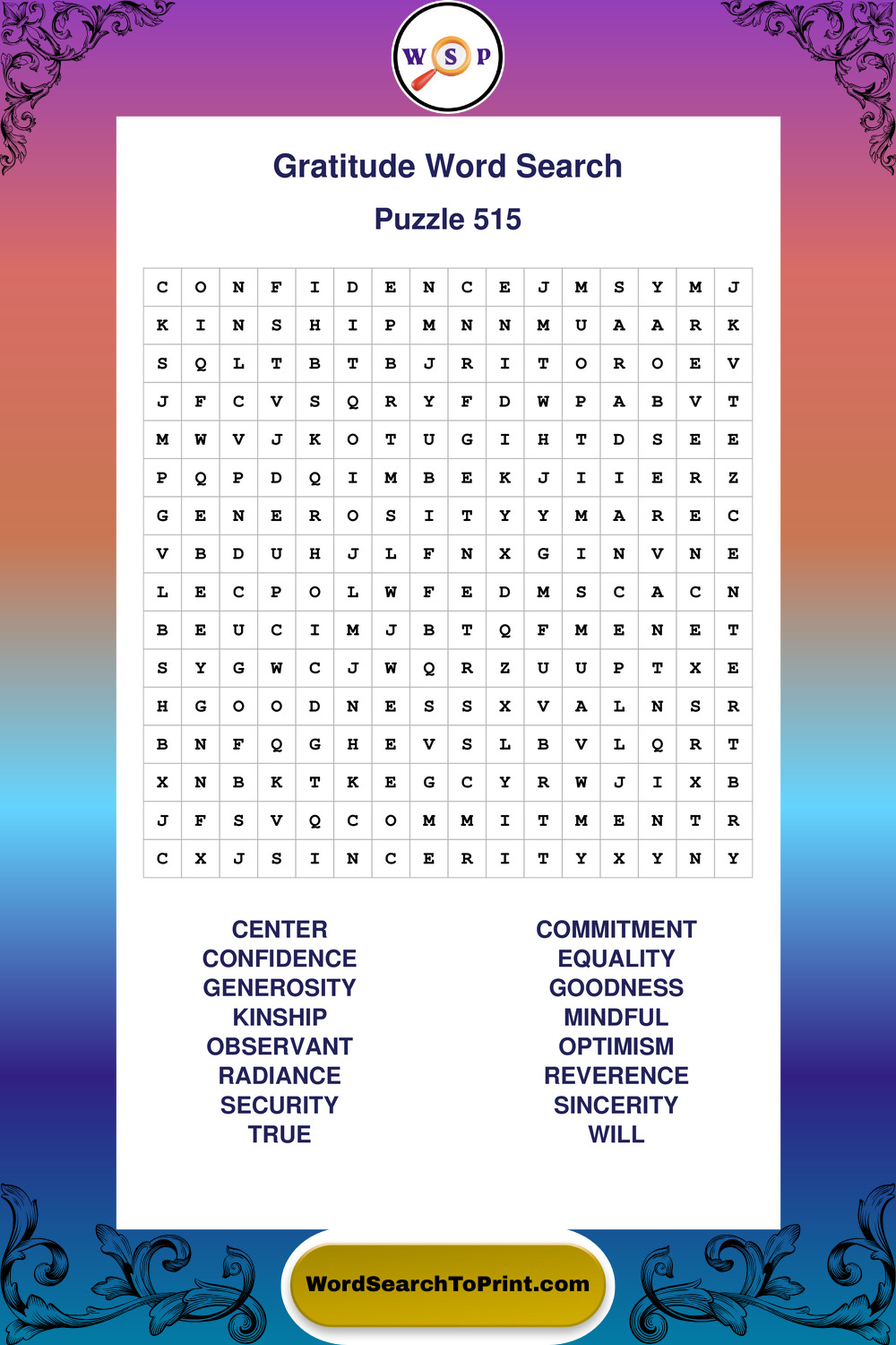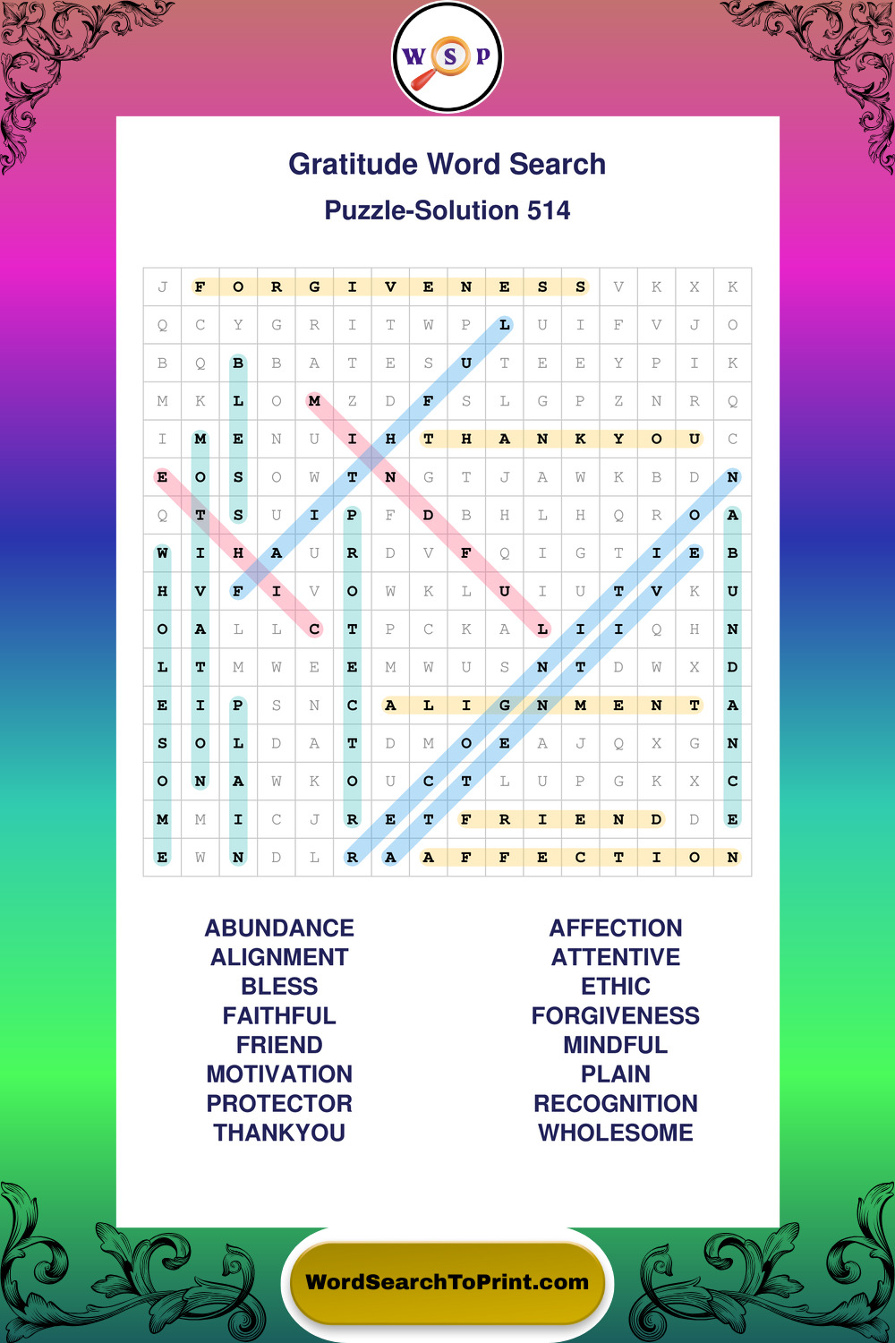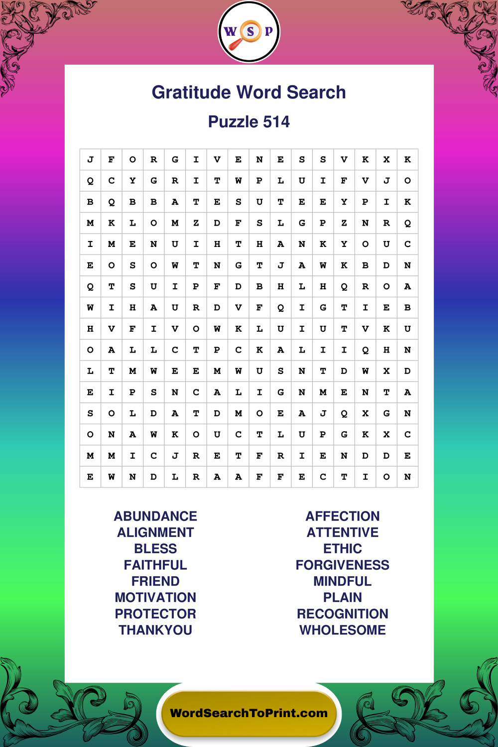 Browse our free large print Gratitude wordsearches below. All puzzles are printable and include solutions.