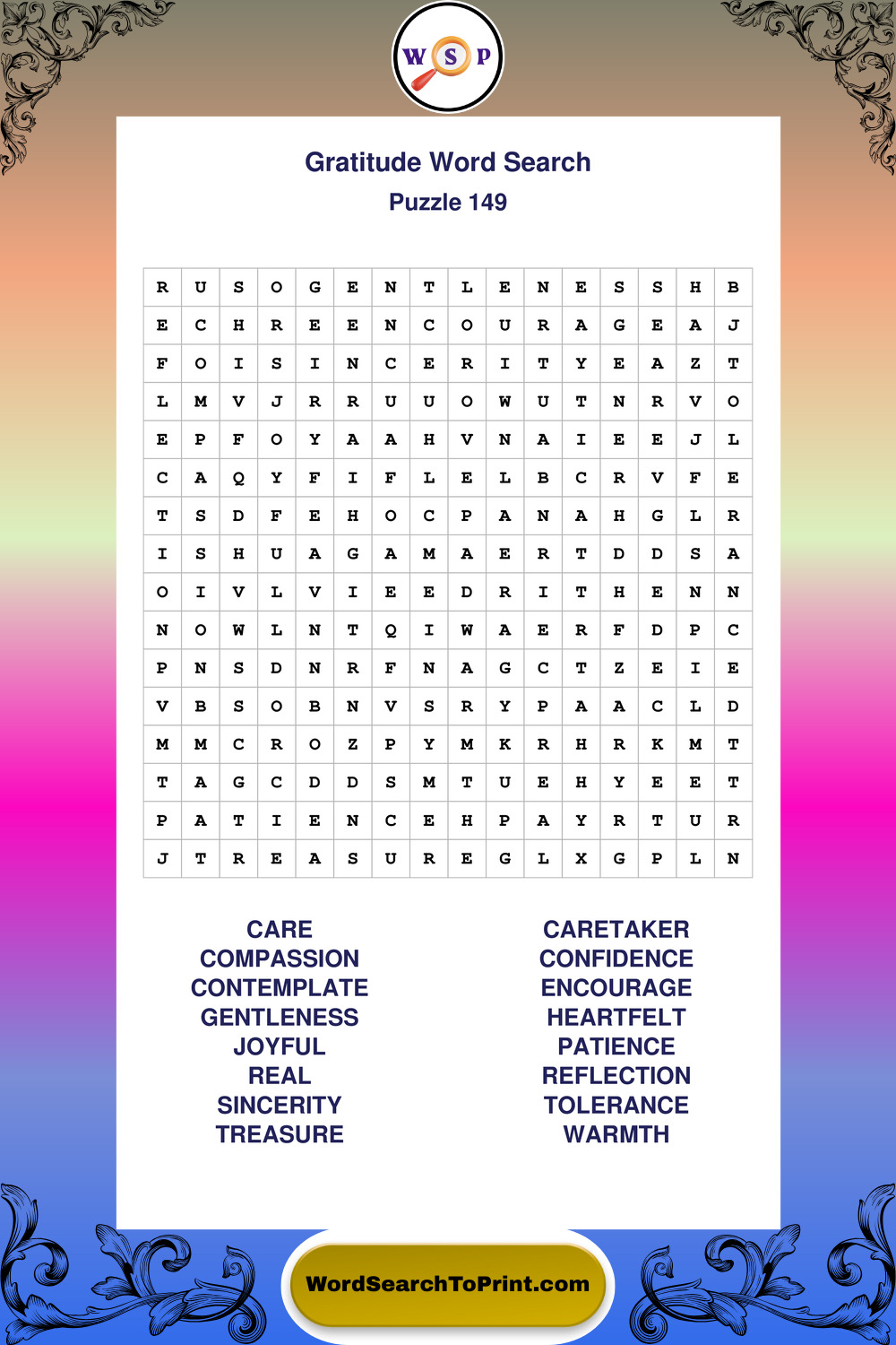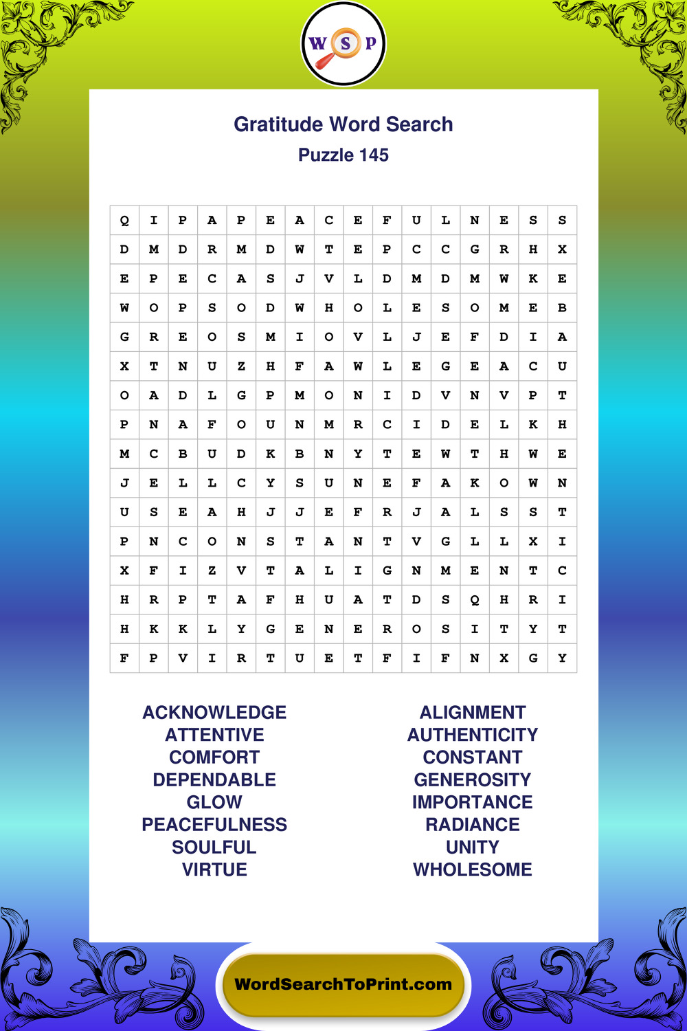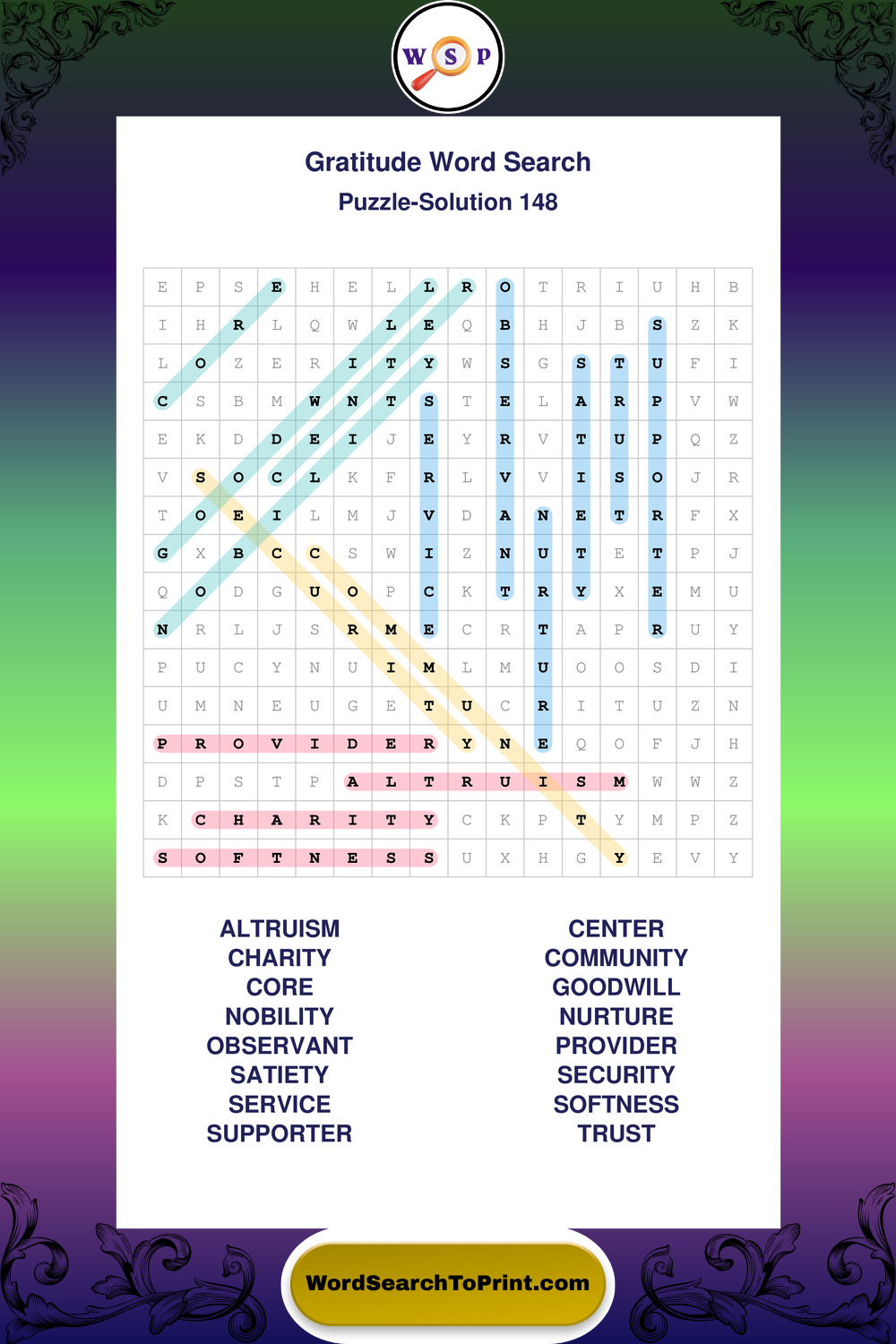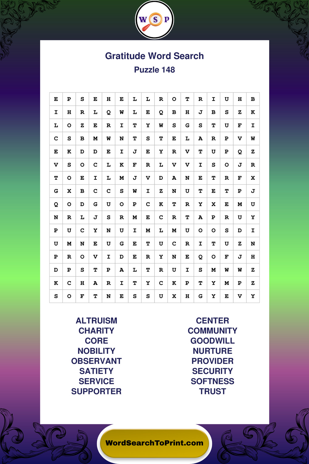 Browse our free large print Gratitude wordsearches below. All puzzles are printable and include solutions.