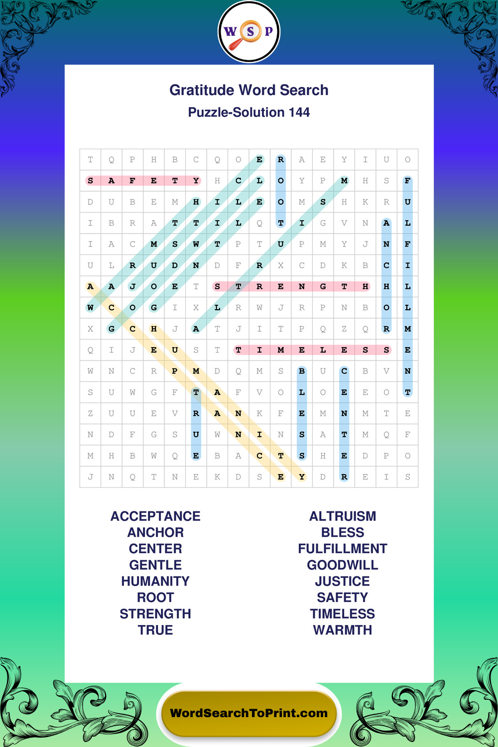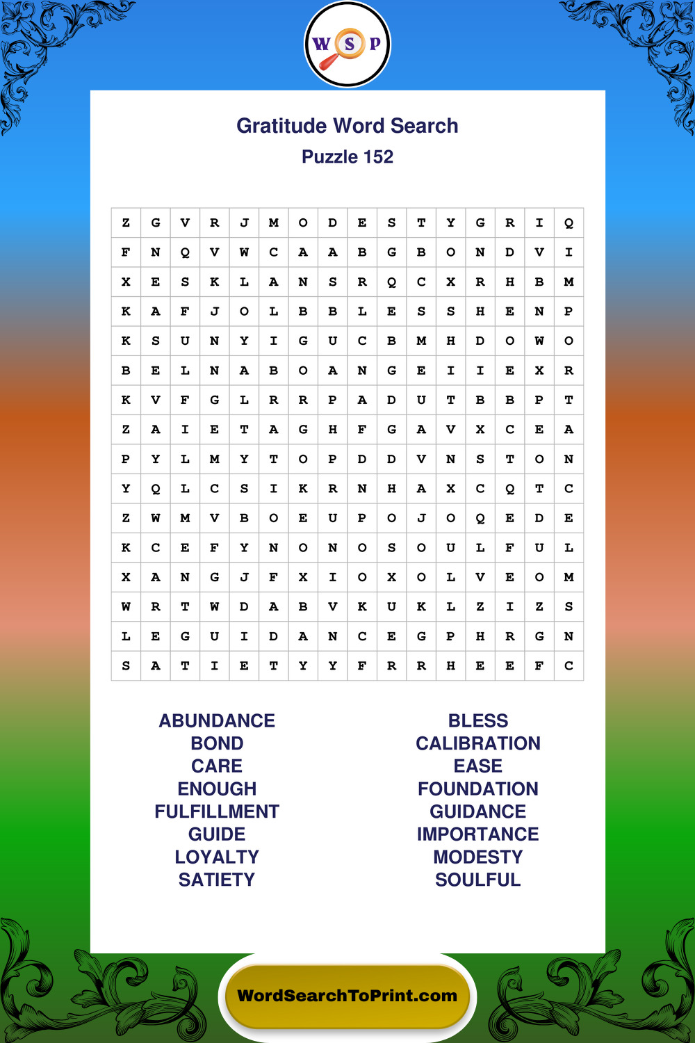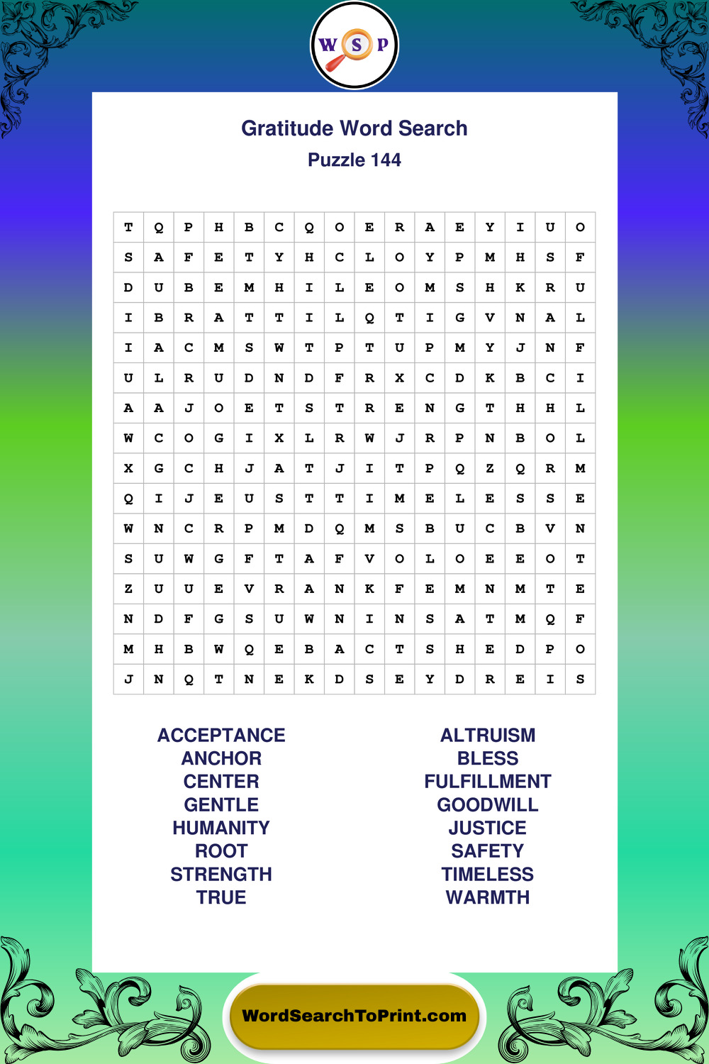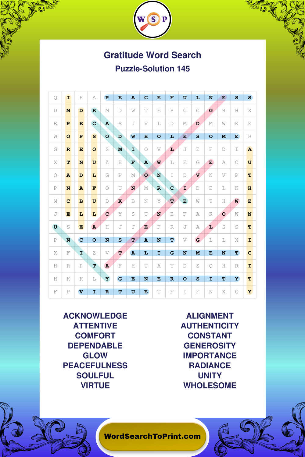 Browse our free large print Gratitude wordsearches below. All puzzles are printable and include solutions.
