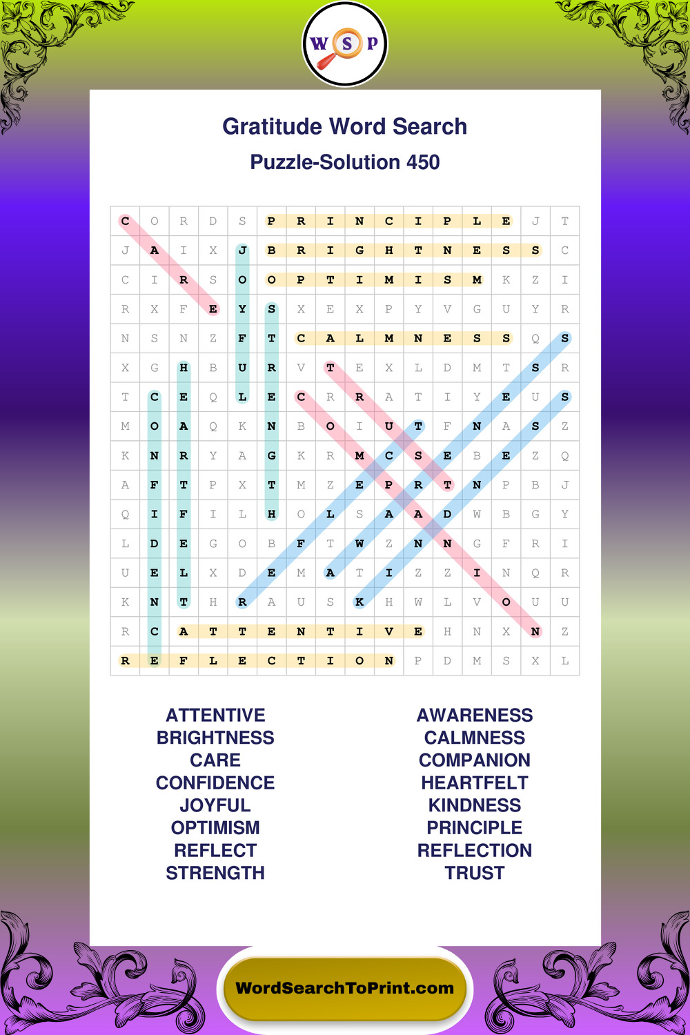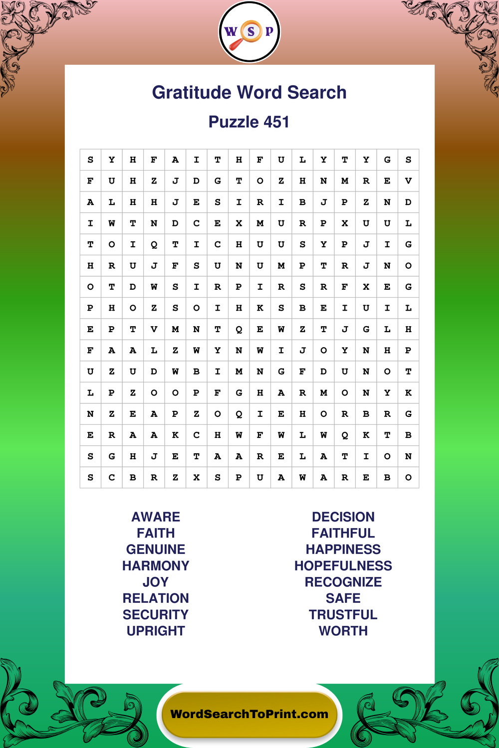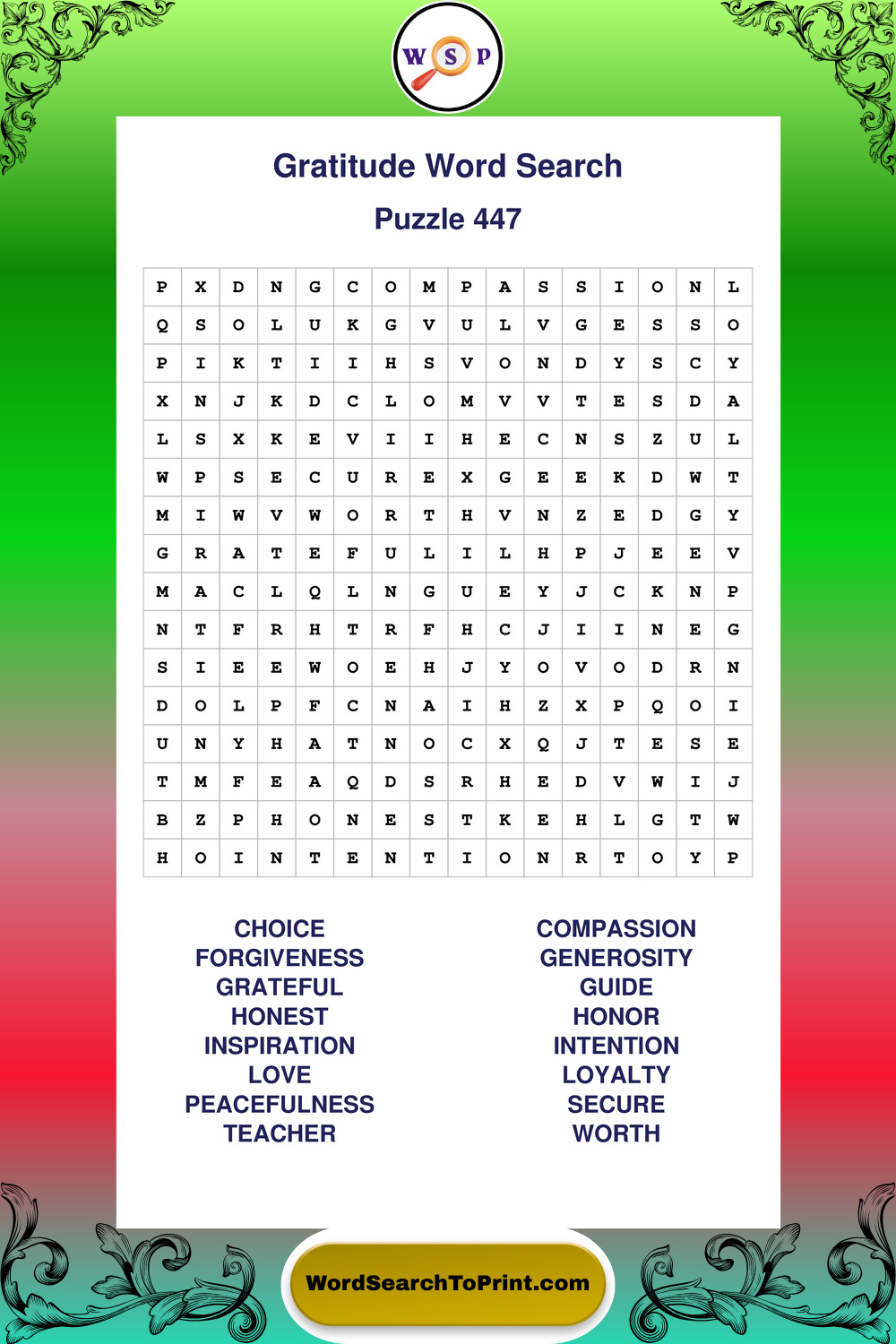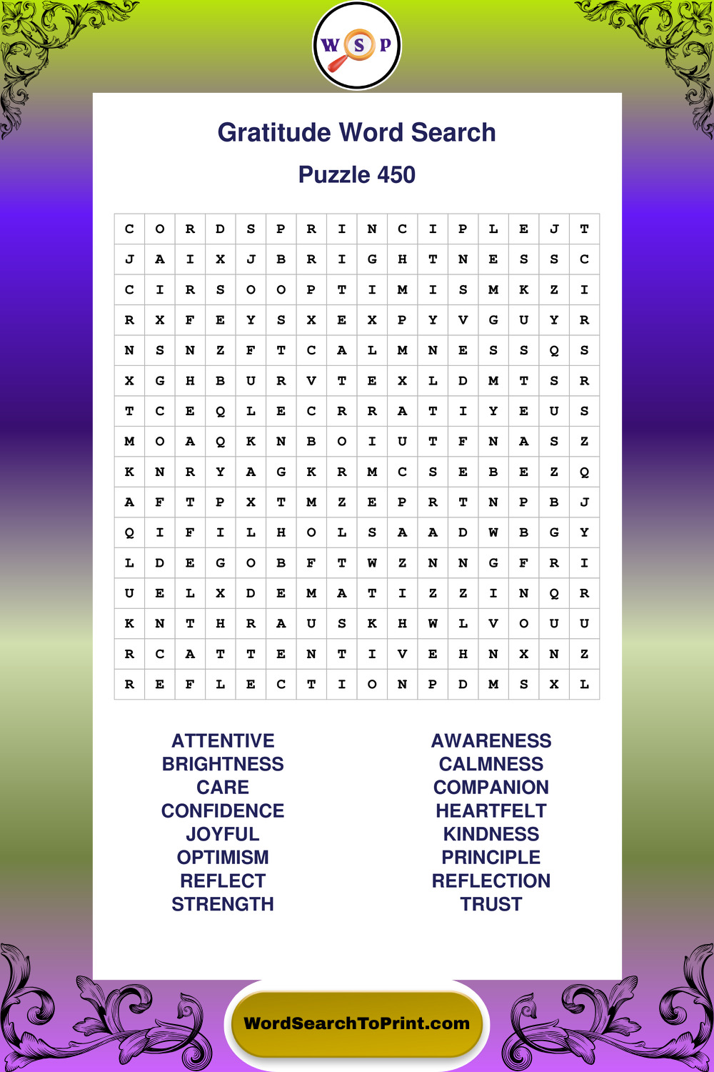 Browse our free large print Gratitude wordsearches below. All puzzles are printable and include solutions.