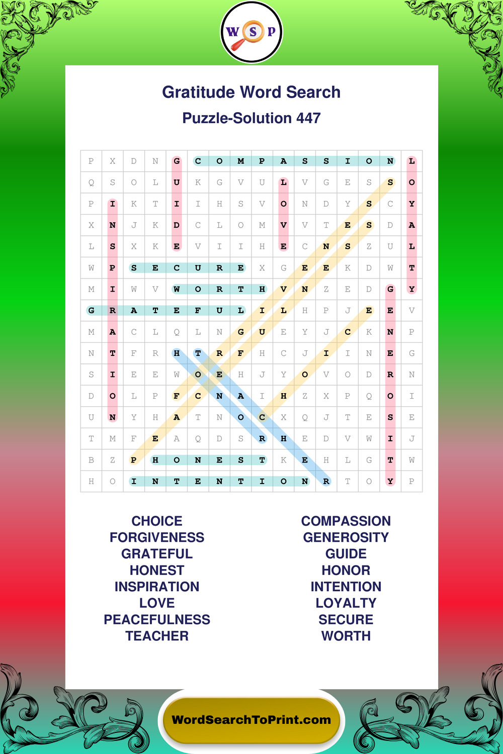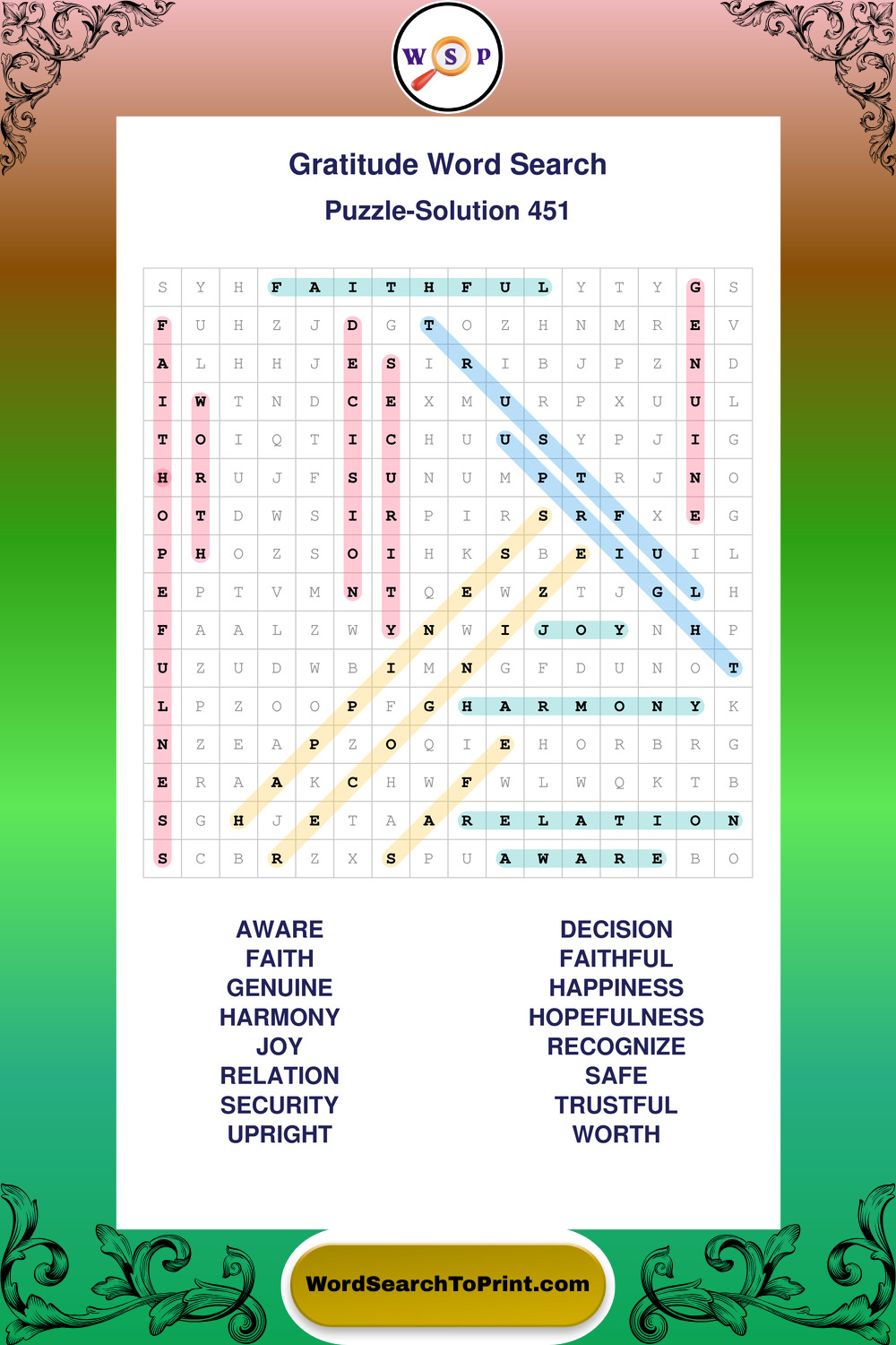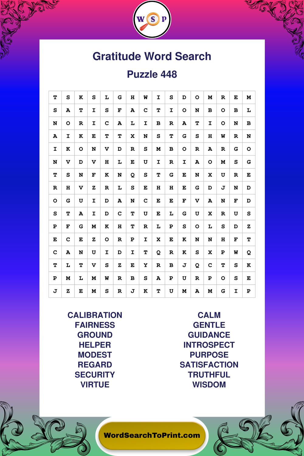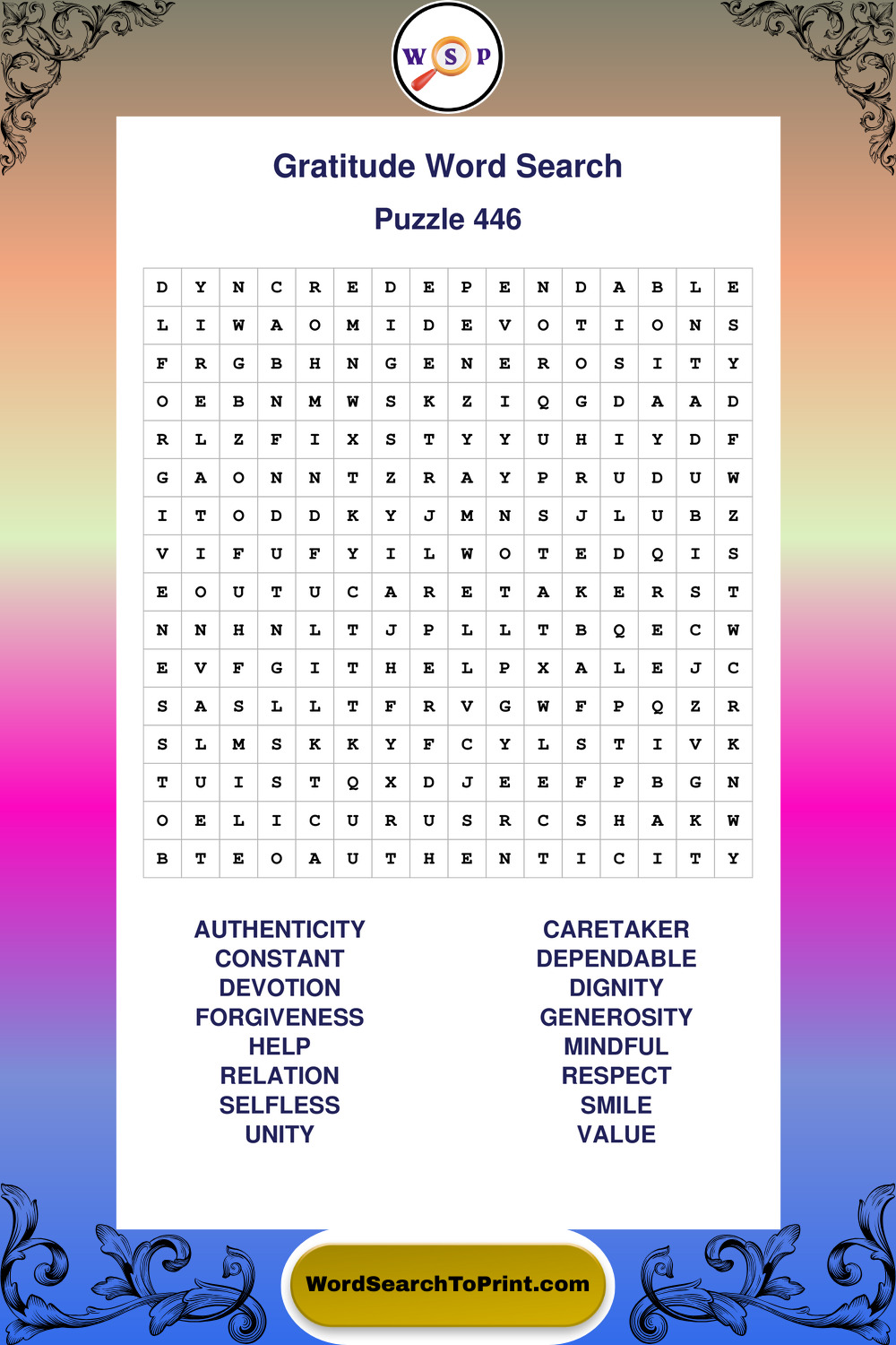 Browse our free large print Gratitude wordsearches below. All puzzles are printable and include solutions.