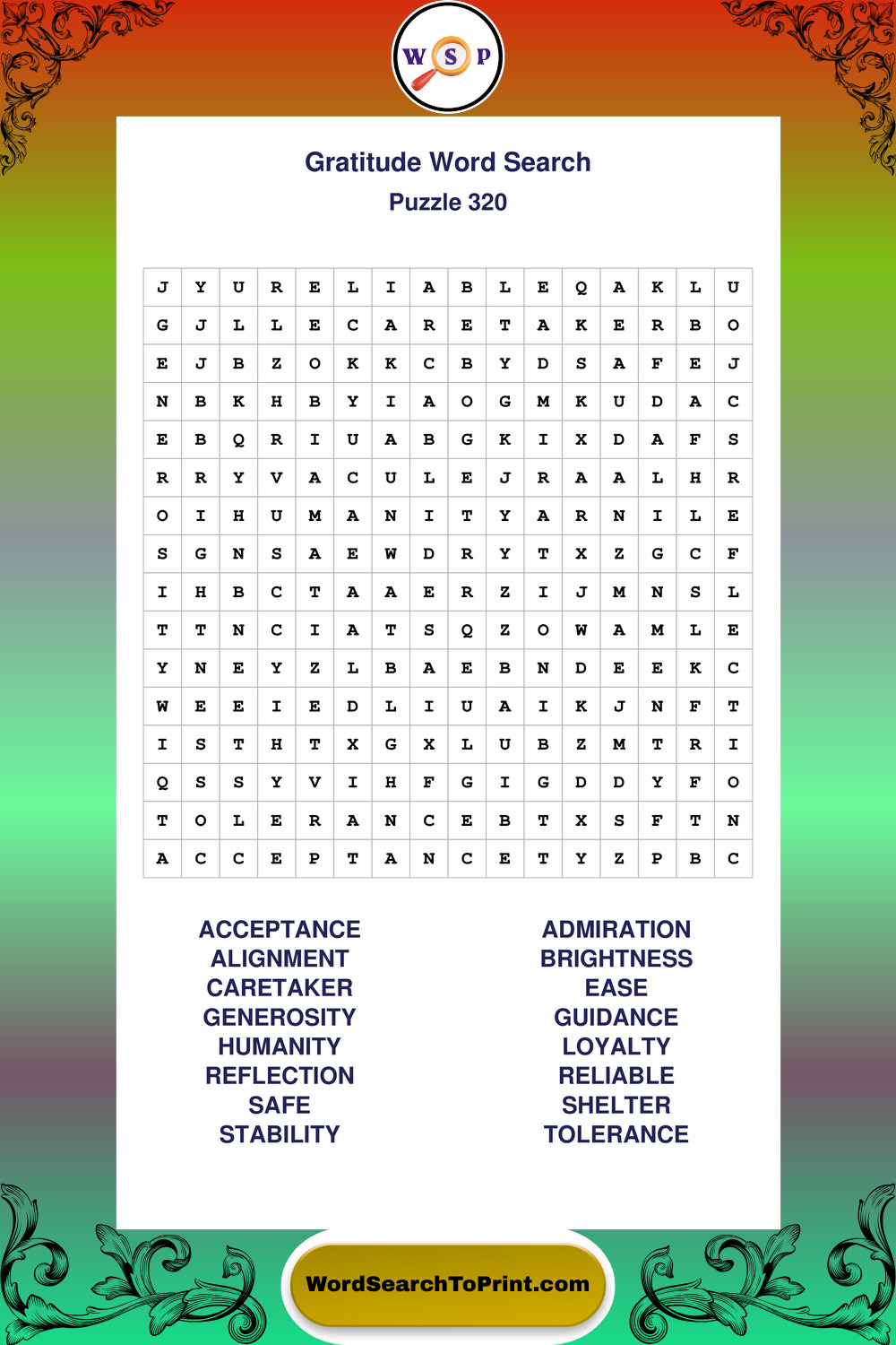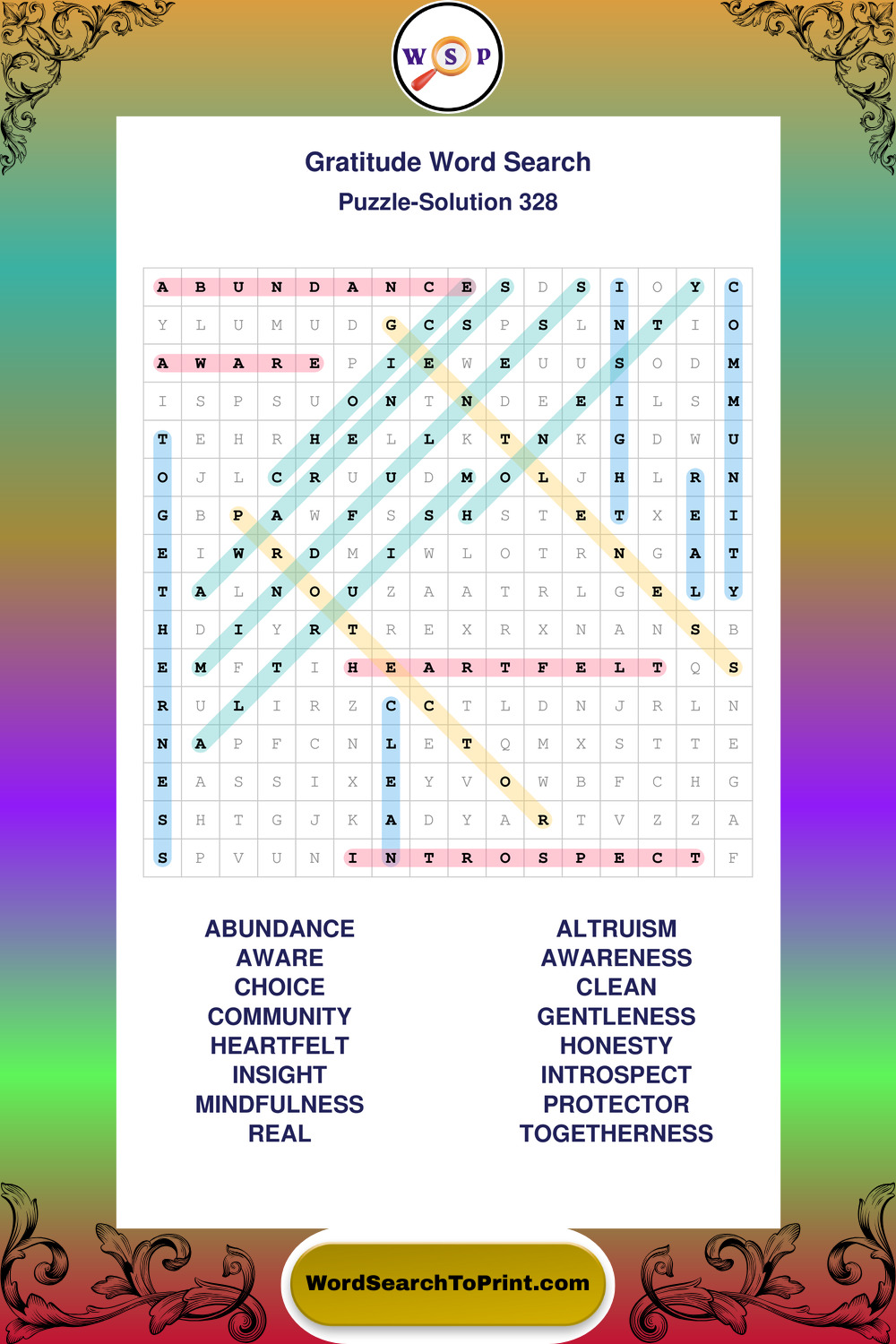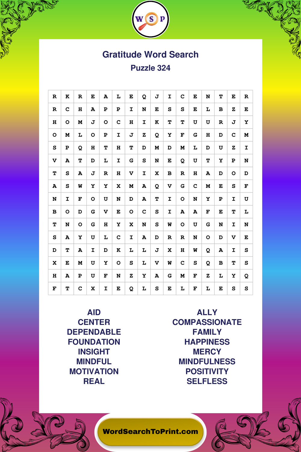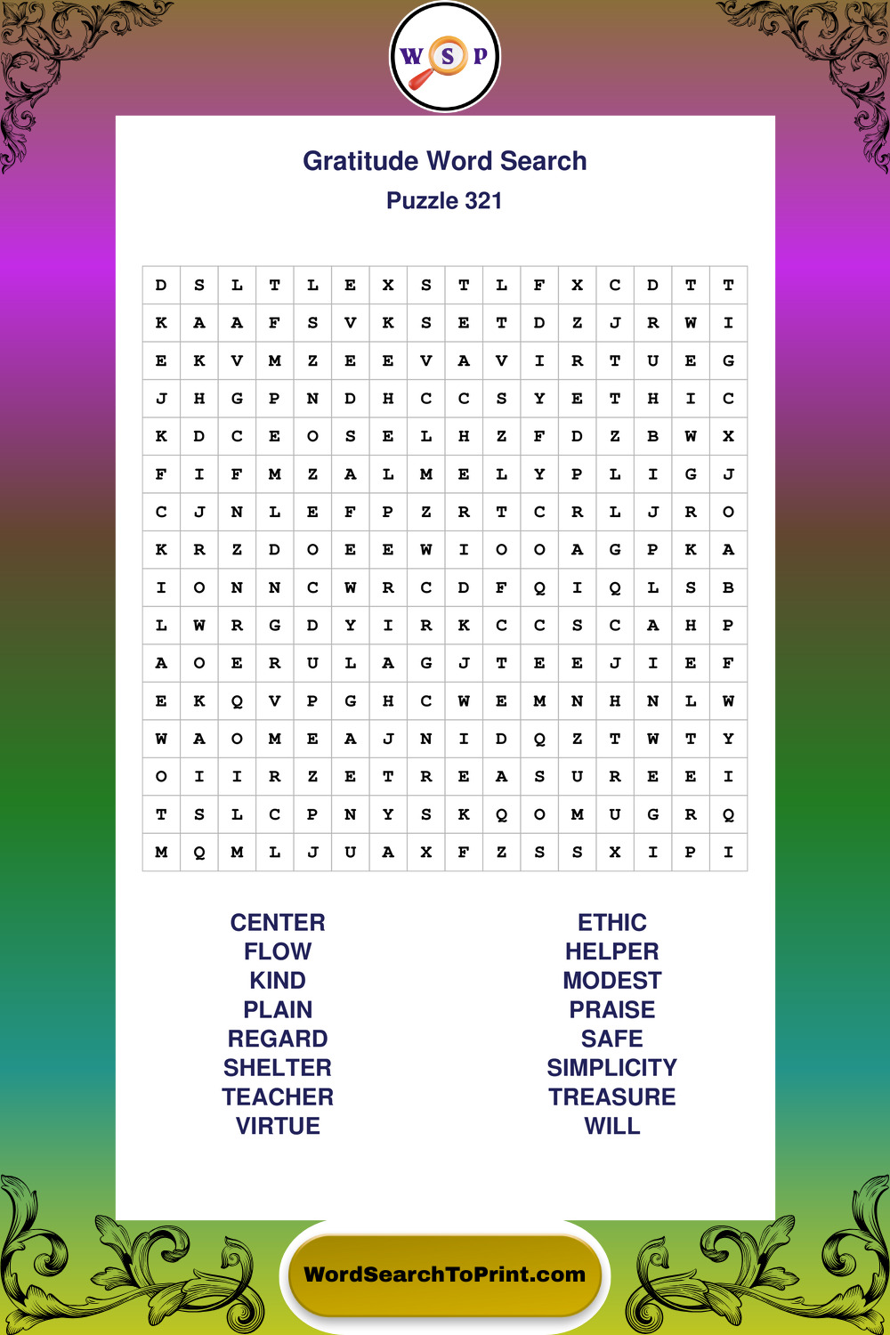Browse our free large print Gratitude wordsearches below. All puzzles are printable and include solutions.
