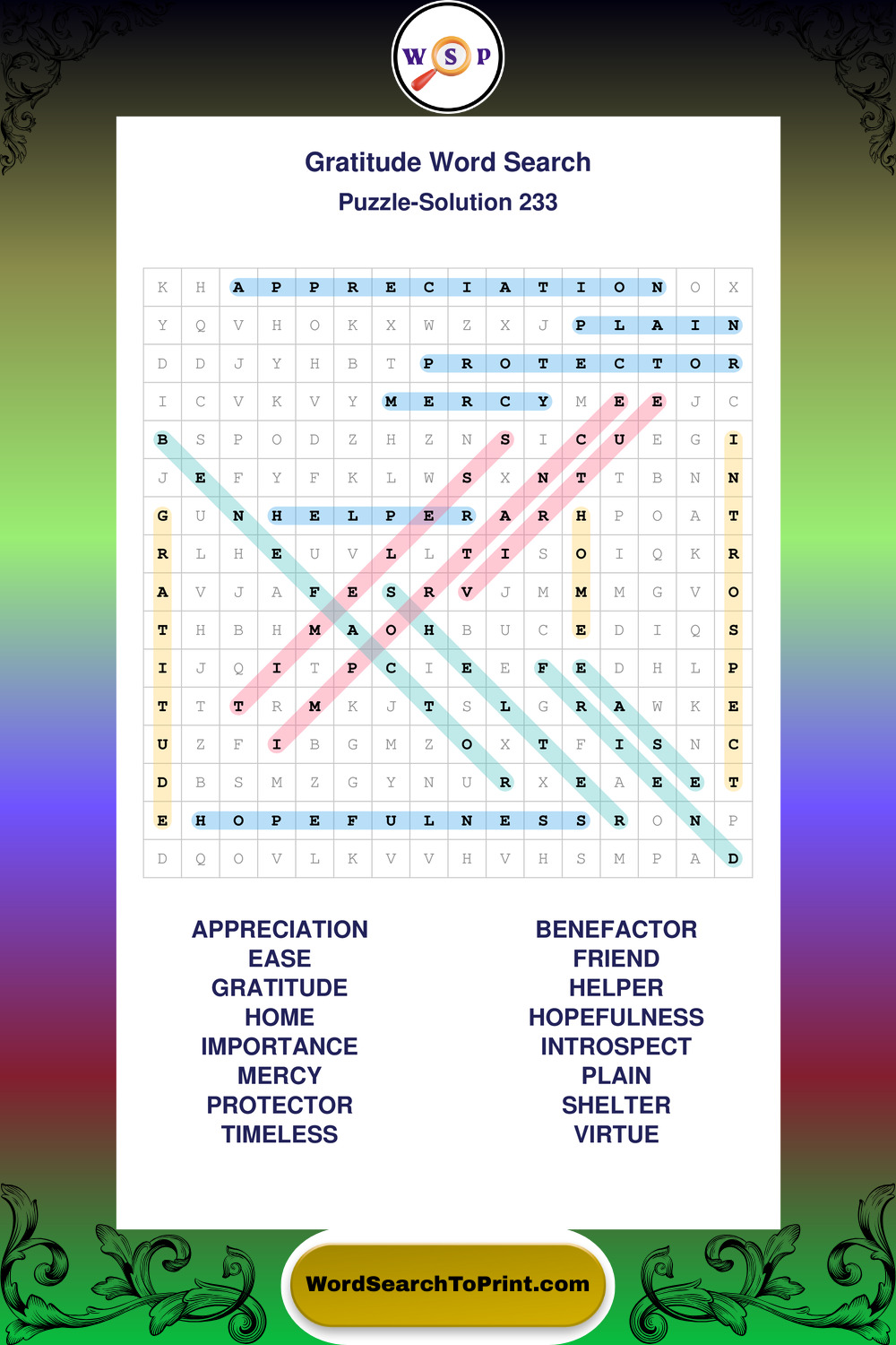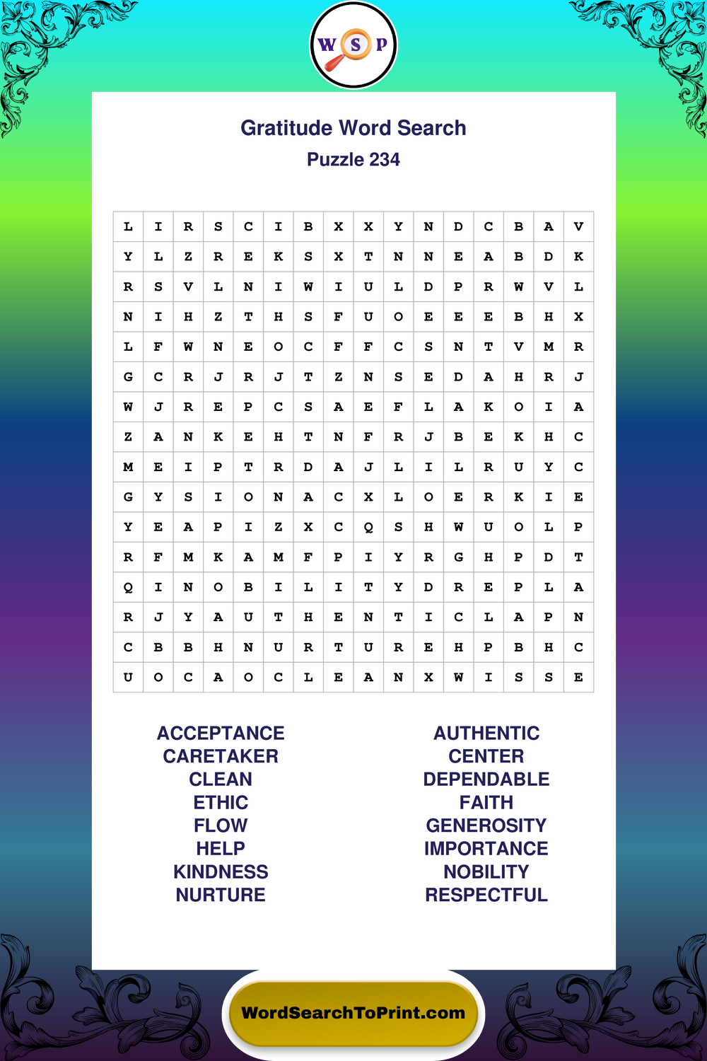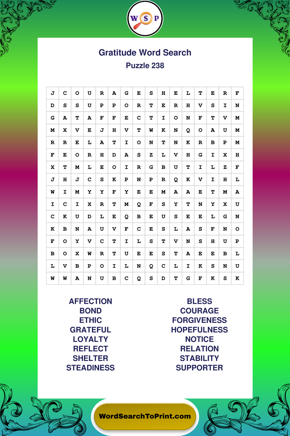 Browse our free large print Gratitude wordsearches below. All puzzles are printable and include solutions.