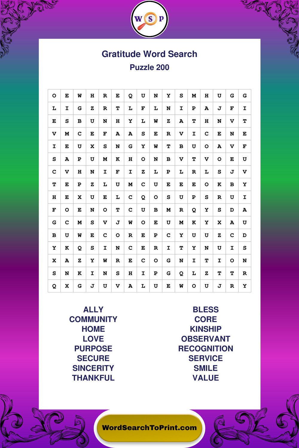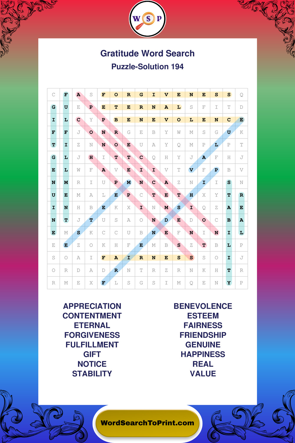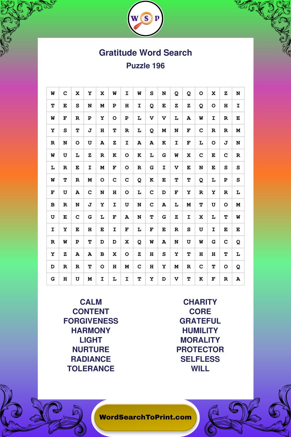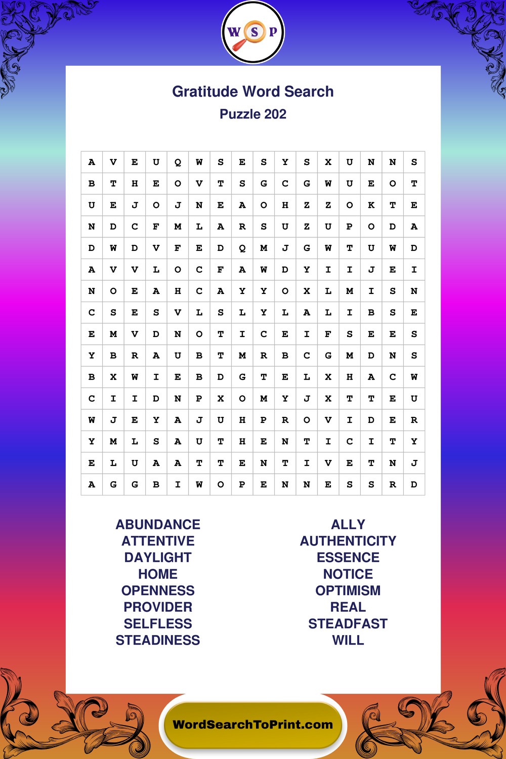 Browse our free large print Gratitude wordsearches below. All puzzles are printable and include solutions.