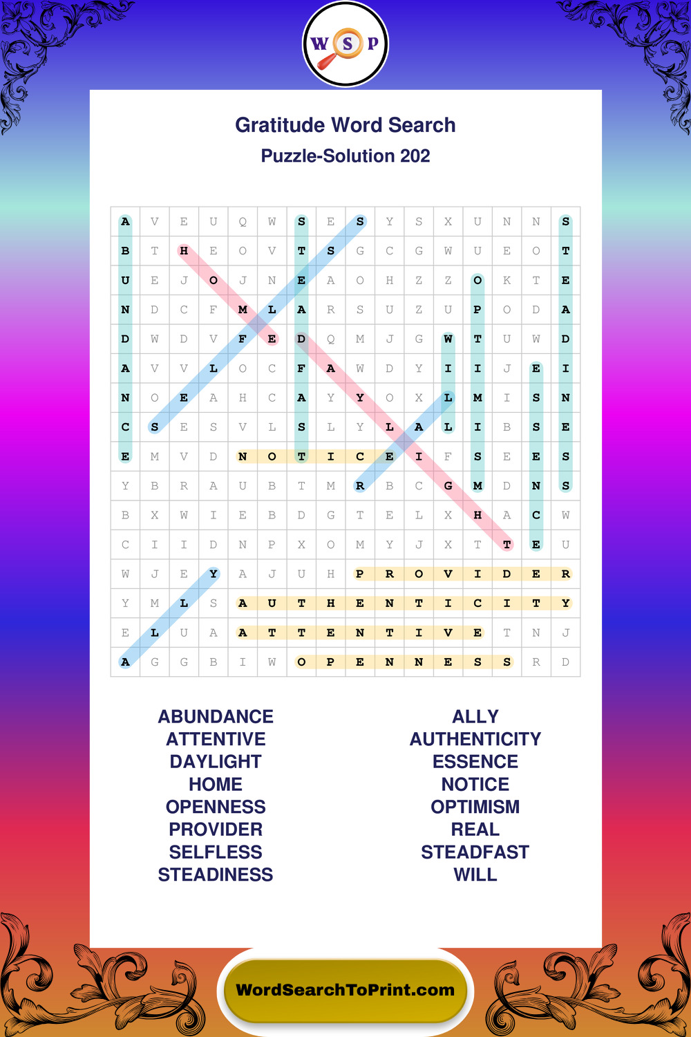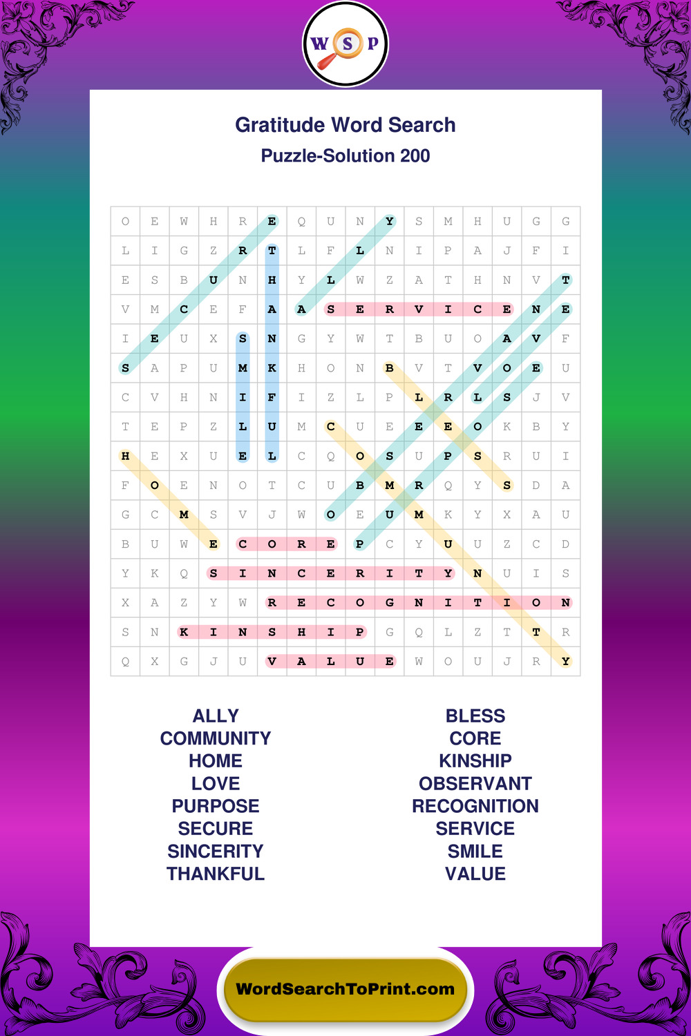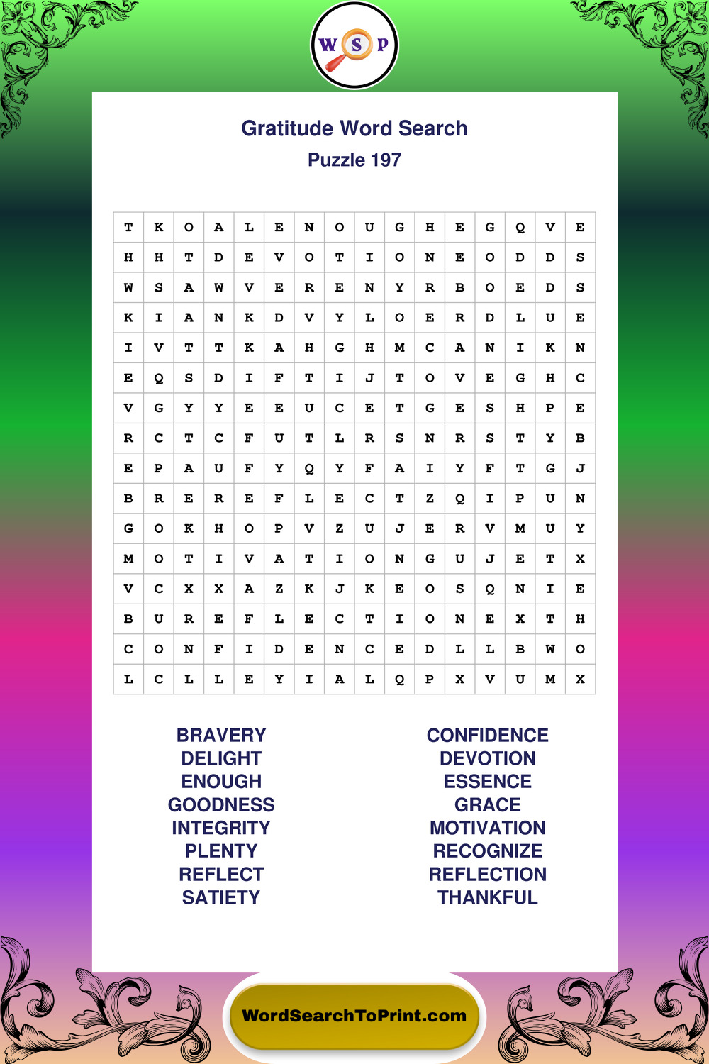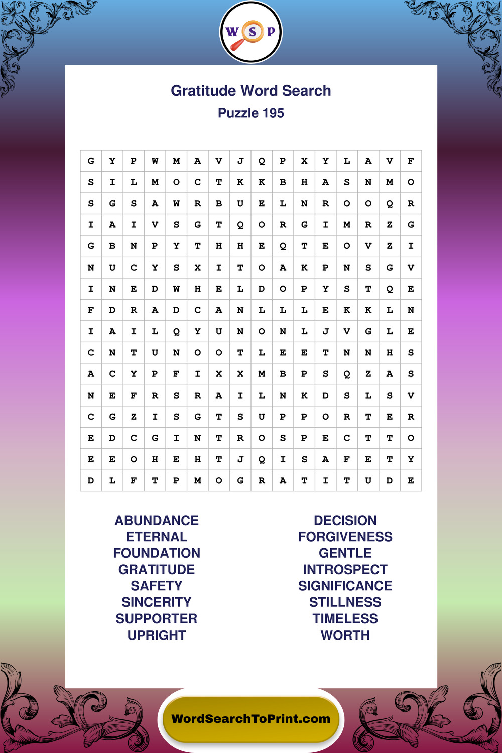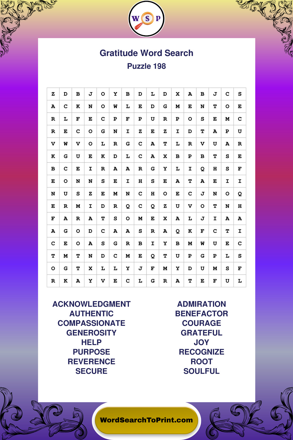 Browse our free large print Gratitude wordsearches below. All puzzles are printable and include solutions.