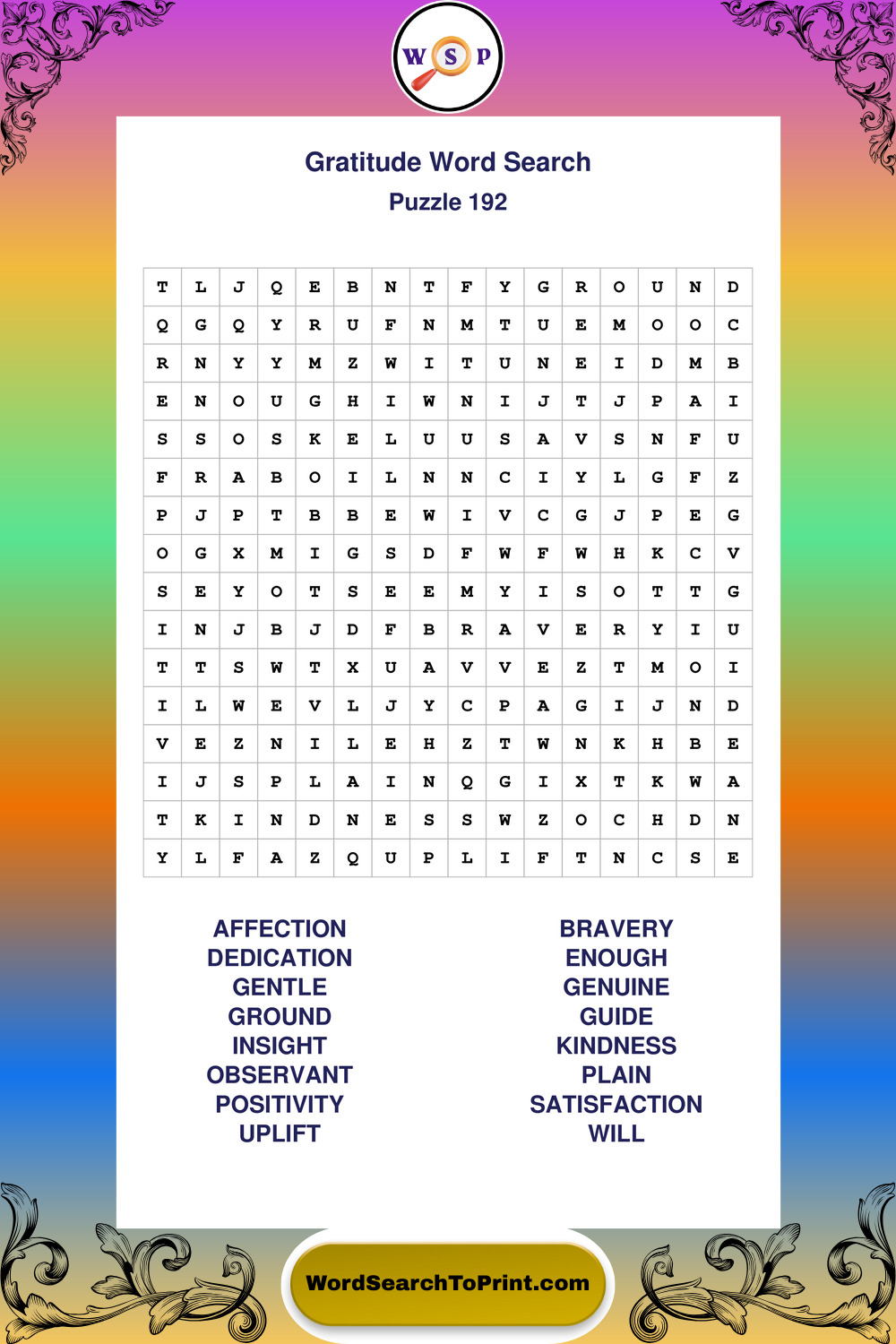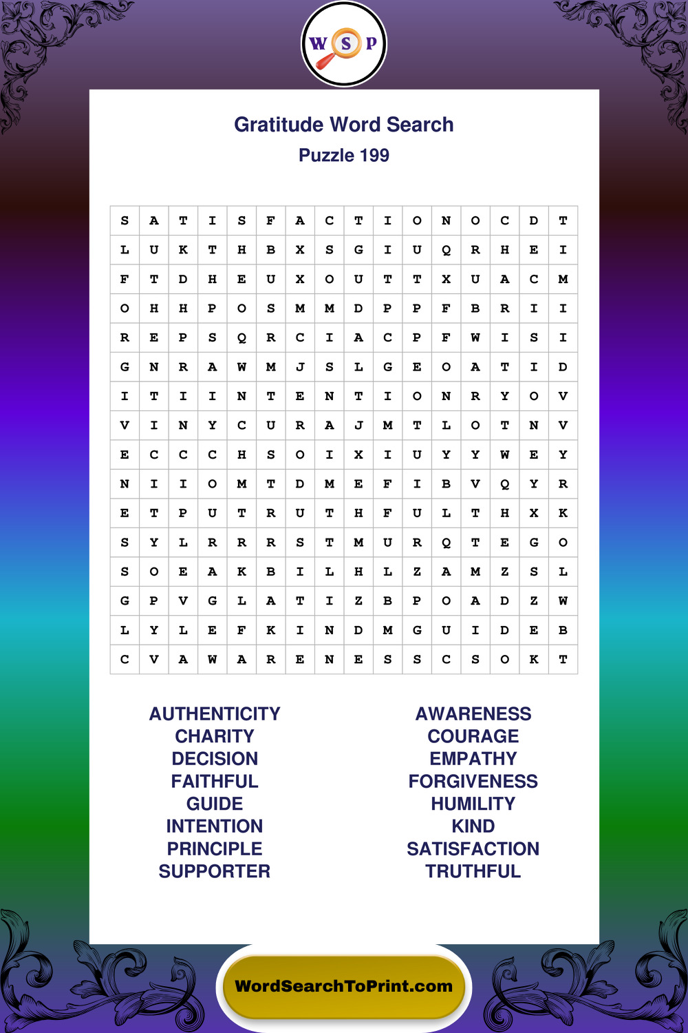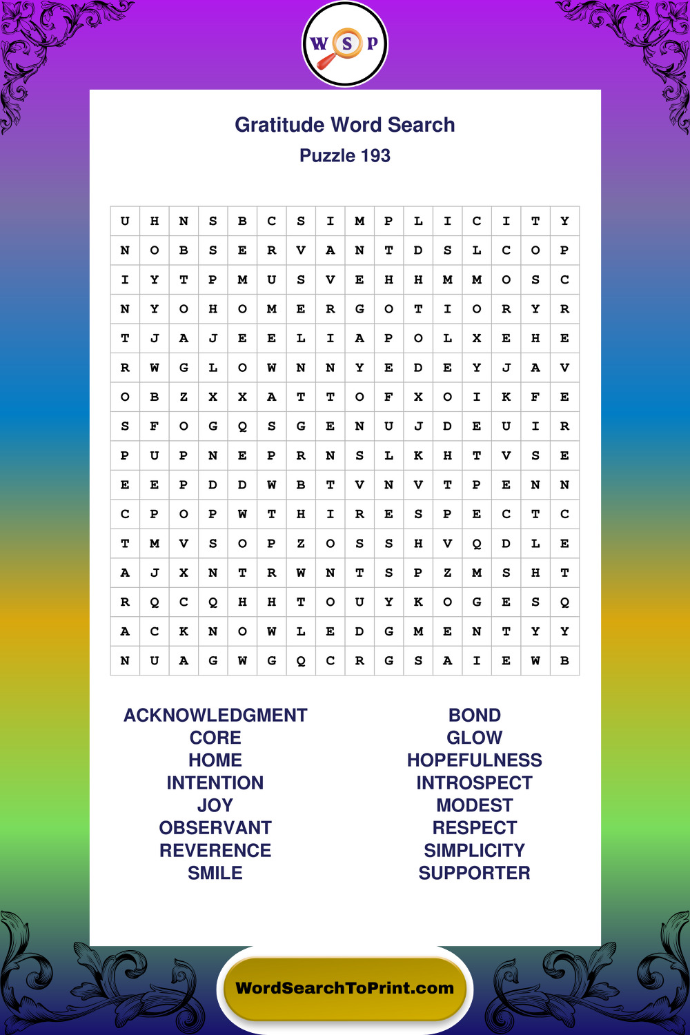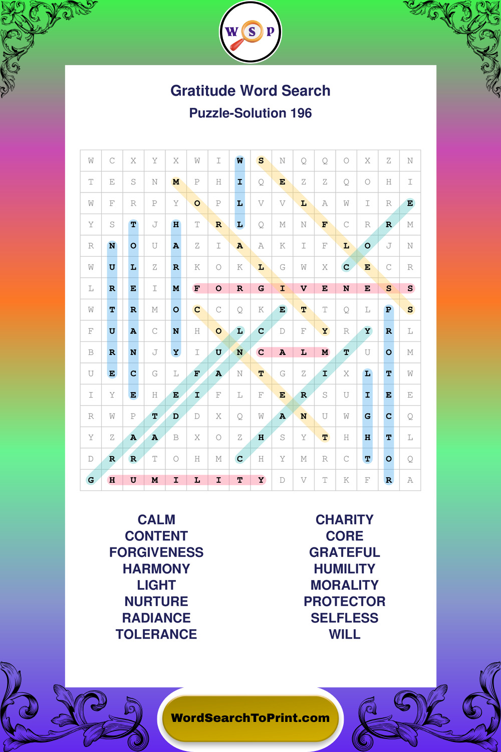 Browse our free large print Gratitude wordsearches below. All puzzles are printable and include solutions.