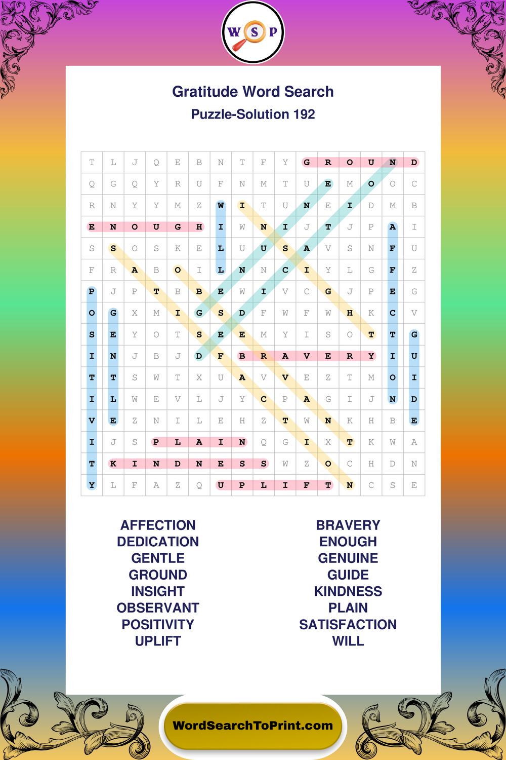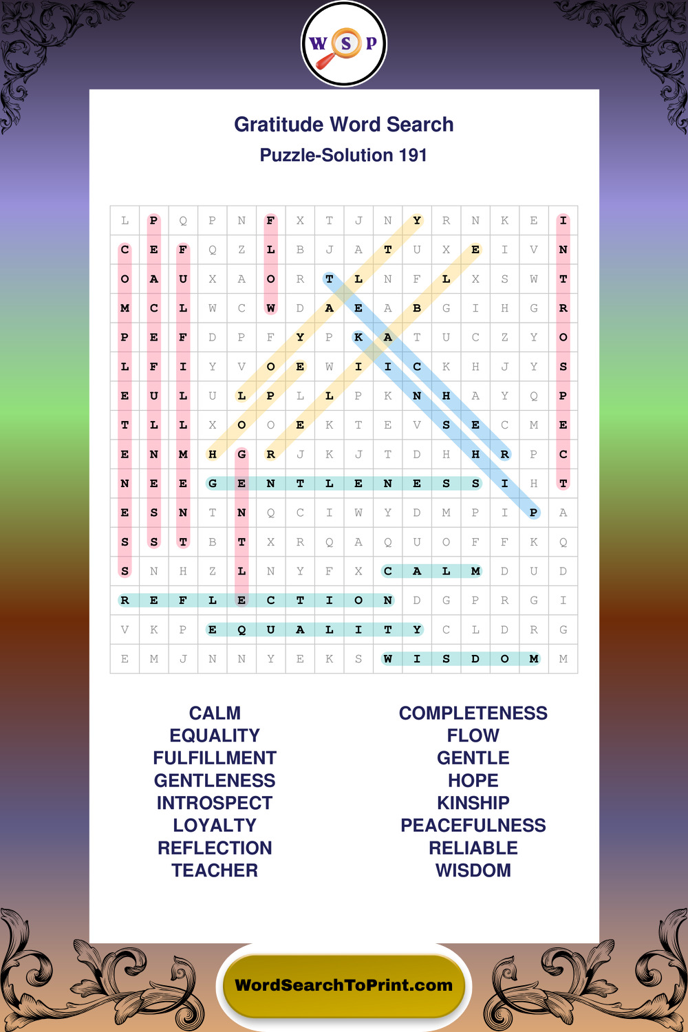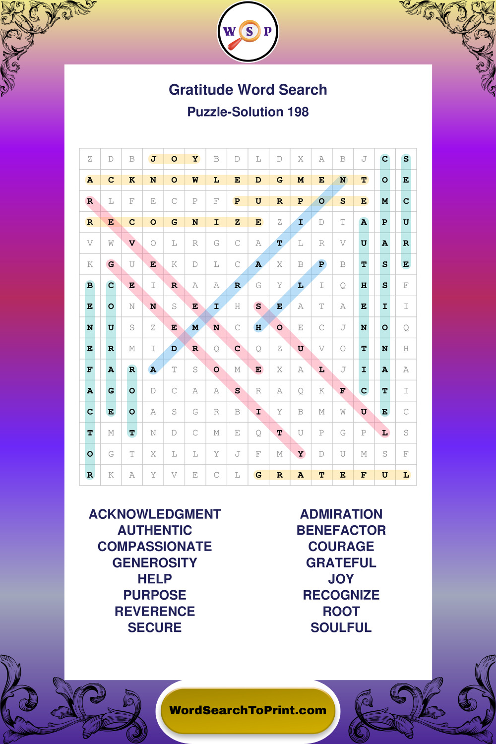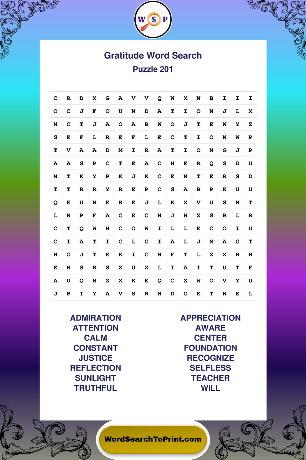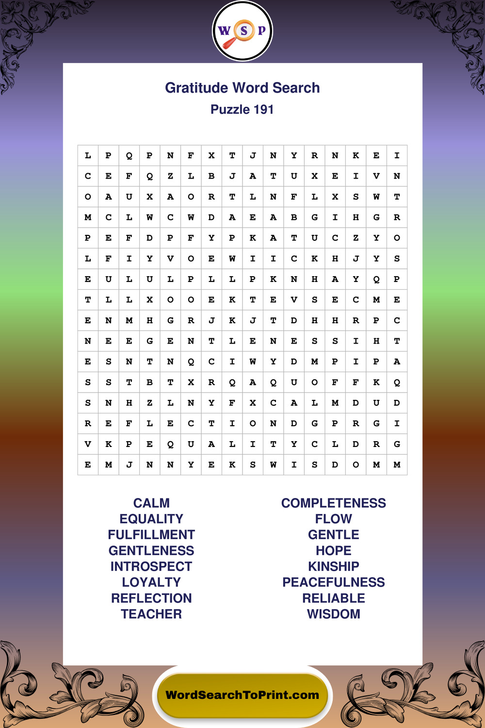 Browse our free large print Gratitude wordsearches below. All puzzles are printable and include solutions.