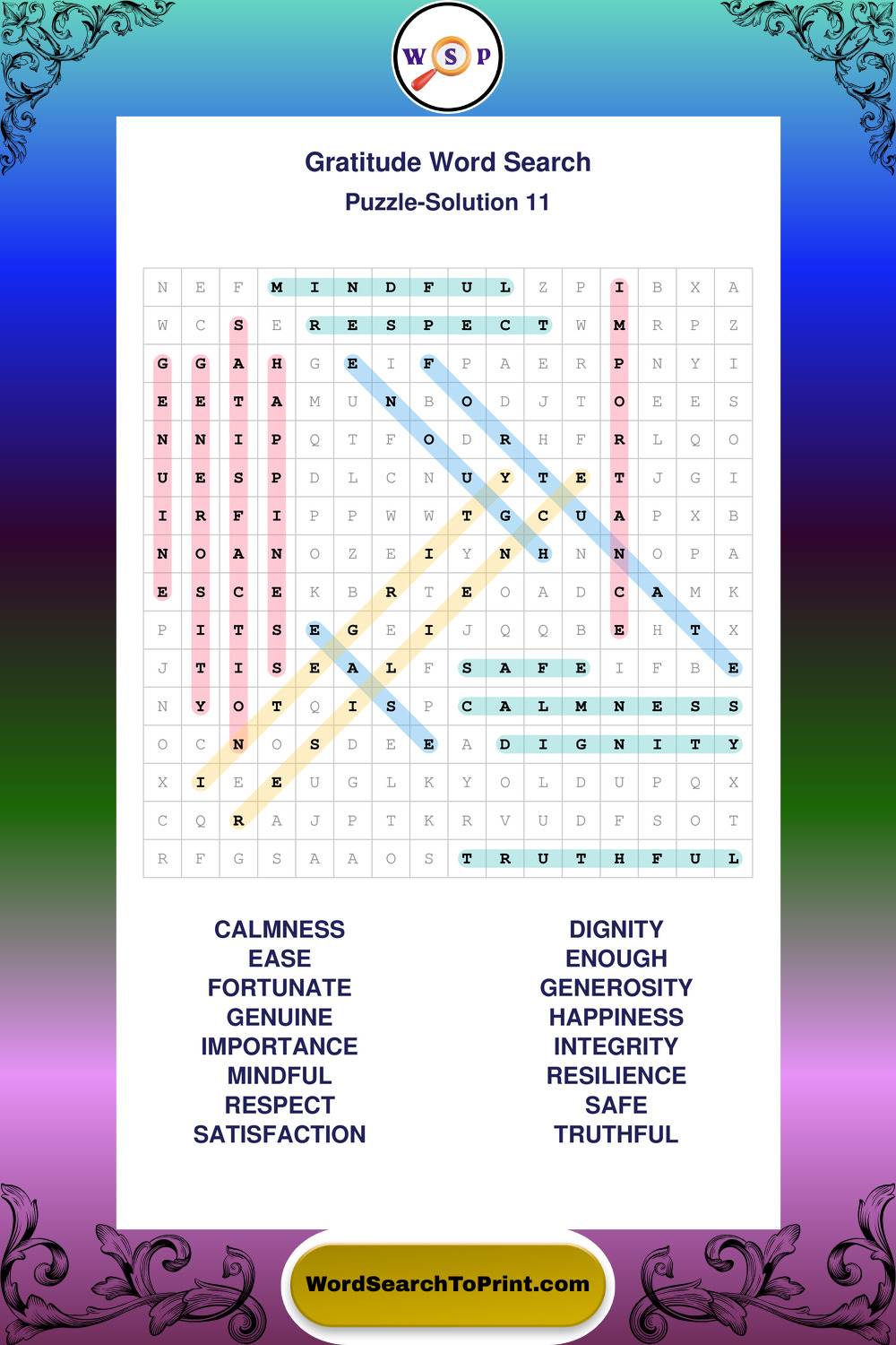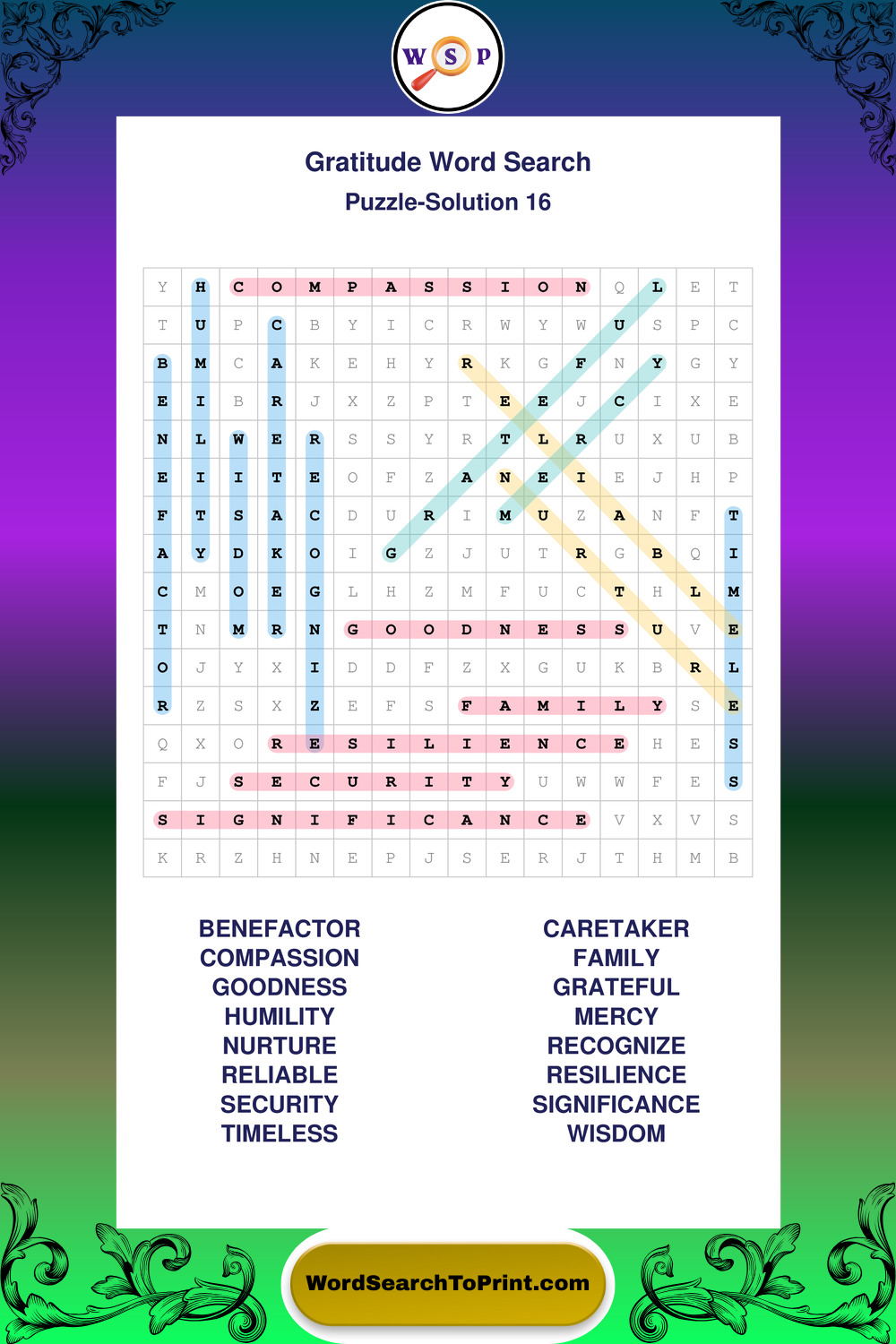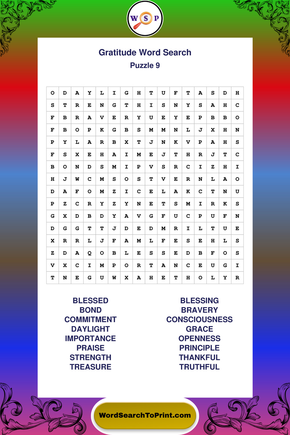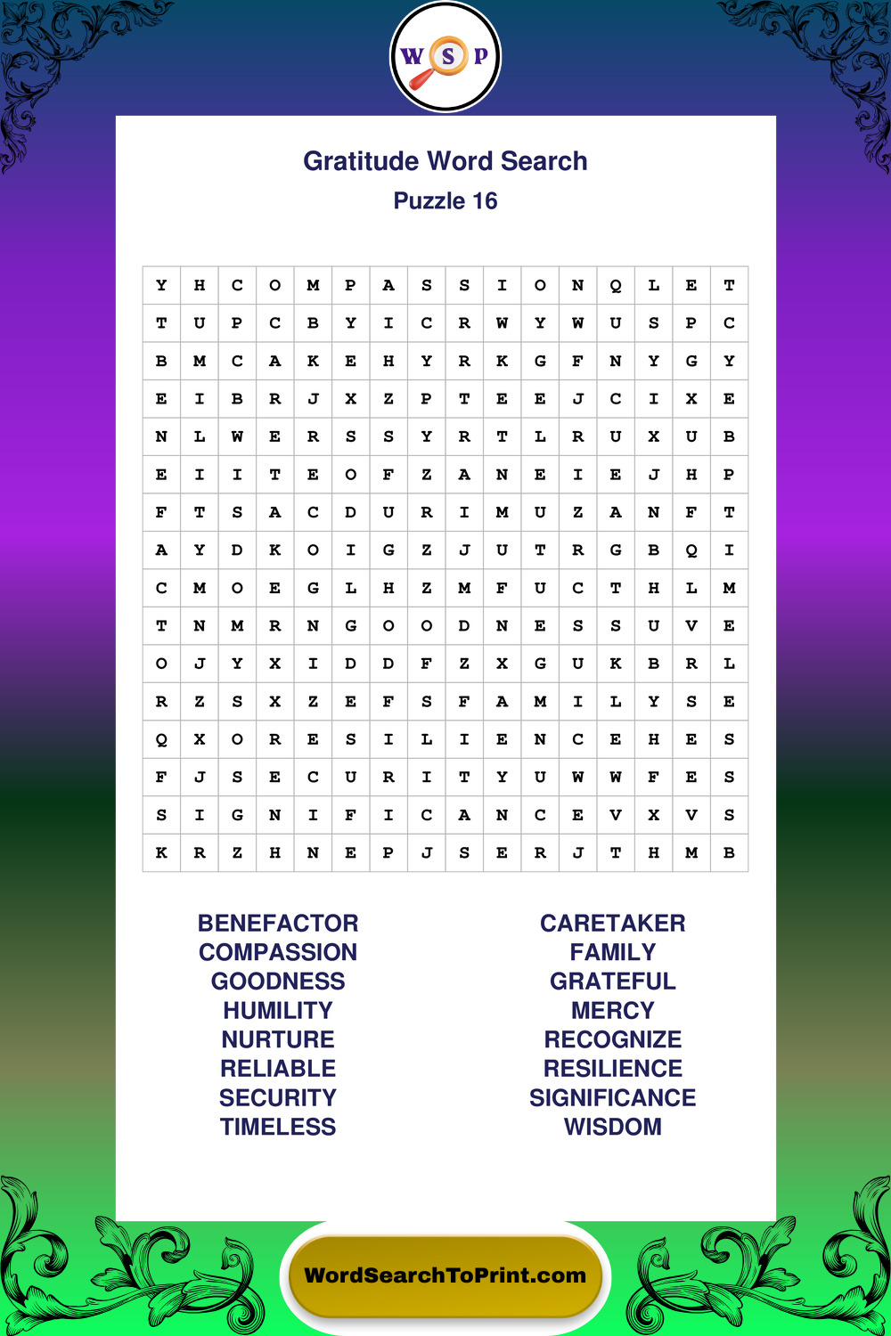 Browse our free large print Gratitude wordsearches below. All puzzles are printable and include solutions.