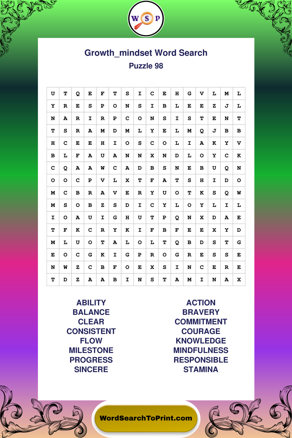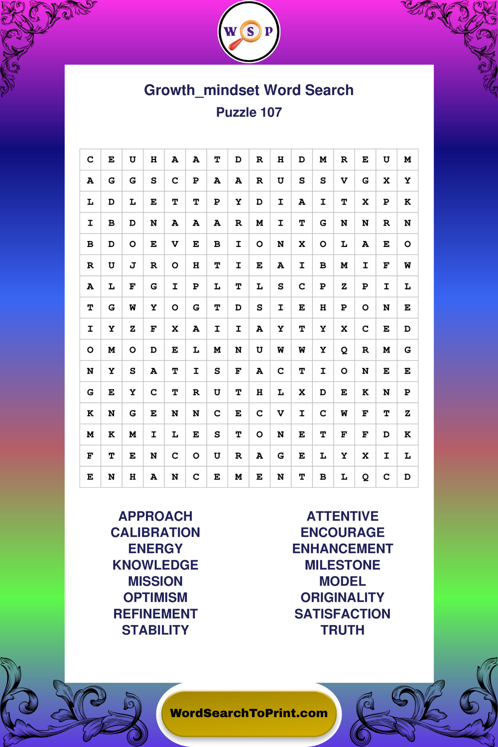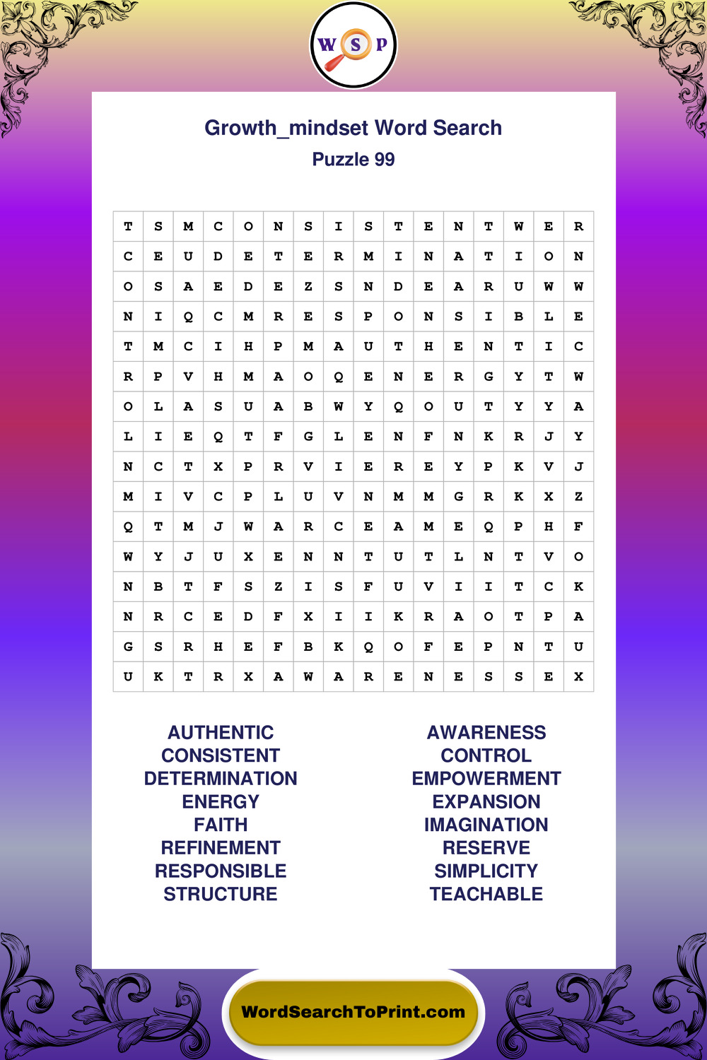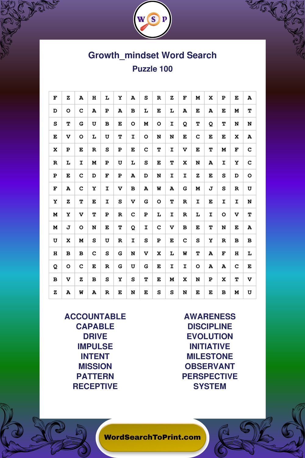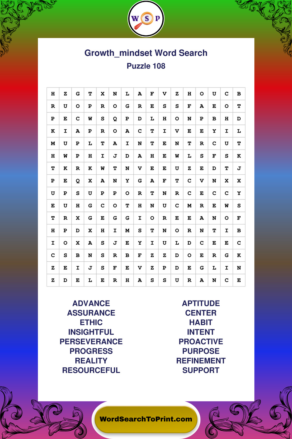Discover large print Growth Mindset wordsearches designed to support relaxed thinking and comfortable reading.