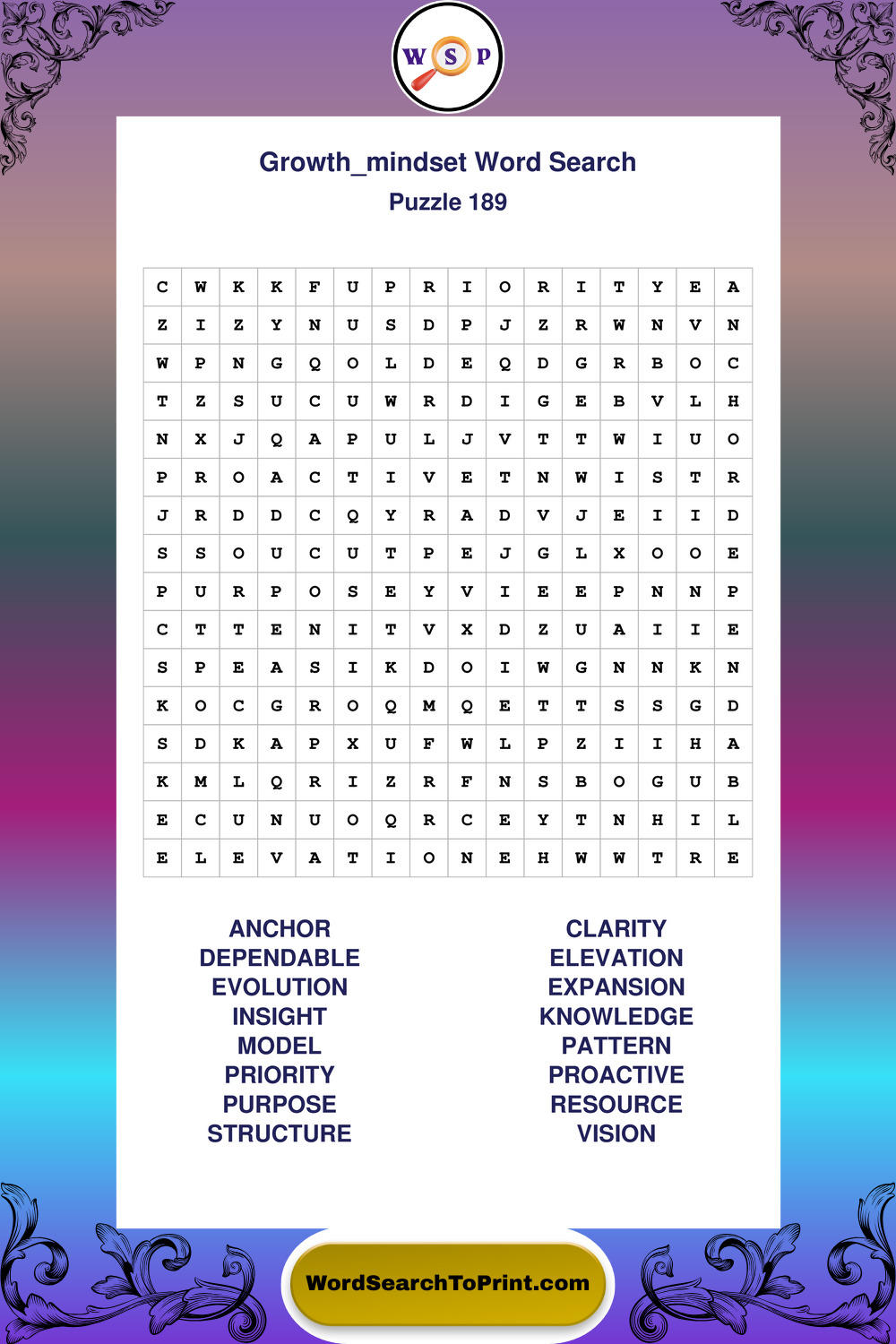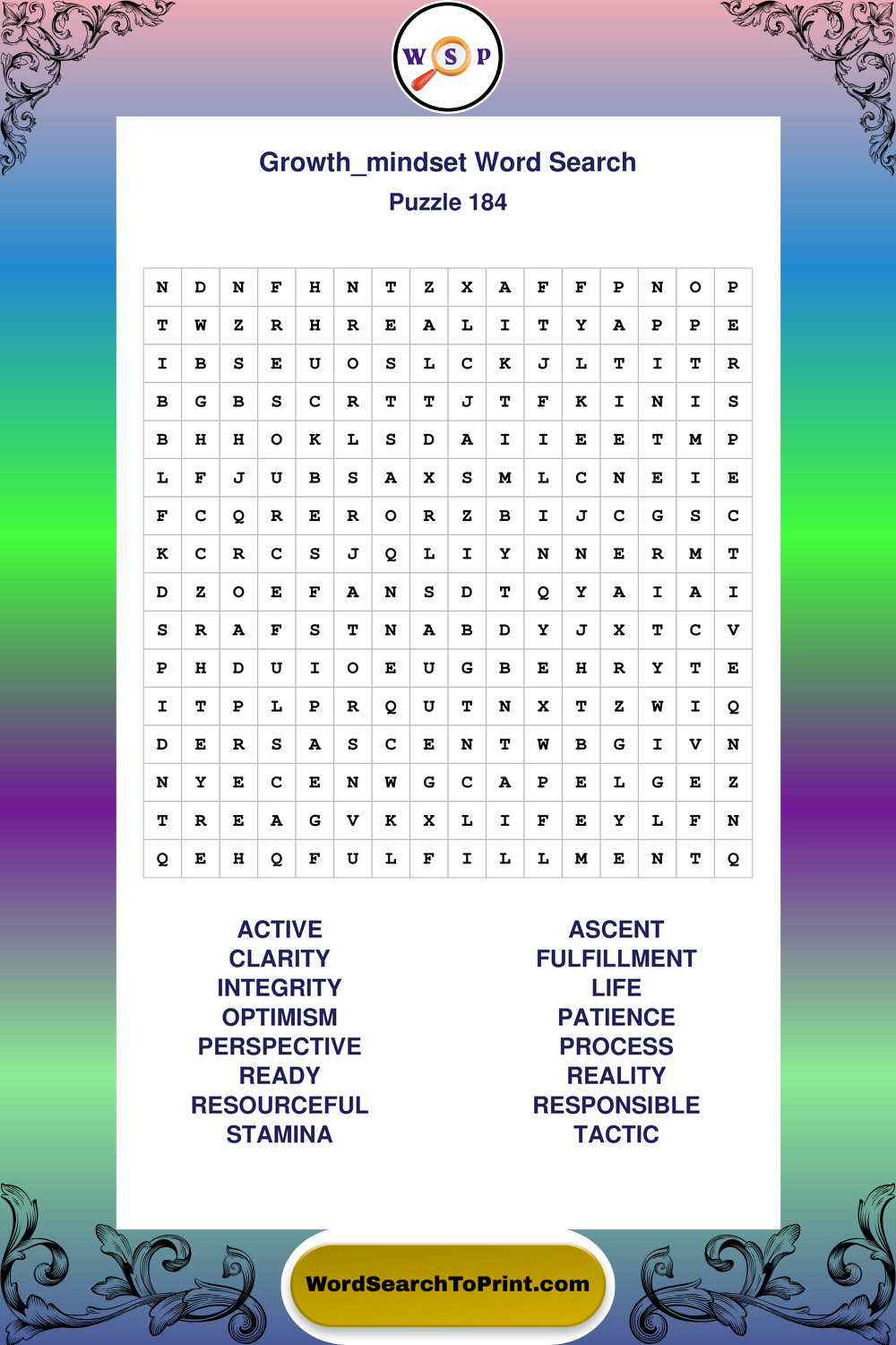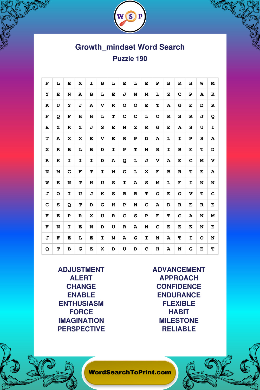Discover large print Growth Mindset wordsearches designed to support relaxed thinking and comfortable reading.