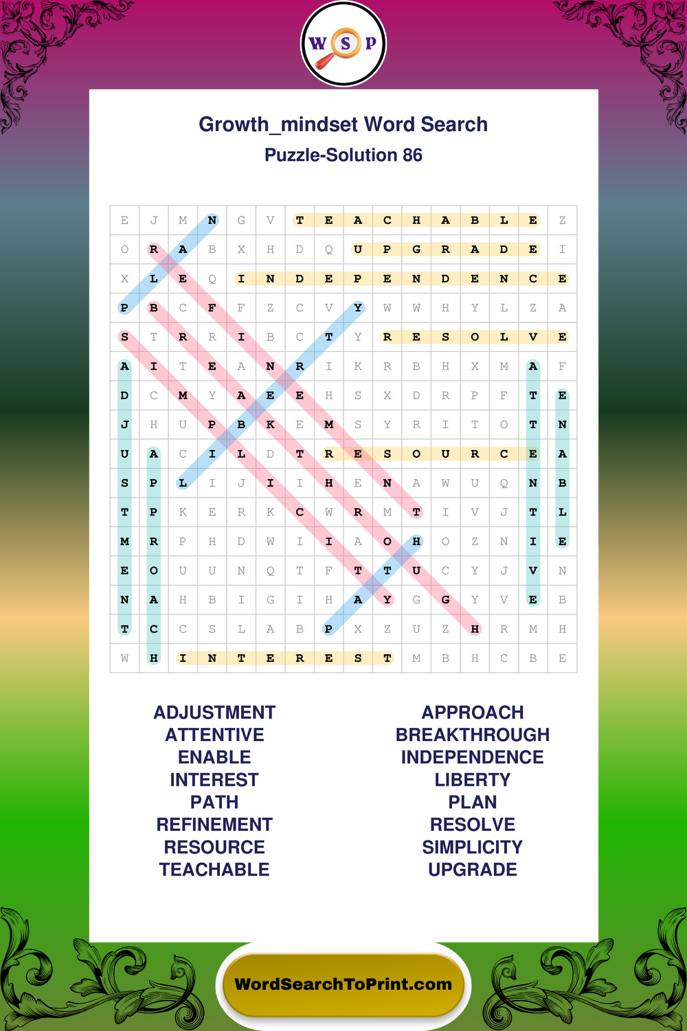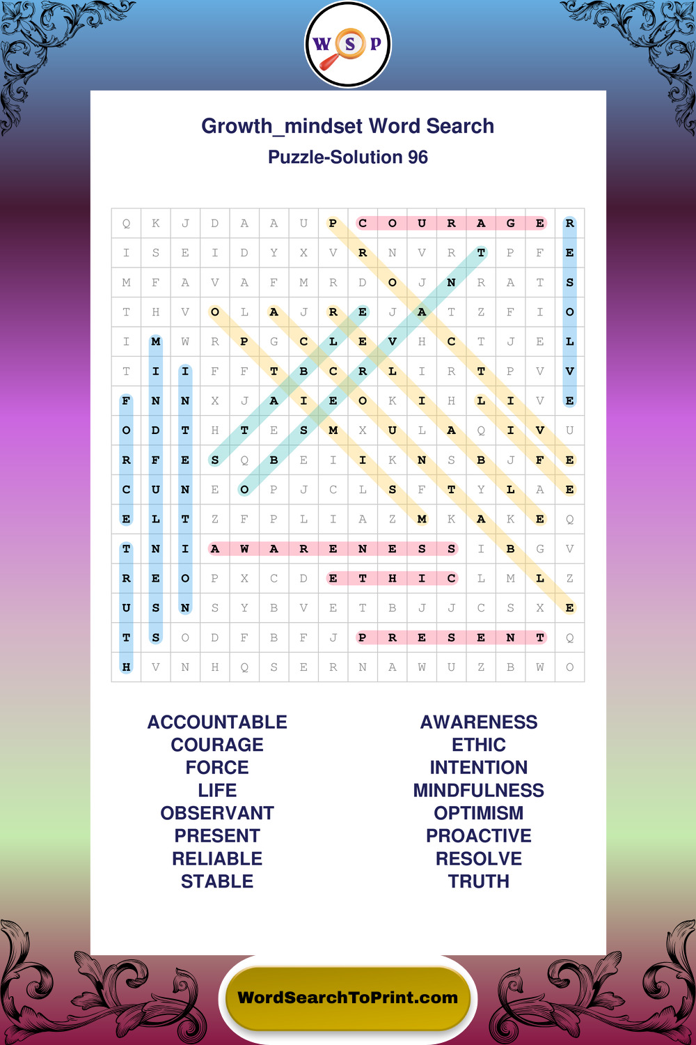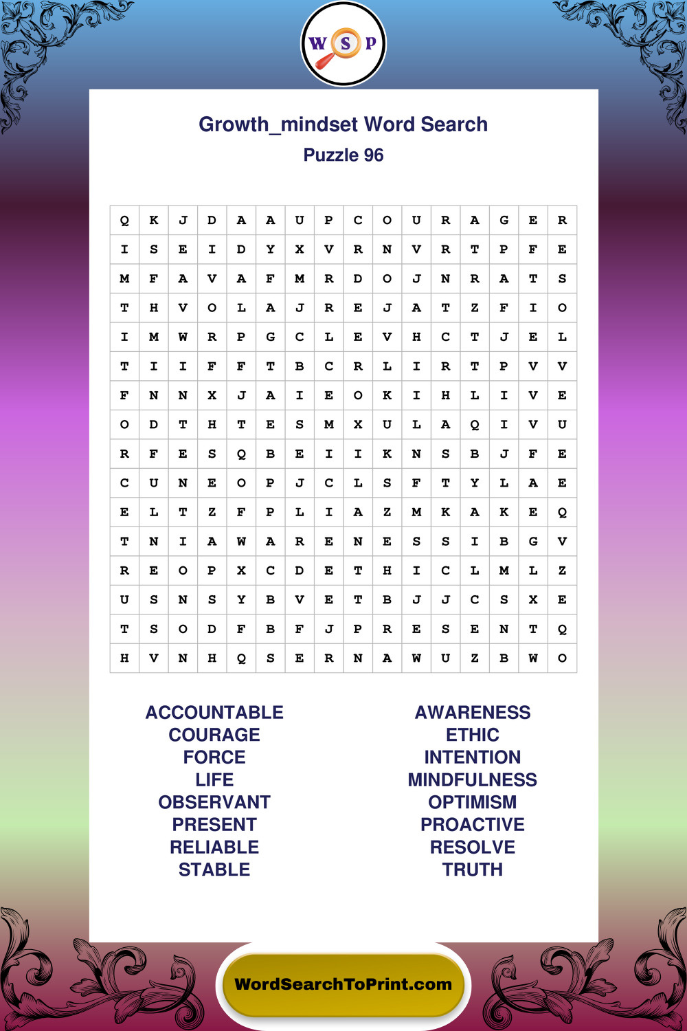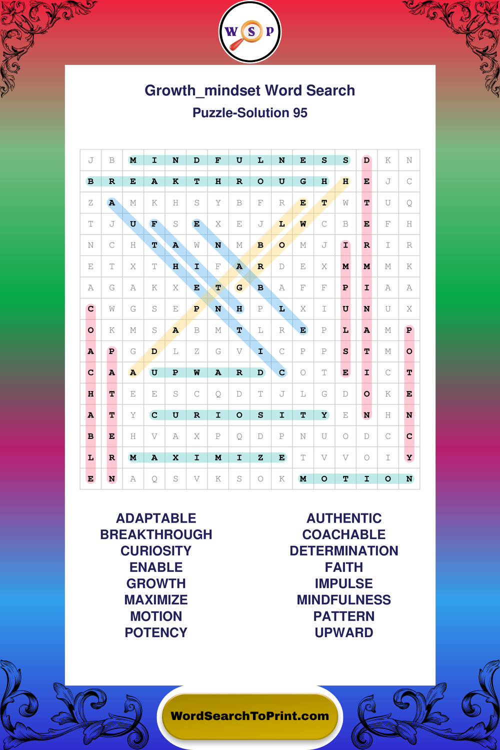 These puzzles focus on motivation, goal setting, life lessons, inspiration, and personal development concepts. These puzzles make it enjoyable to explore this theme while improving focus and reinforcing key terms. You may also enjoy our Wisdom word search puzzles and Life Lessons word search puzzles.
