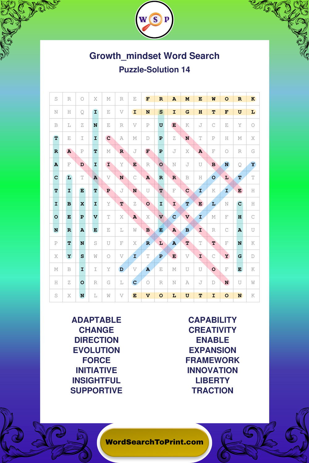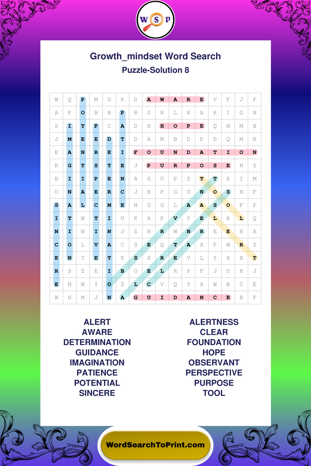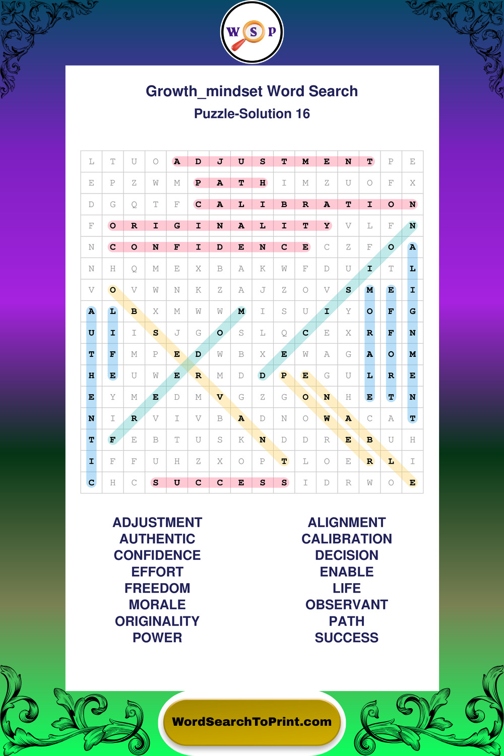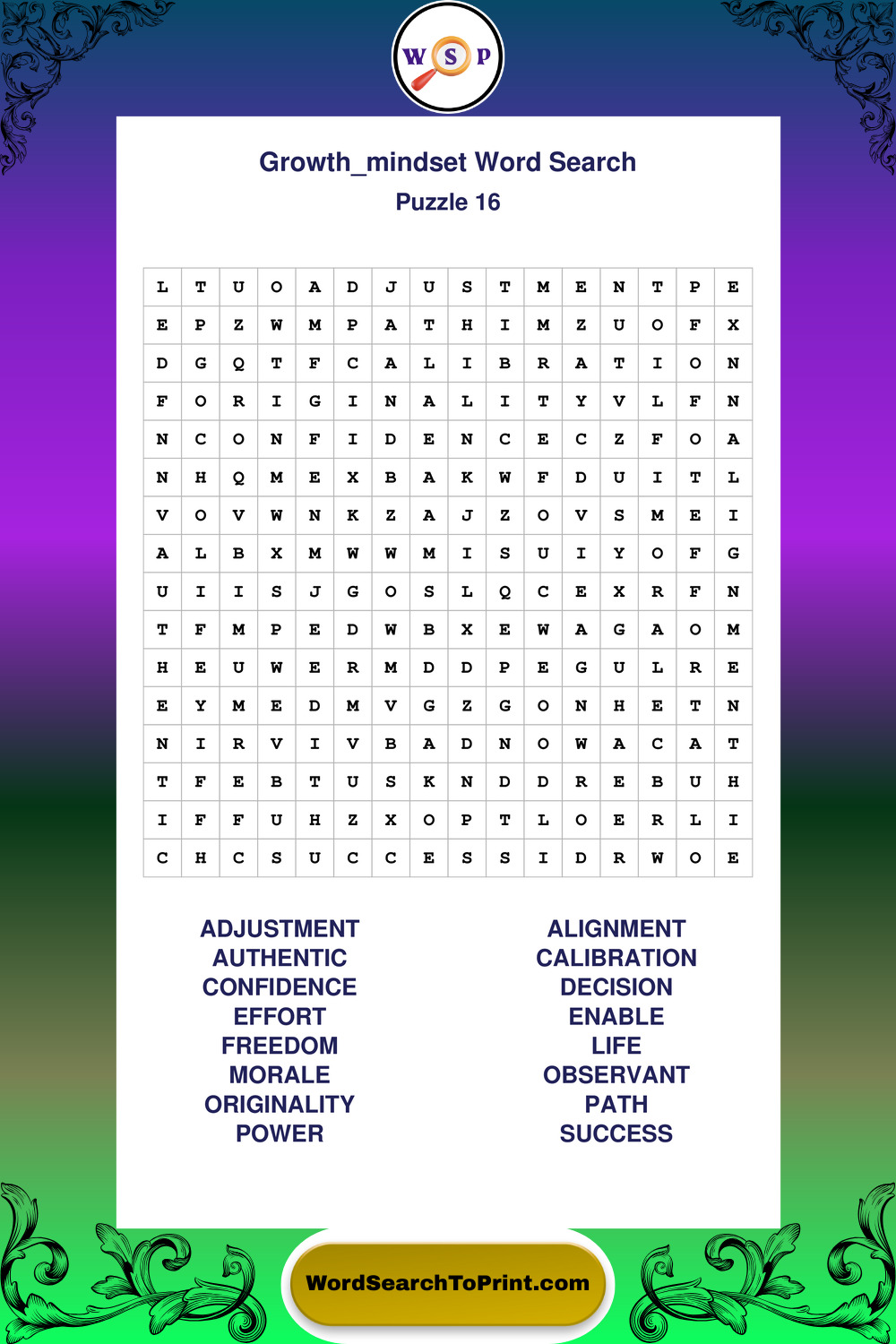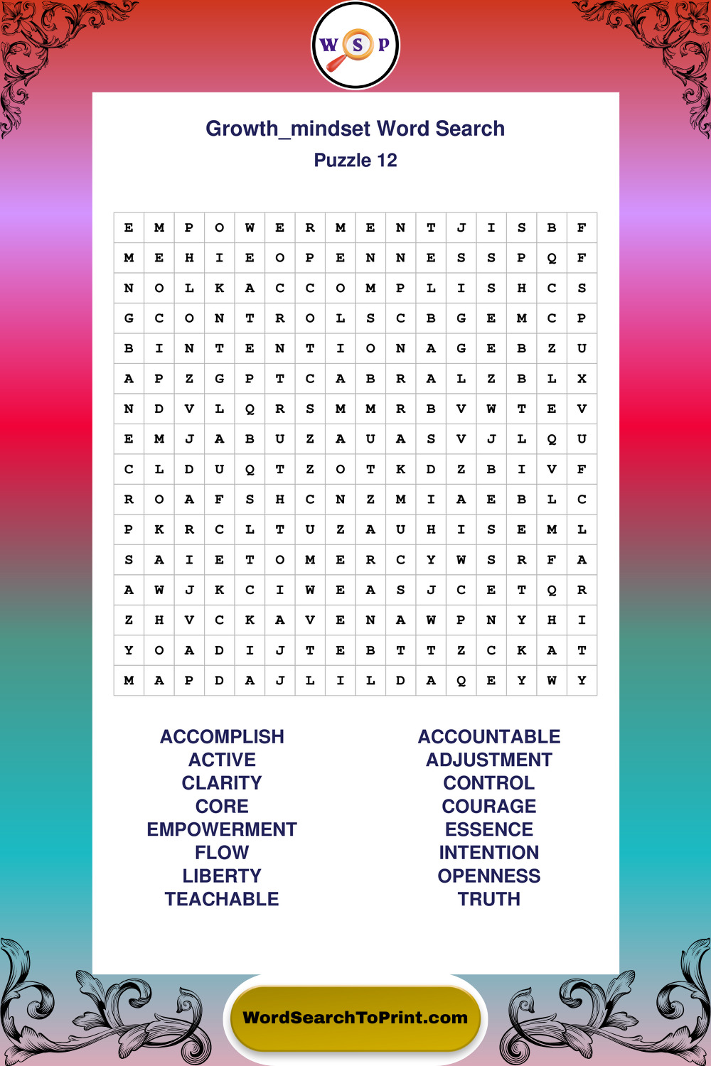 These puzzles focus on motivation, goal setting, life lessons, inspiration, and personal development concepts. These puzzles make it enjoyable to explore this theme while improving focus and reinforcing key terms. You may also enjoy our Wisdom word search puzzles and Life Lessons word search puzzles.