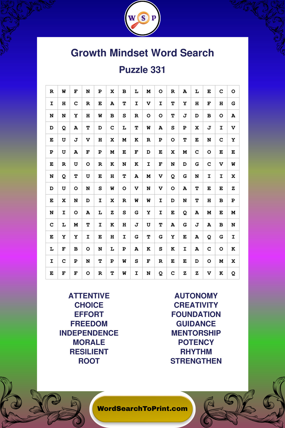 These puzzles focus on motivation, goal setting, life lessons, inspiration, and personal development concepts. These puzzles make it enjoyable to explore this theme while improving focus and reinforcing key terms. You may also enjoy our Wisdom word search puzzles and Life Lessons word search puzzles.