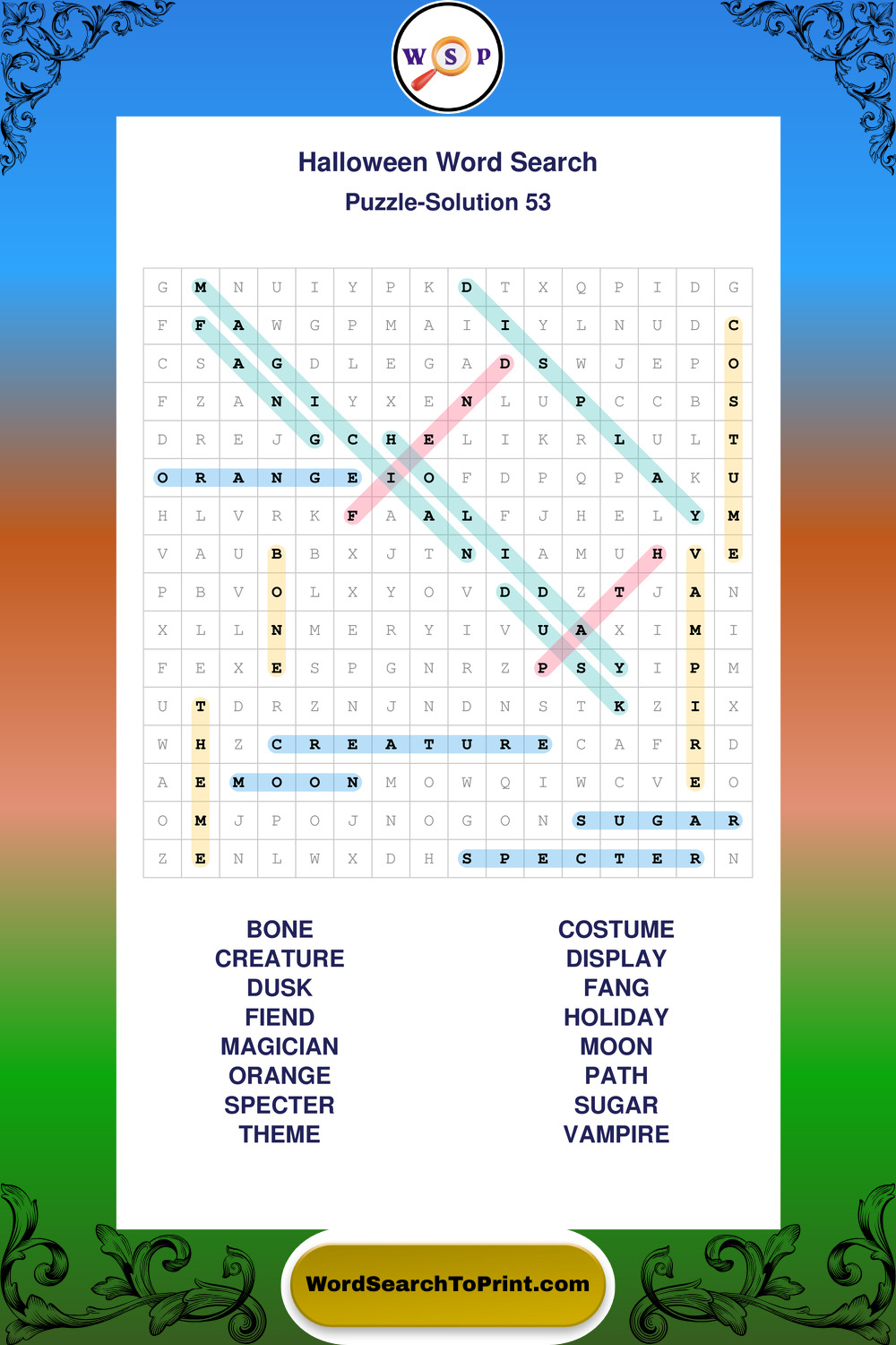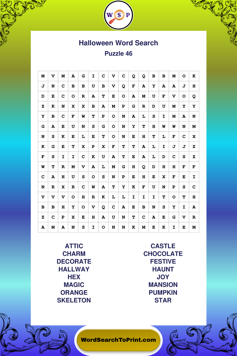 Browse large print Halloween wordsearches created to support clear vision, steady concentration, and relaxed solving.