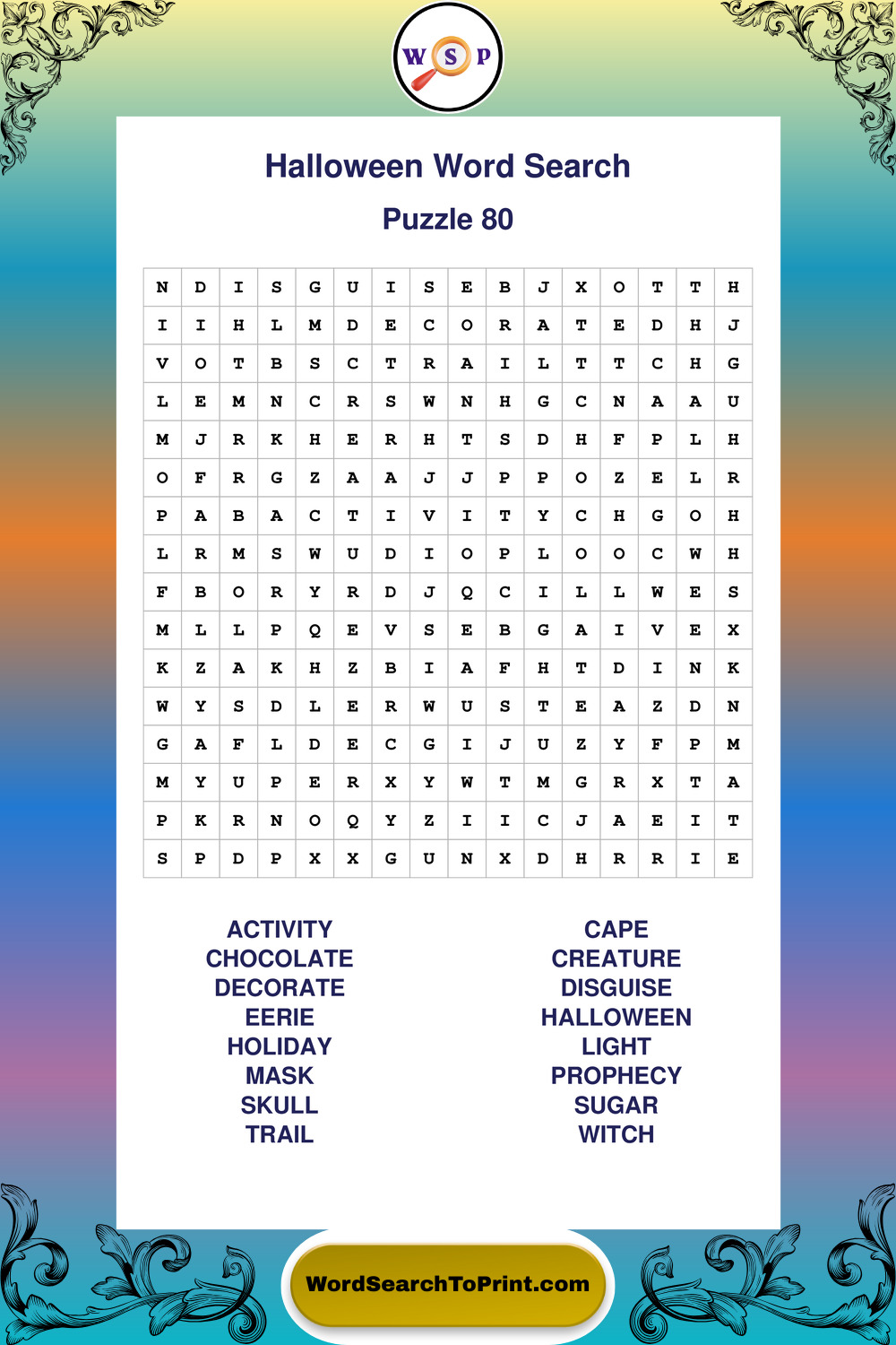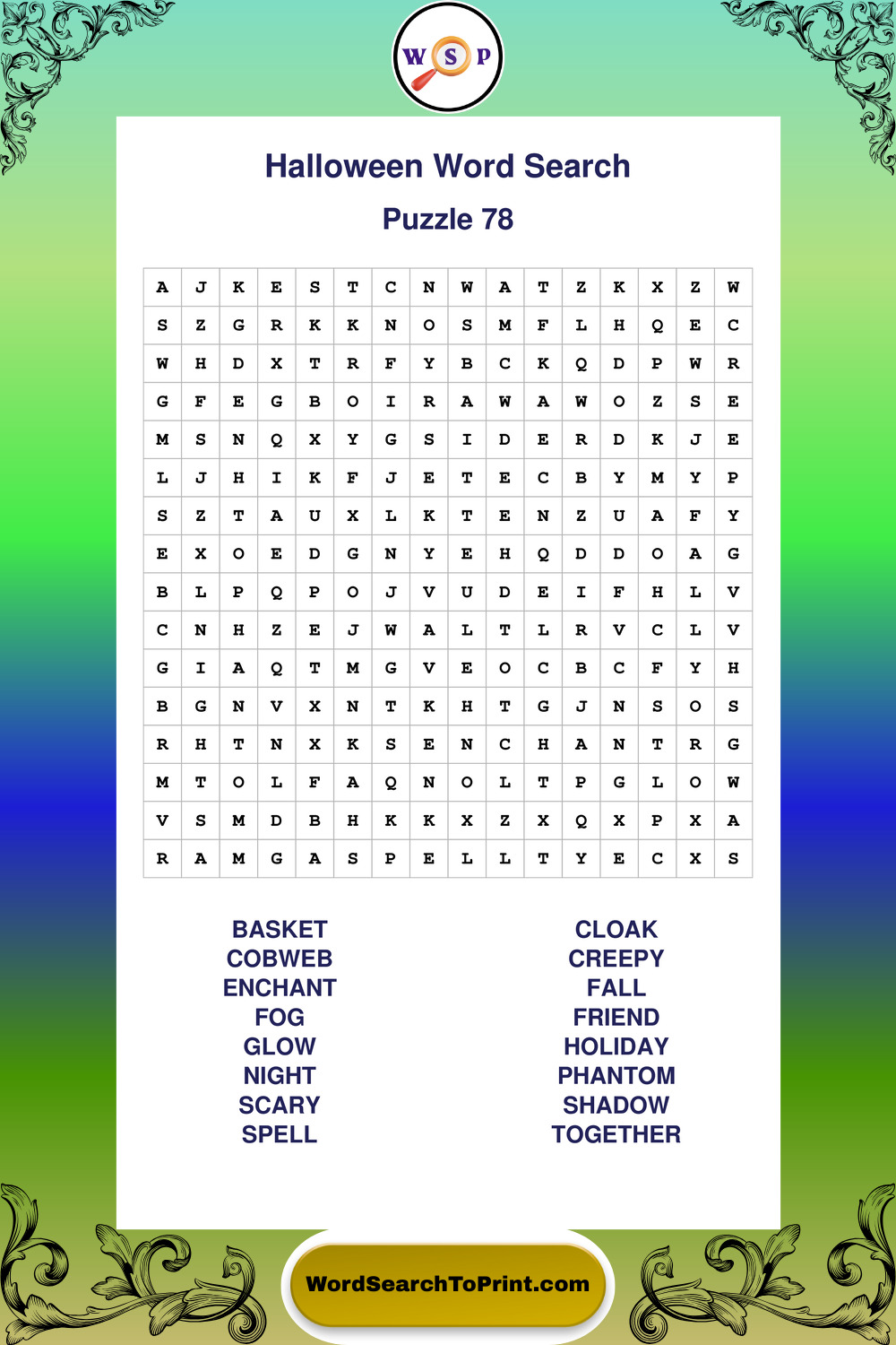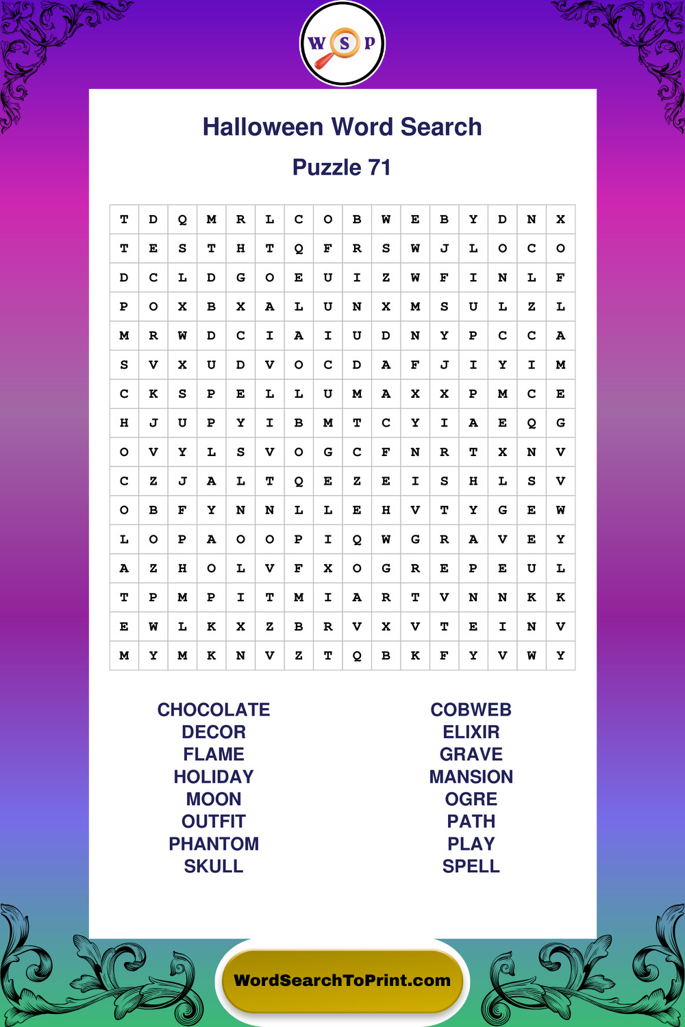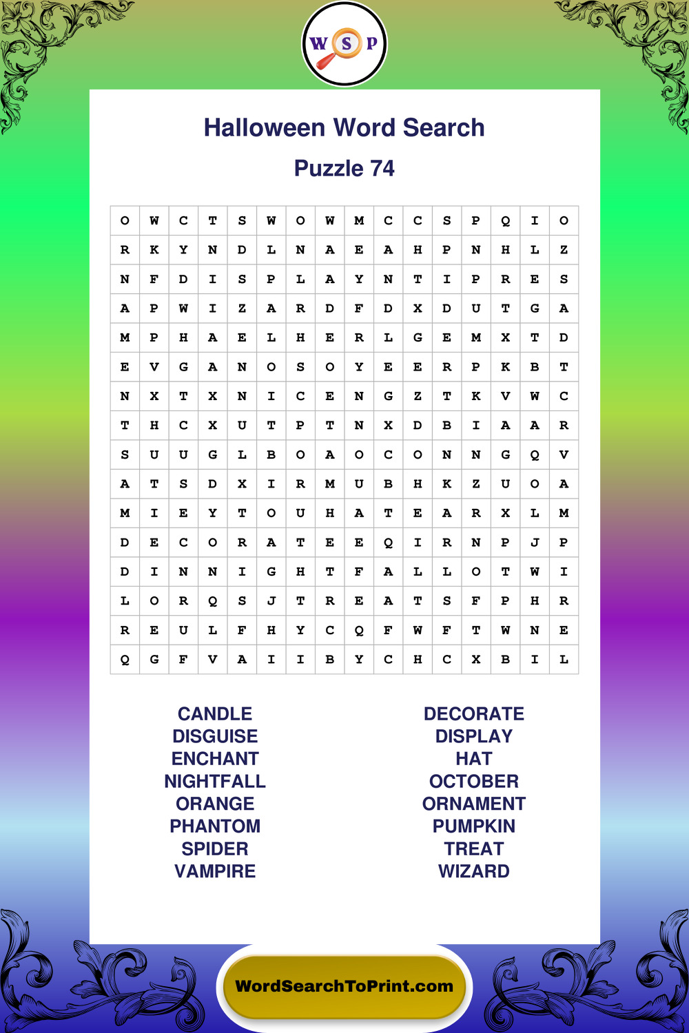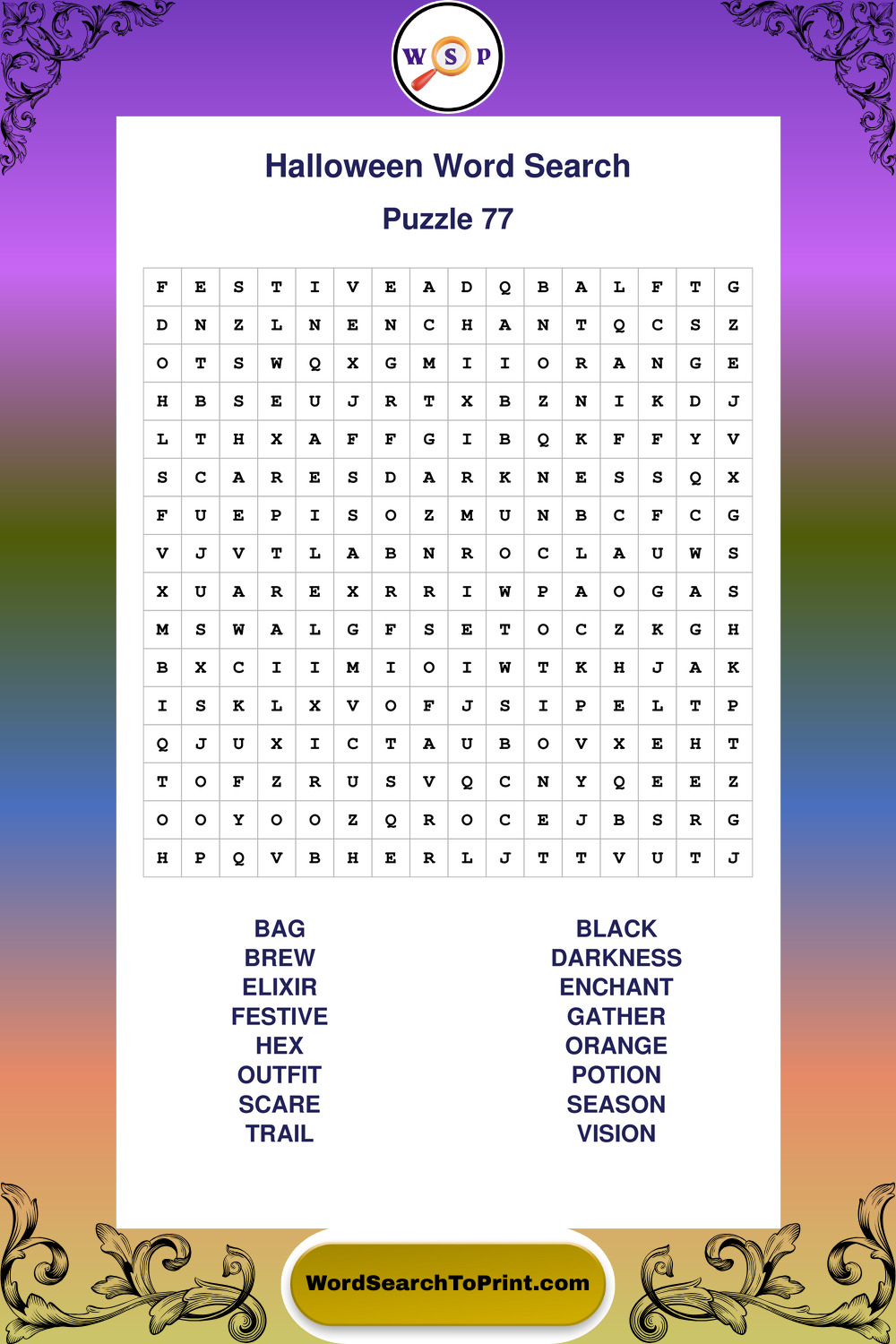 Browse large print Halloween wordsearches created to support clear vision, steady concentration, and relaxed solving.