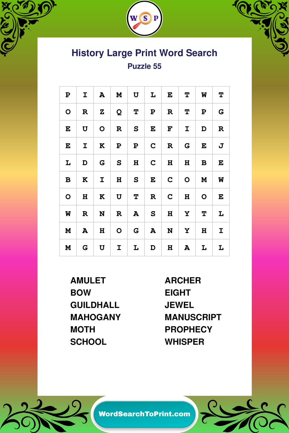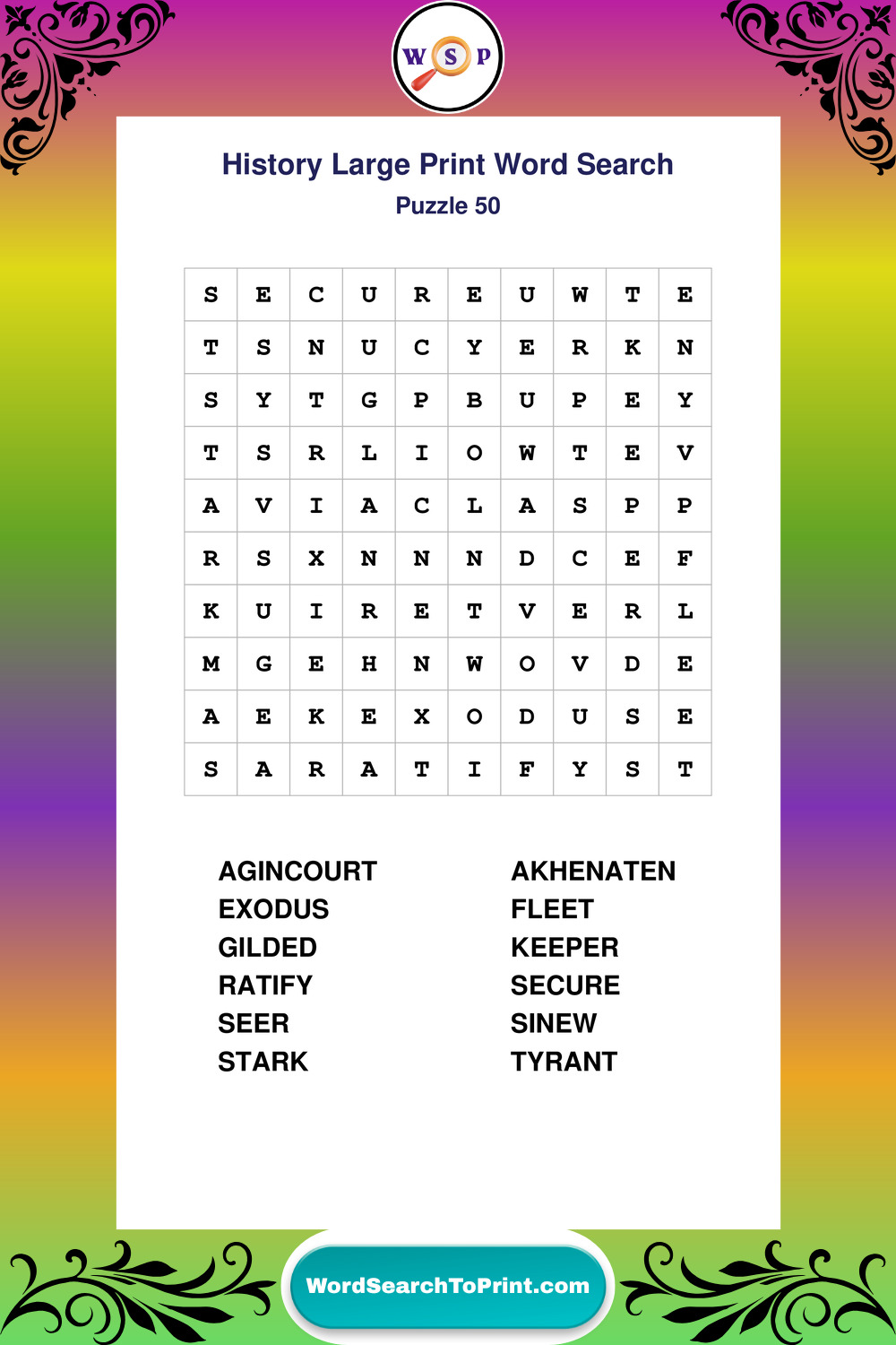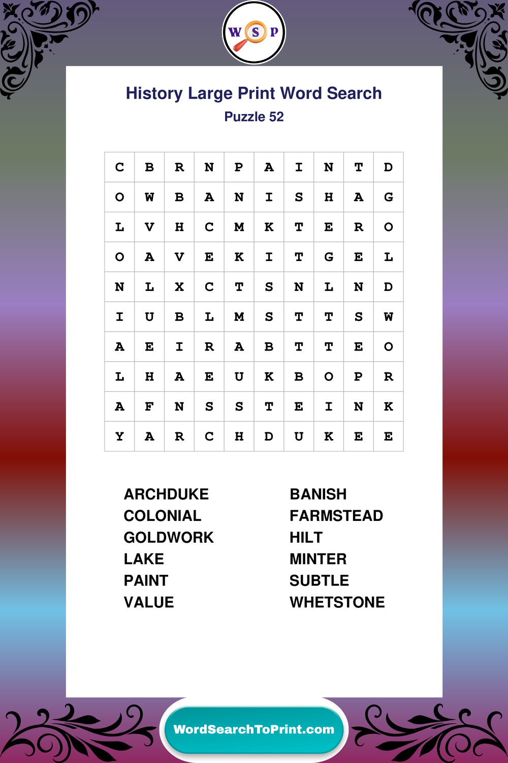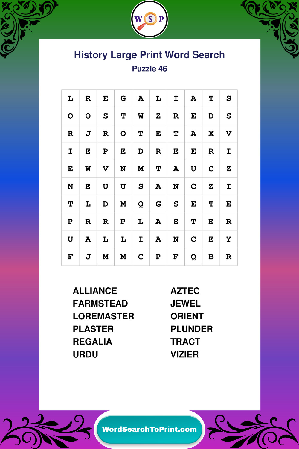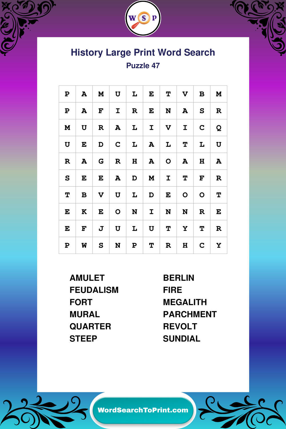 Dive into world History with clear, accessible Large Print History Wordsearches. A fun way to explore the past through relaxing, educational puzzles.