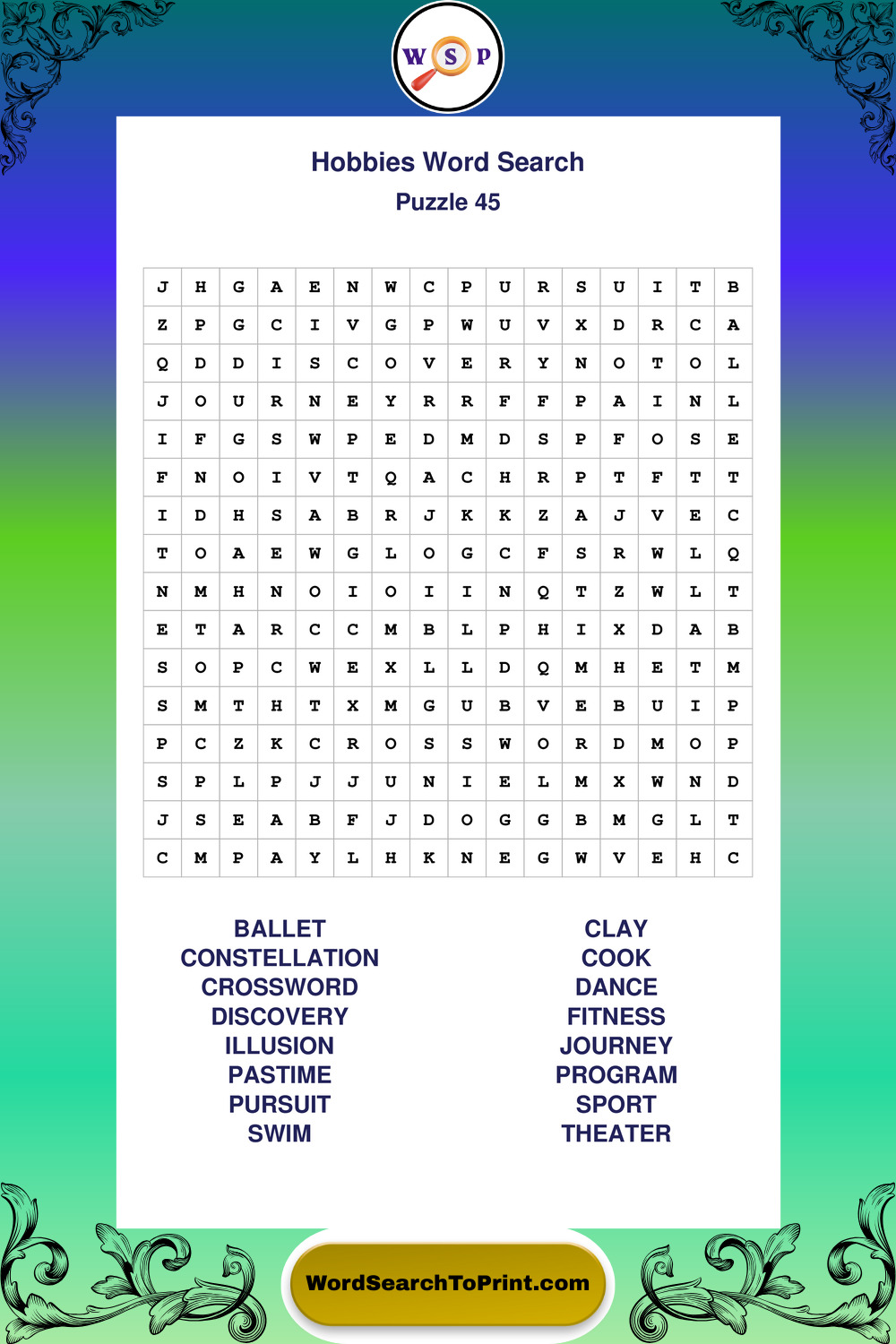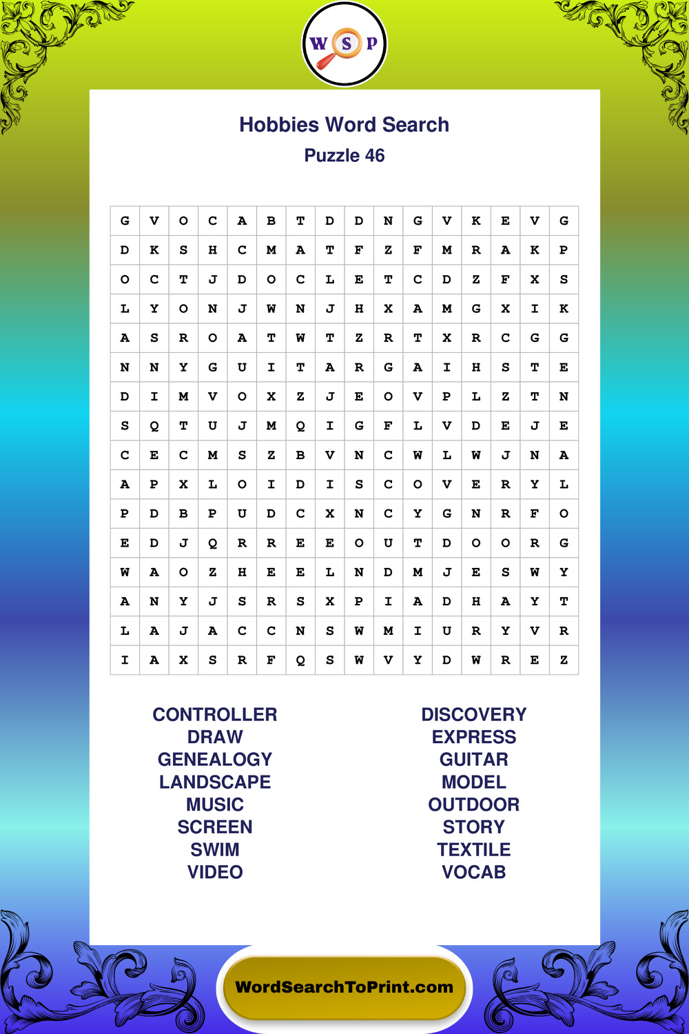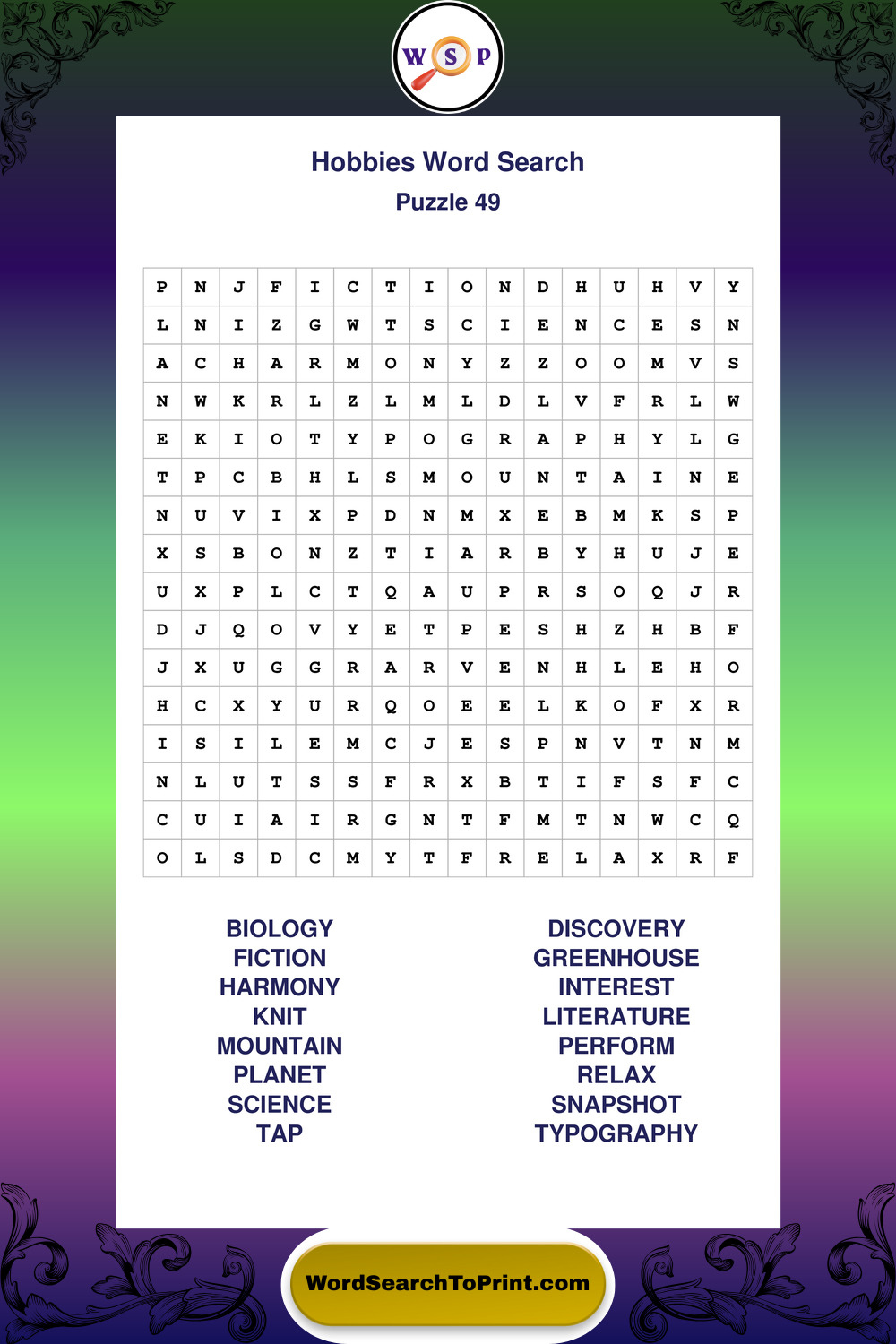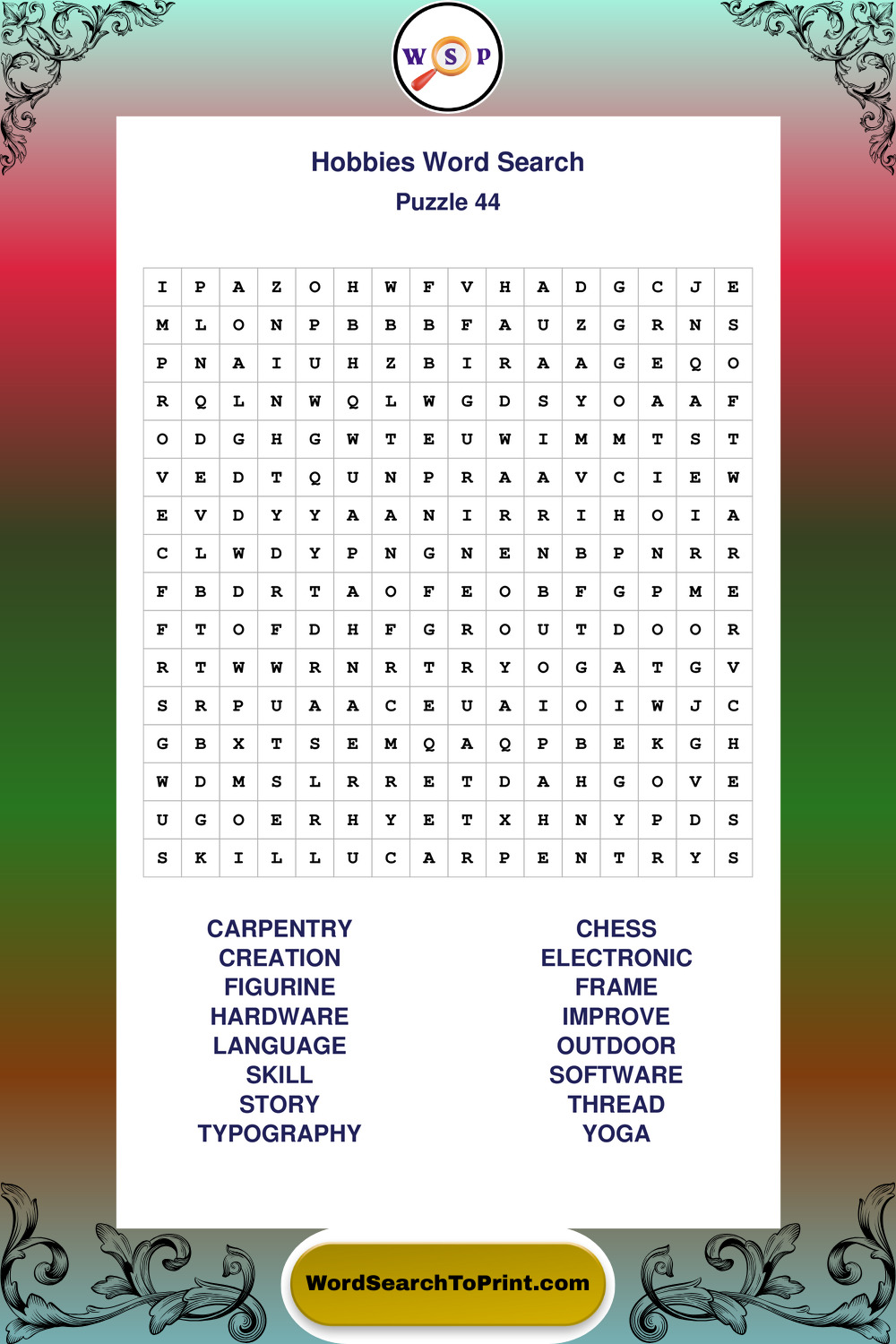Printable Hobbies Wordsearch Puzzles