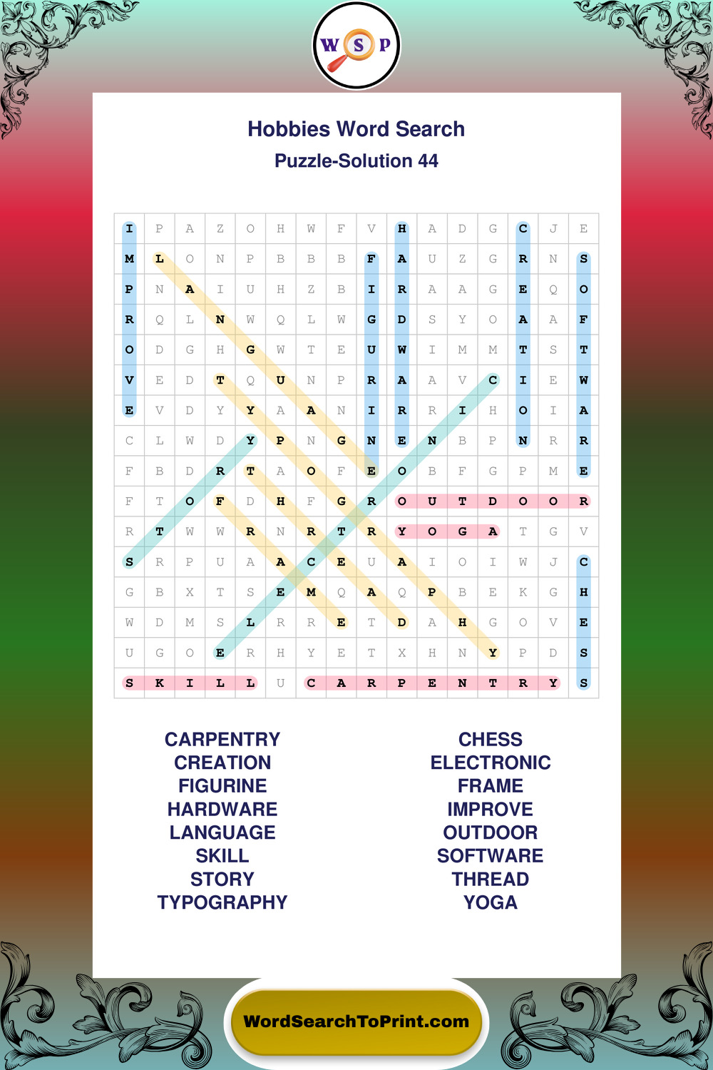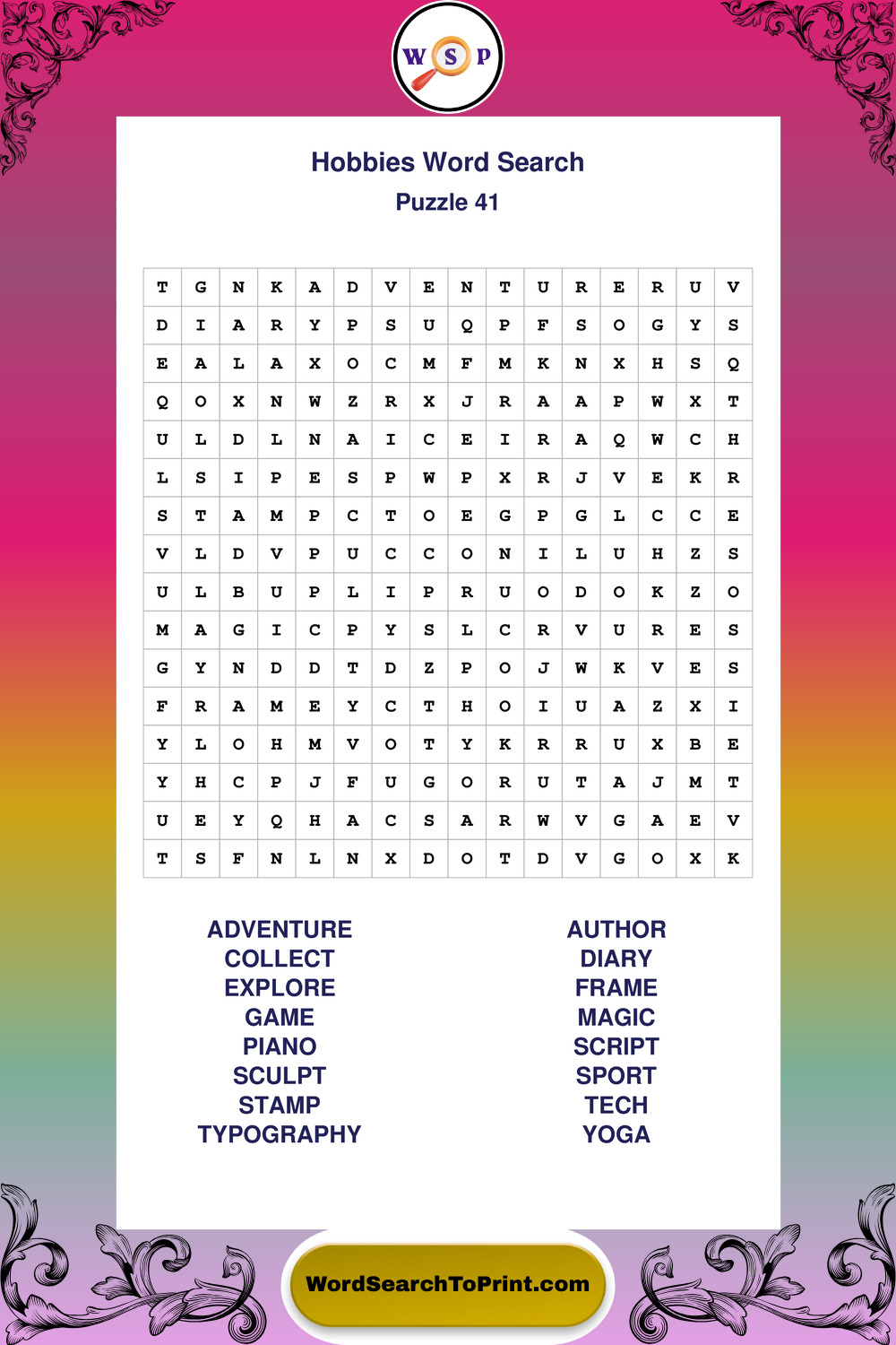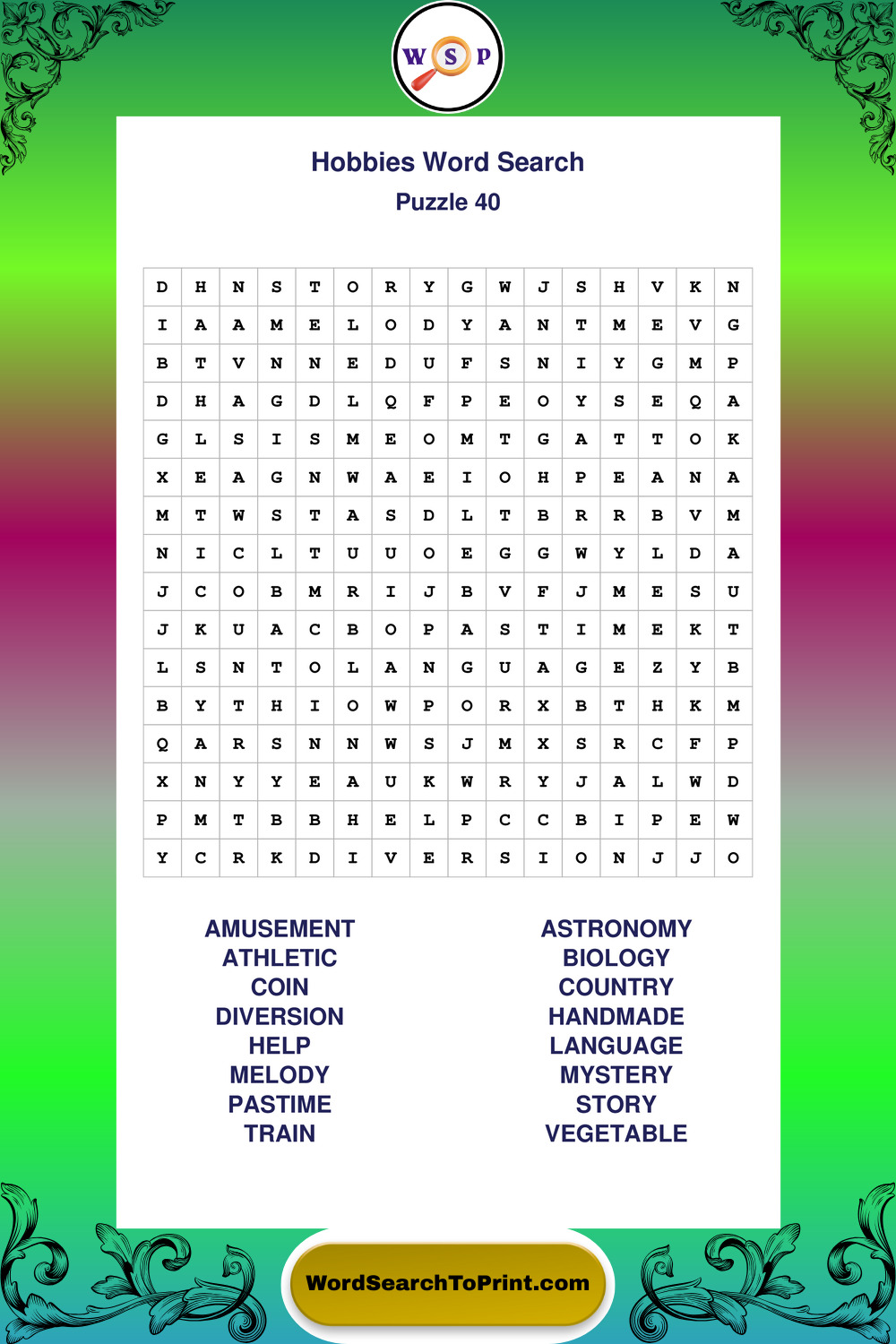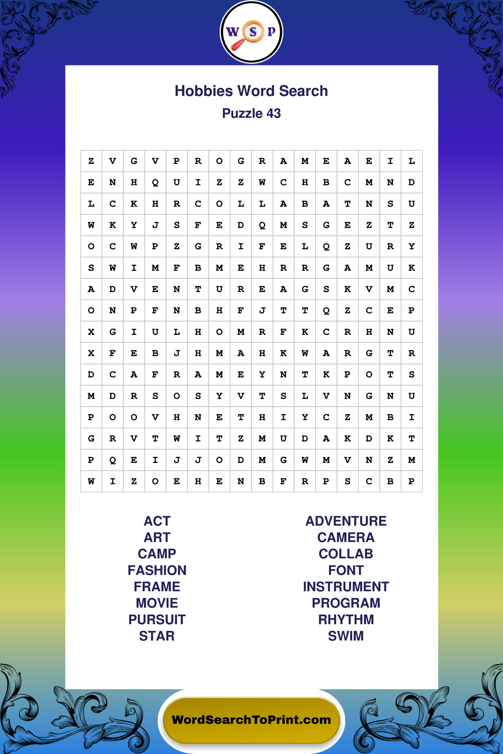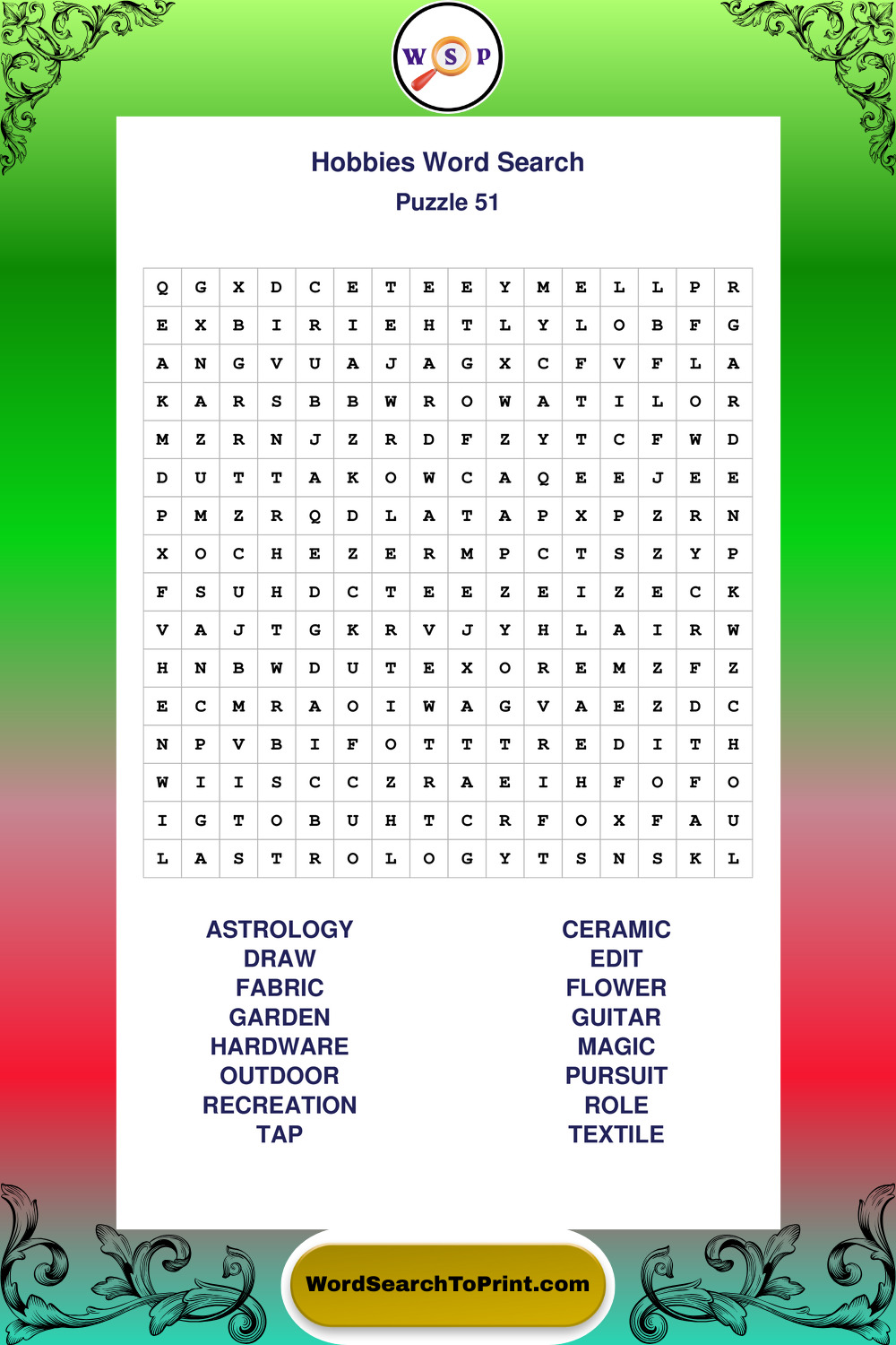 Printable Hobbies Wordsearch Puzzles
